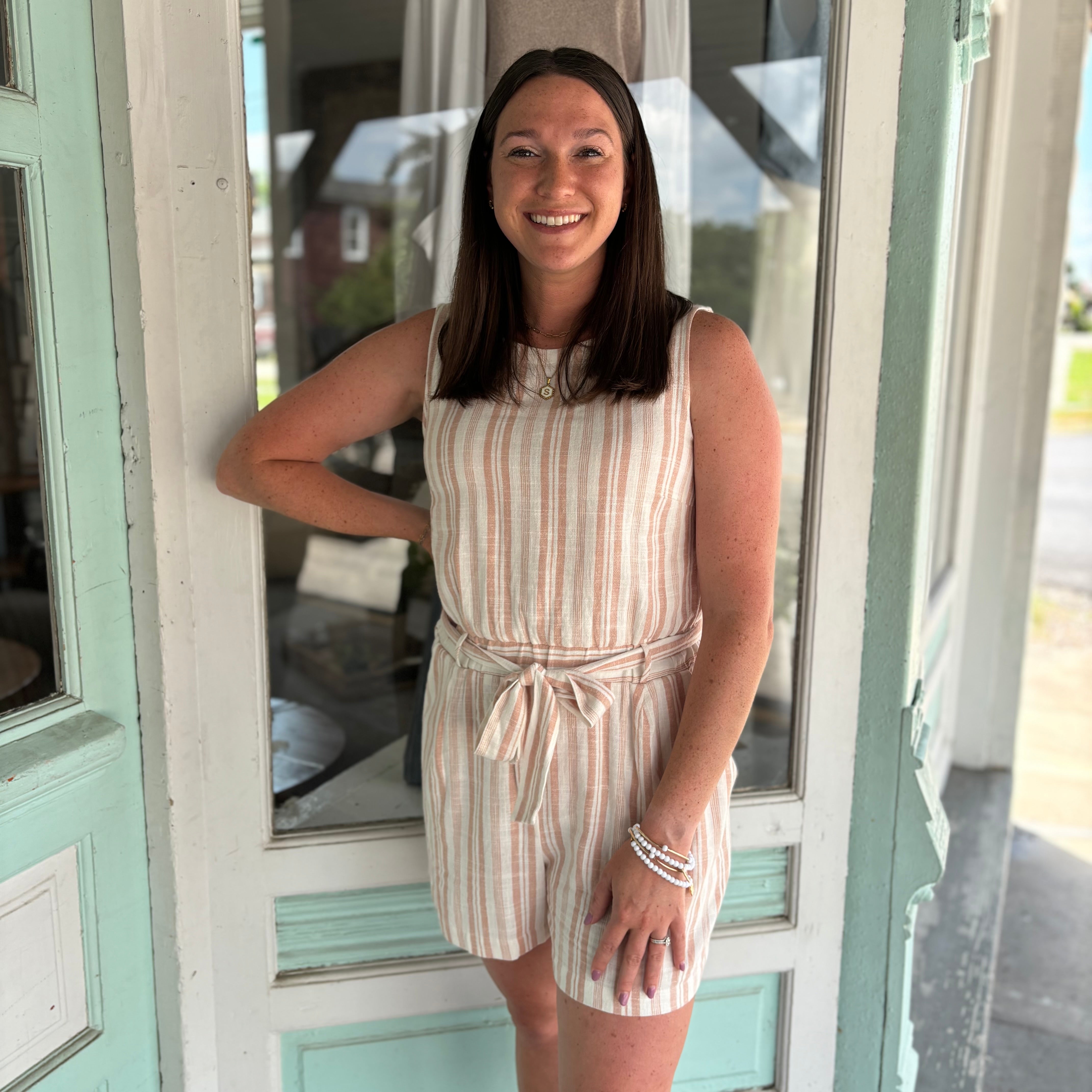 Linen Blend Striped Romper | Sandstone