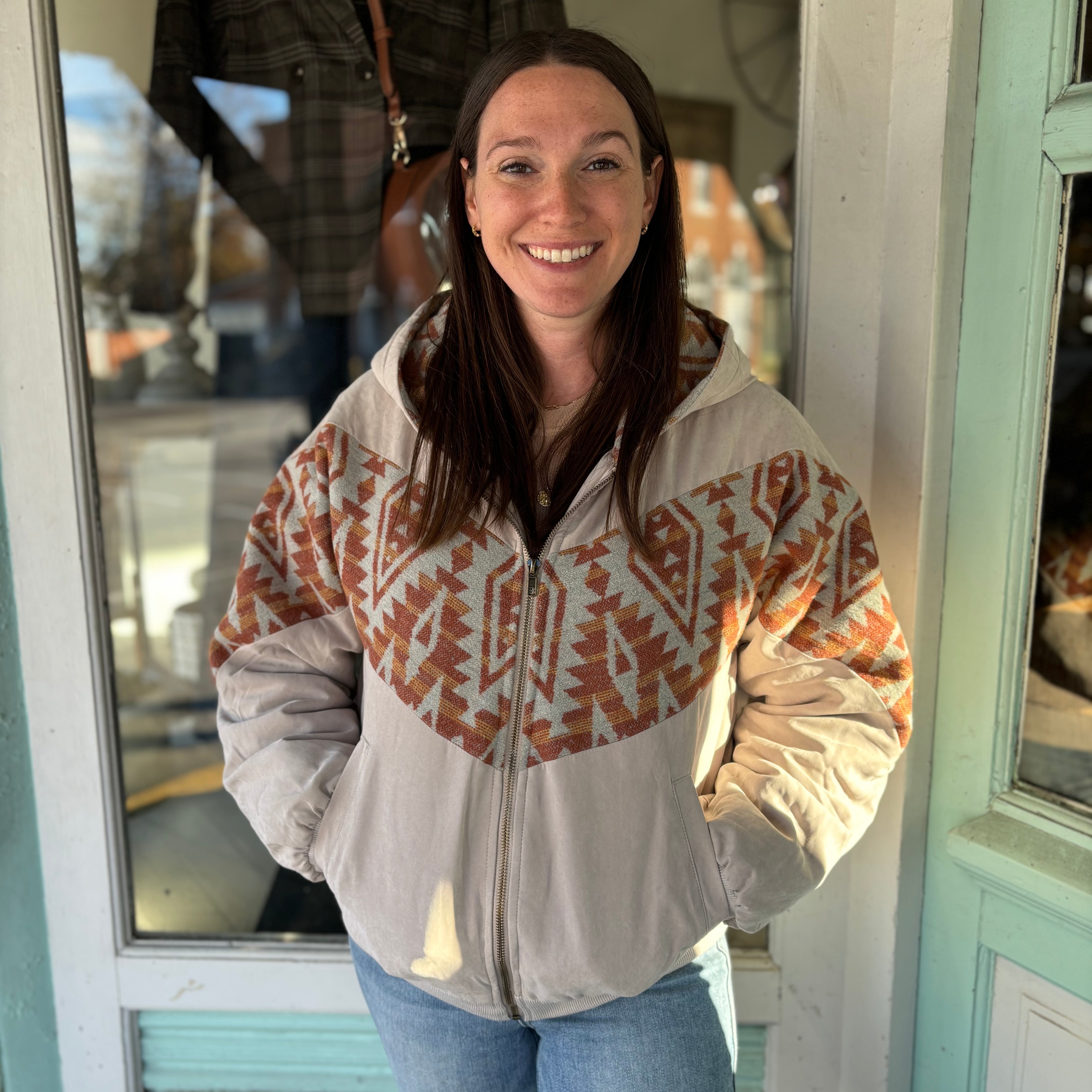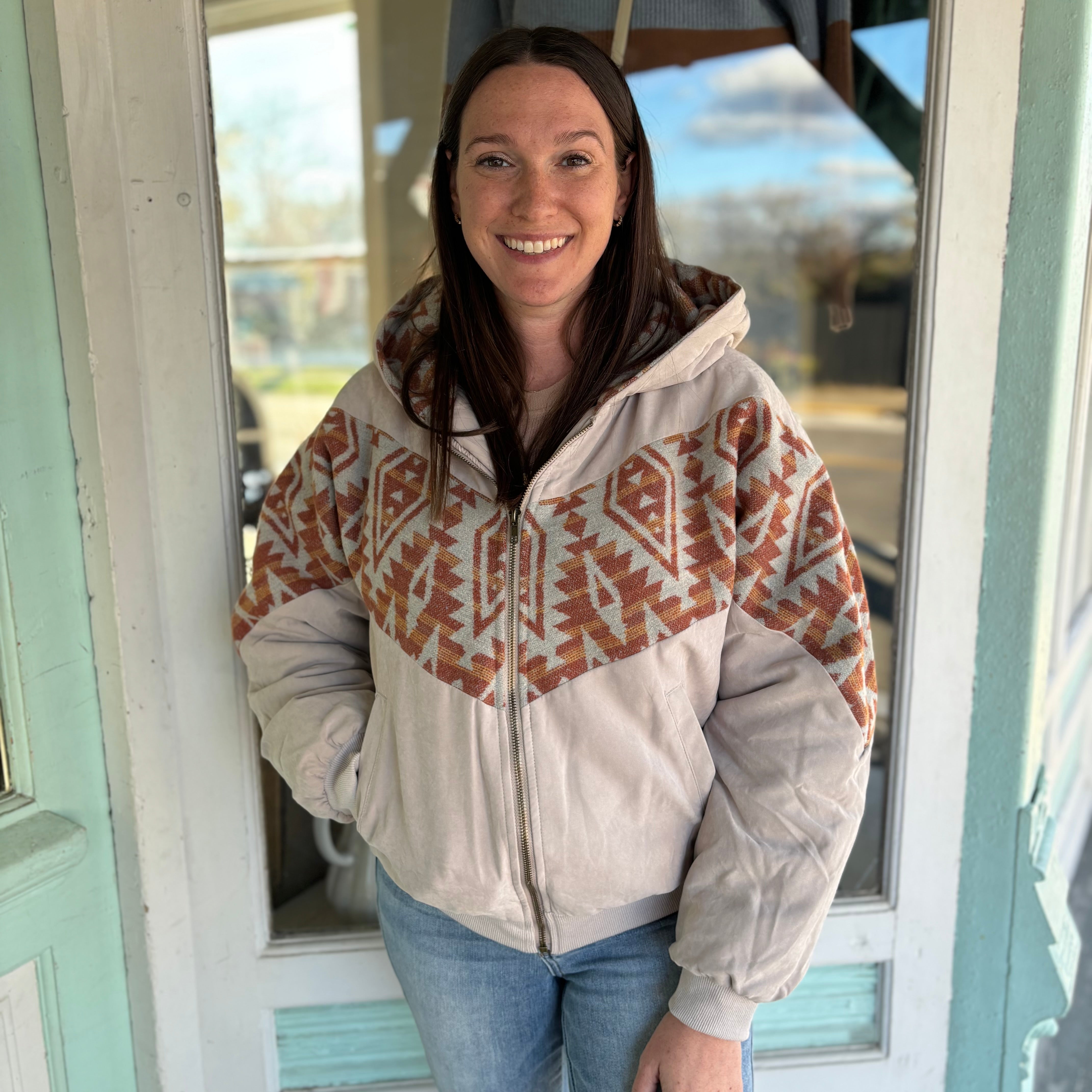 Stay warm and stylish with our Hoodie Aztec Jumper in a trendy grey color. This playful design features a contrasted aztec pattern on the hood, adding a fun twist to your outfit. Perfect for a cozy night in or a casual day out. (