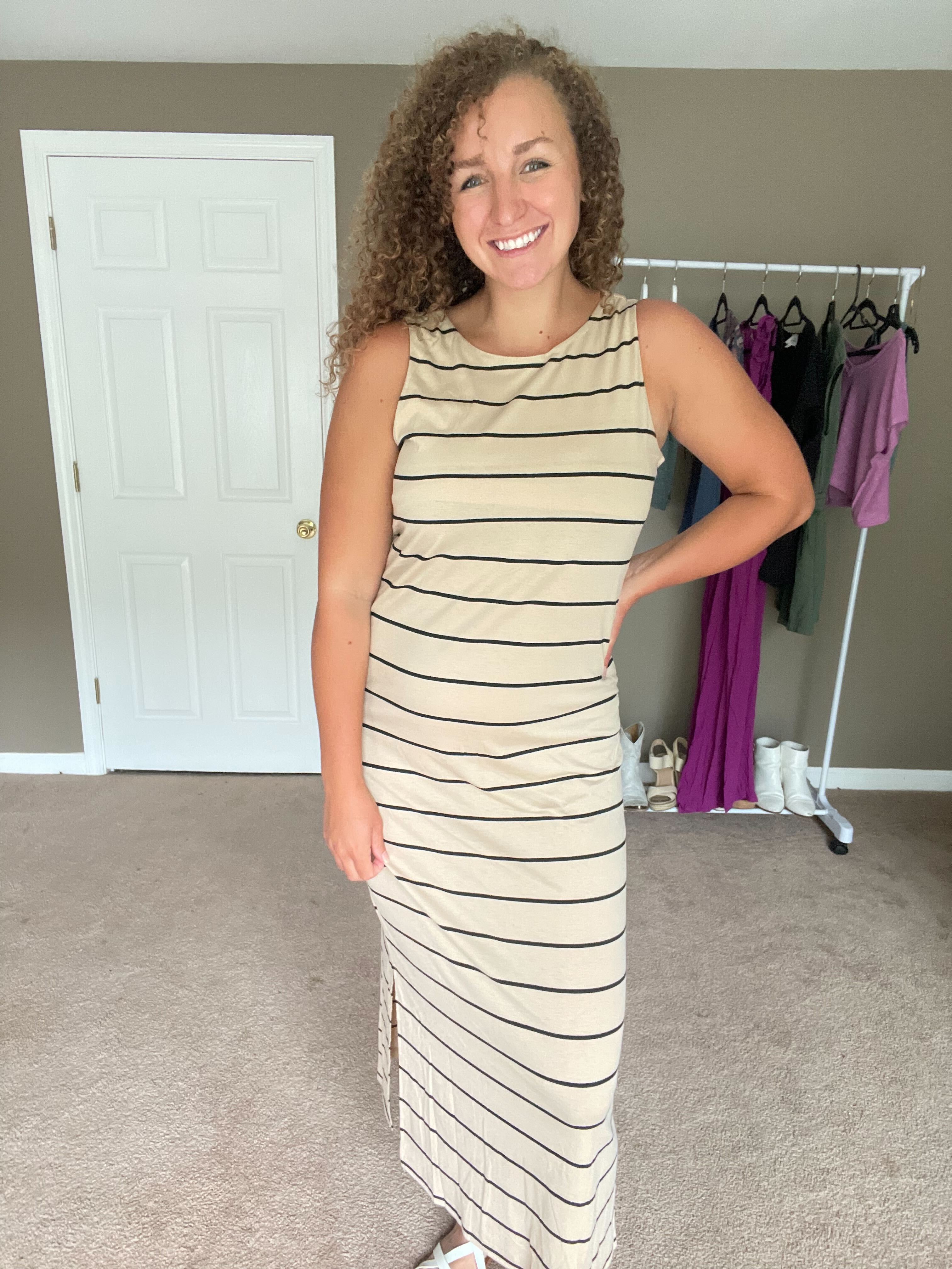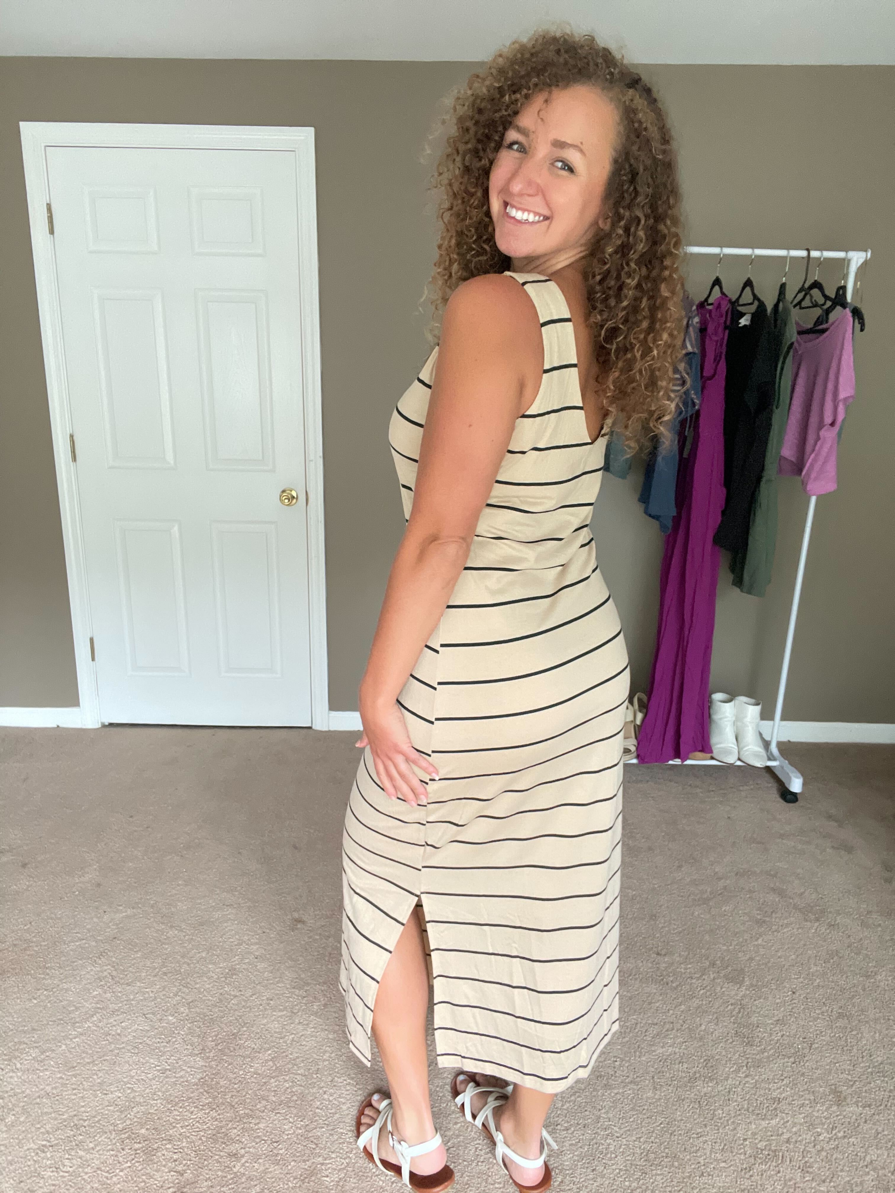 • Say hello to the Striped Sleeveless Maxi, a dress with mid-weight jersey knit and a scooped neckline that won't suffocate you