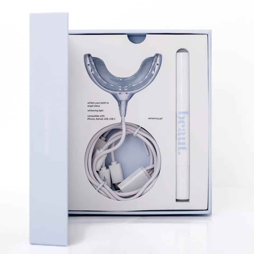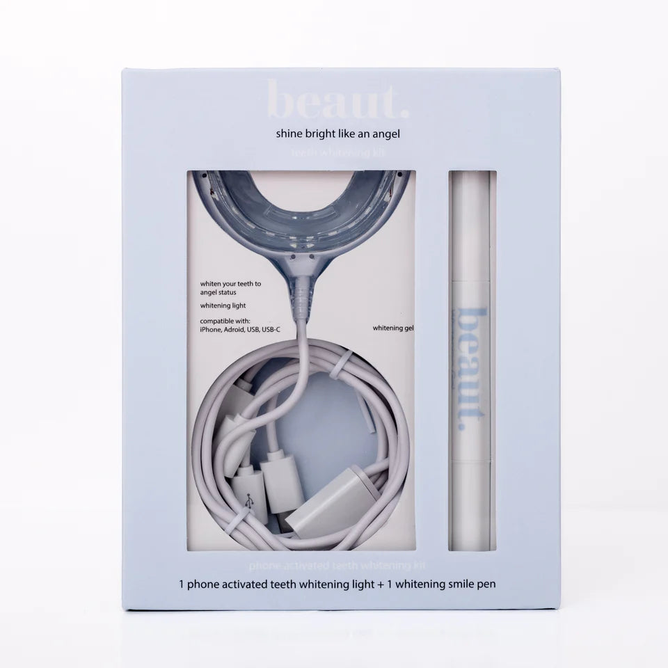 - What: This kit is phone activated and features blue light therapy. On average each 15 minute session whitens your teeth 2-3 shades lighter