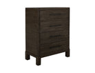 4 Drawer Chest. The Merida Collection features an exquisite bedroom set that perfectly fuses sustainability and design, embodying eclectic modern style. Made from environmentally friendly mango and melina wood, it combines beauty and functionality to enhance your space. The black finish highlights the natural elegance of the wood, creating a serene and inviting atmosphere. The chest features a minimalist design characterized by clean lines and a rectangular shape; it not only offers practical storage solutions but also enhances the aesthetic appeal of your bedroom with its timeless charm. The chest stands on four sturdy legs, ensuring stability and durability. The Merida chest is a versatile addition that complements any bedroom décor.