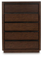 Casual contemporary styling with a decidedly modern vibe. This chest of drawers is warm and inviting with a rich dark brown finish, adorning your restful retreat with on-trend elegance. Full-length metal pulls in a matte black finish add a subtly cool touch to spacious storage drawers. What a simply stunning way to achieve the bedroom of your dreams.