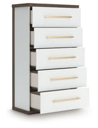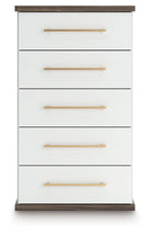 Looking to make a subtly striking statement in your bedroom? We've got you covered. This chest of drawers' sophisticated two-tone treatment marries a warm brown finish over replicated walnut grain with a matte white finish. Rounded corners and a thick top radiate an air of modern panache, while sleek handles in a champagne finish add a sparkling touch to the spacious drawers. It’s a master class in contemporary yet comfortable character.
