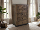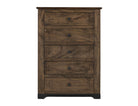 5 Drawer, Chest. The exceptional Parota III Bedroom Collection showcases the beauty of Parota wood, native to Mexico and South America, It features panels and tops crafted from this stunning wood, incorporating butterfly joints between slabs combined with sustainable mango wood for the rest of the case piece. The translucent multi-step lacquer in brown allows the natural grain of the Parota wood to shine through beautifully. The collection also includes hand-forged iron details on the headboard and mirror, giving each piece a distinctive look. Additionally, the drawer fronts are adorned with decorative nails arranged in two vertical lines on either side of the knob handles. Elevate your bedroom with the unique charm and sustainable craftsmanship of the Parota III Bedroom Collection, where exquisite design meets eco-friendly elegance.