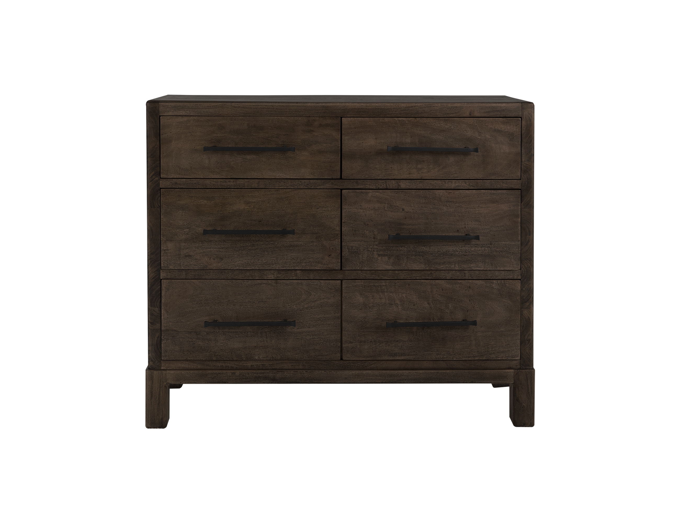 6 Drawer Dresser. The Merida Collection features an exquisite bedroom set that perfectly fuses sustainability and design, embodying eclectic modern style. Made from environmentally friendly mango and melina wood, it combines beauty and functionality to enhance your space. The black finish highlights the natural elegance of the wood, creating a serene and inviting atmosphere. The dresser features a minimalist design characterized by clean lines and a rectangular shape; it not only offers practical storage solutions but also enhances the aesthetic appeal of your bedroom with its timeless charm. The dresser stands on four sturdy legs, ensuring stability and durability. The Merida dresser is a versatile addition that complements any bedroom décor
