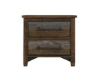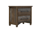 2 Drawer, Nightstand. Elevate your bedroom environment with the Town collection, a beautiful blend of rustic style and modern sophistication. Each piece features a multi-step lacquer finish that highlights rich brown and gray tones, enhancing the wood's natural beauty. Crafted from pine and poplar, this collection boasts a wire-brushed wood texture for added character. This beautifully designed bedroom set will transform your space and leave a lasting impression. make The nightstand offers ample storage with two spacious drawers. Iron center handle pulls add an industrial touch, beautifully contrasting with the warm design.