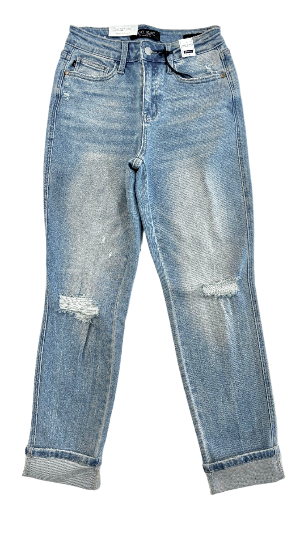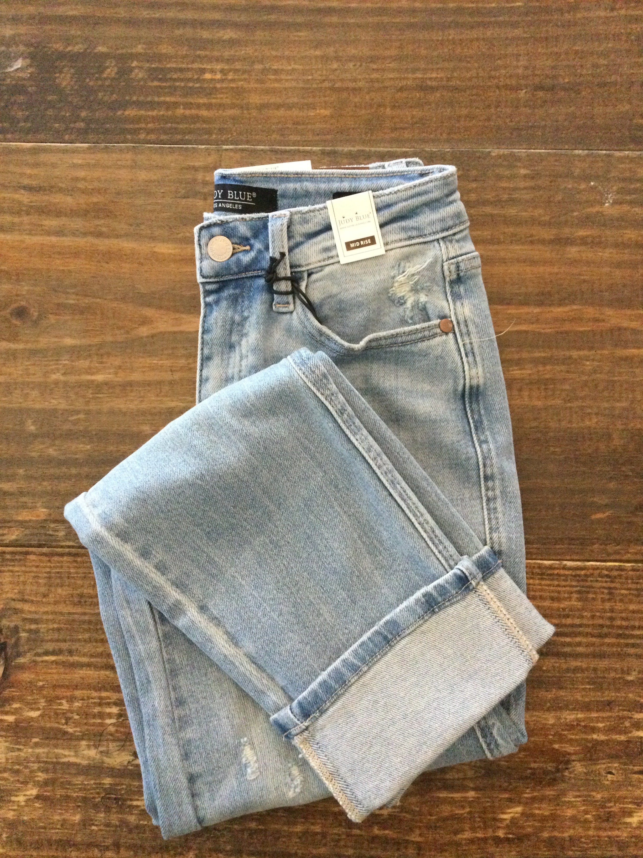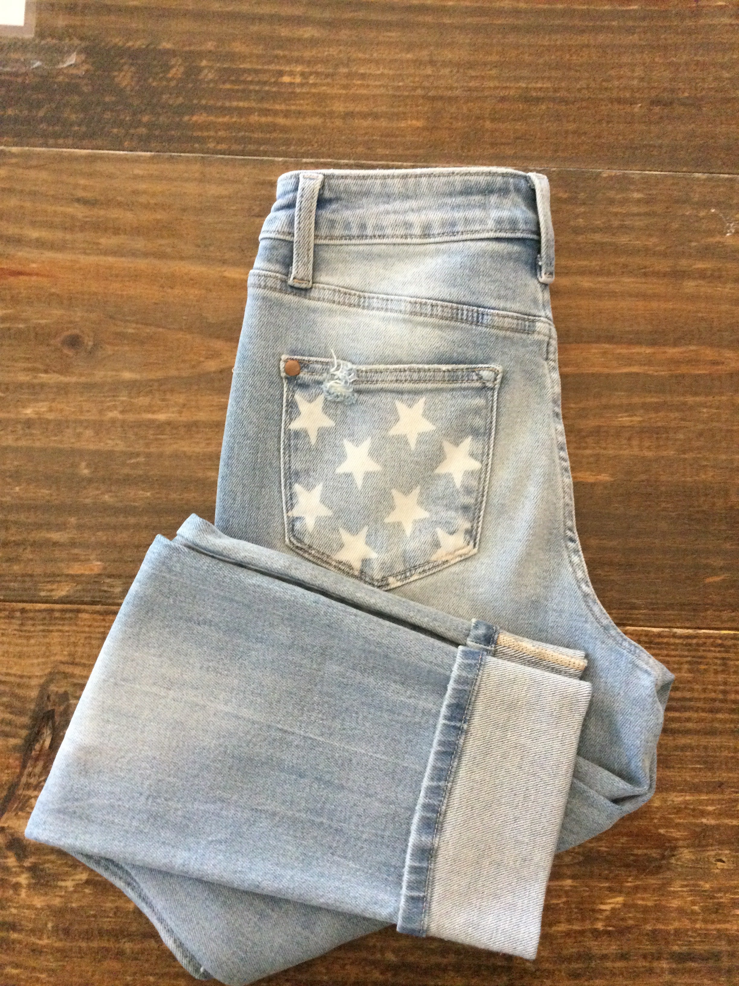 - With a mid rise, star back pocket, and cuffed leg, these light wash jeans are perfect for any casual occasion or holiday celebration