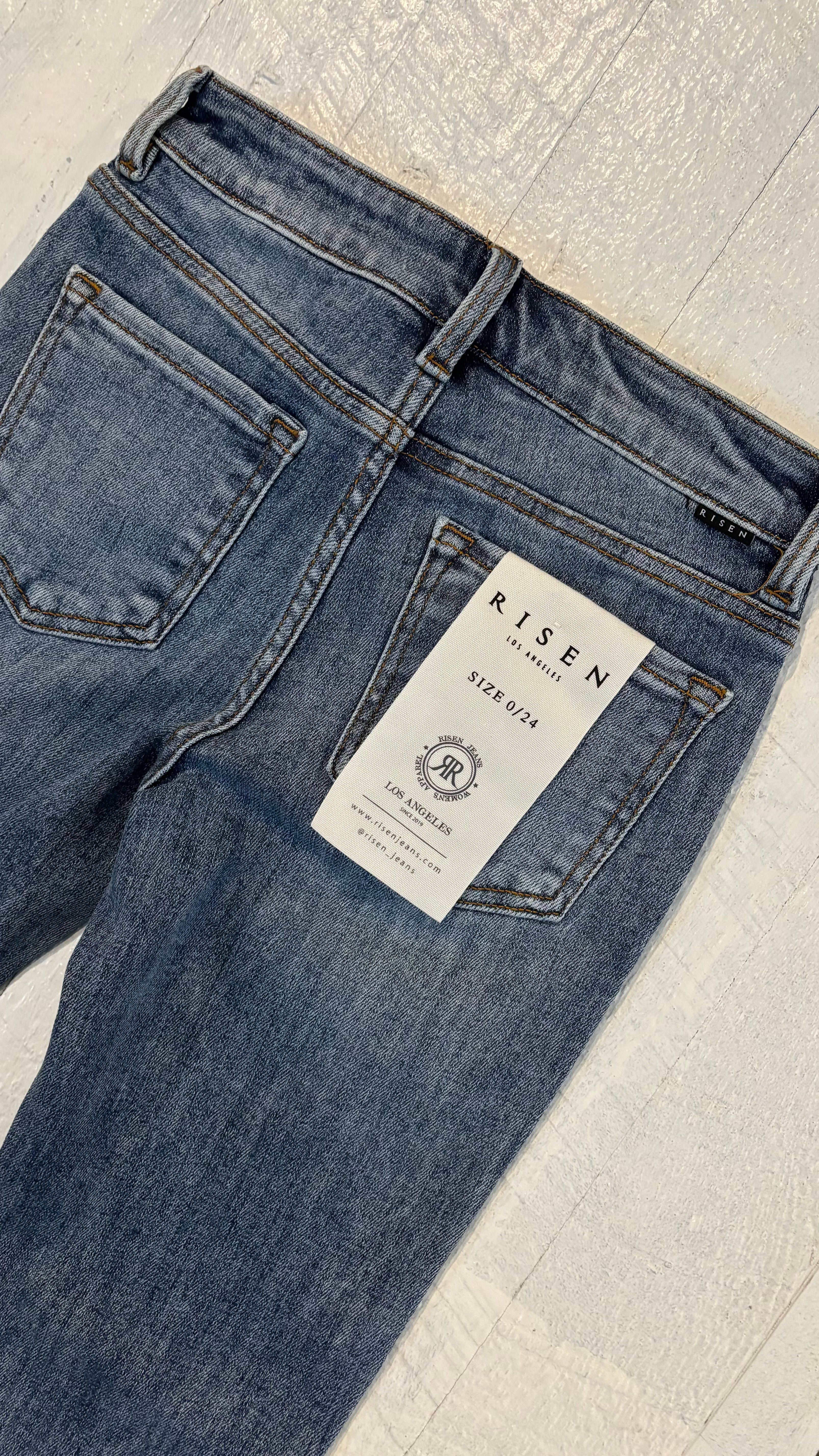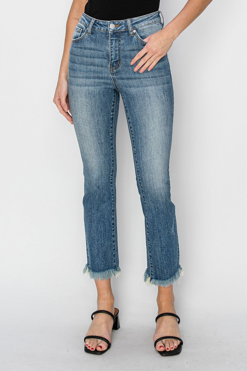 Risen Mid-Rise Fray Hem Straight Leg Jeans