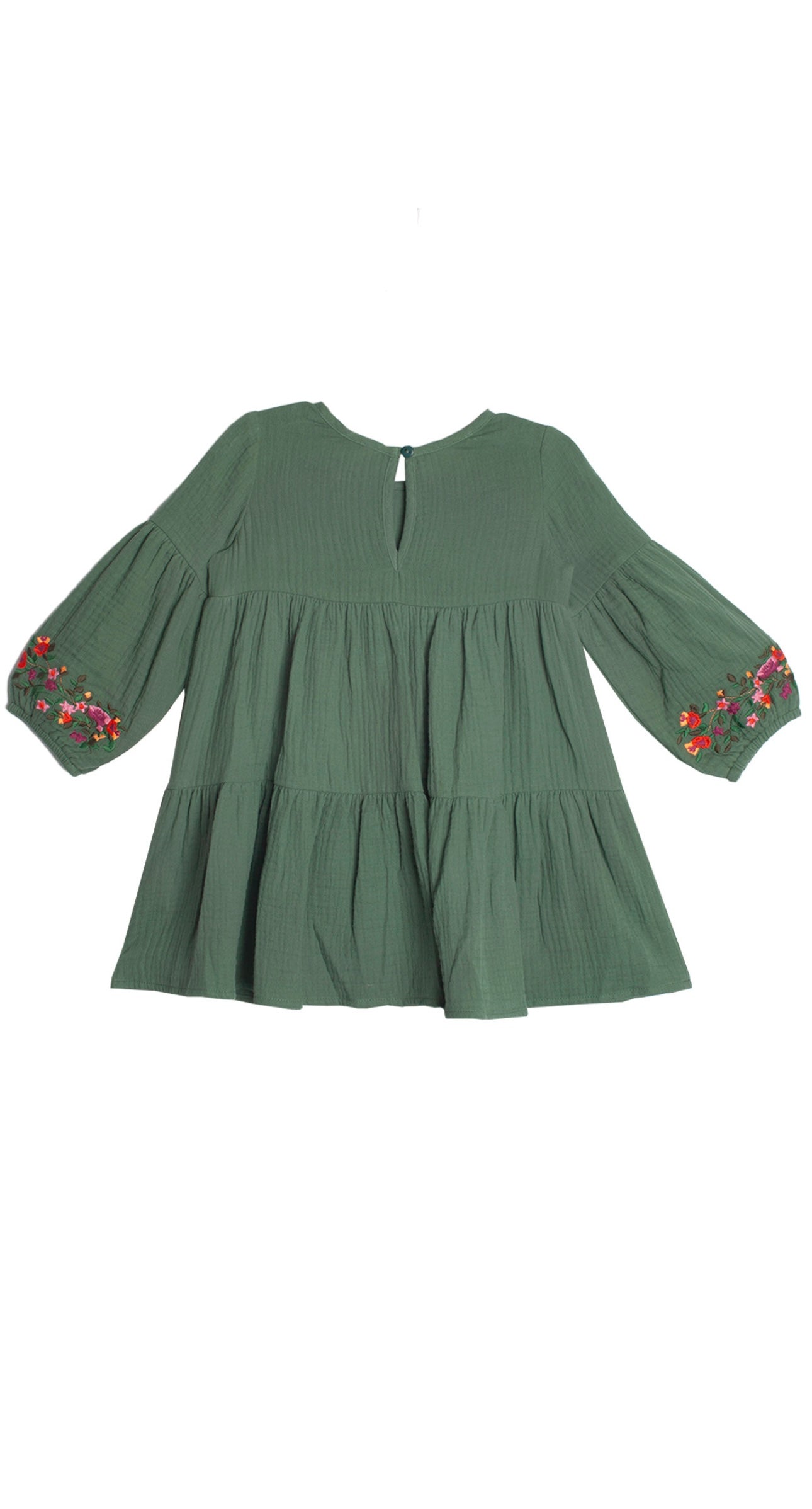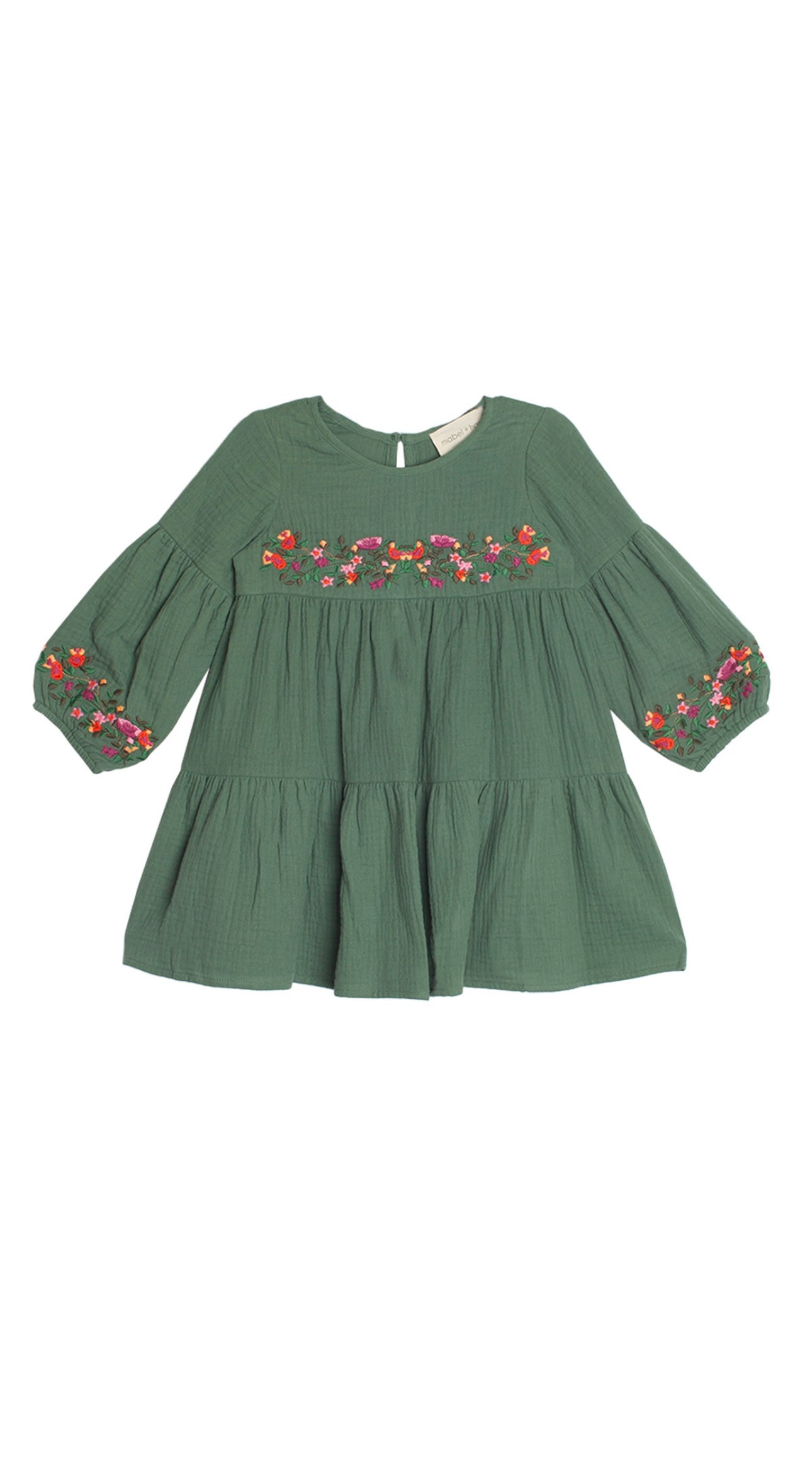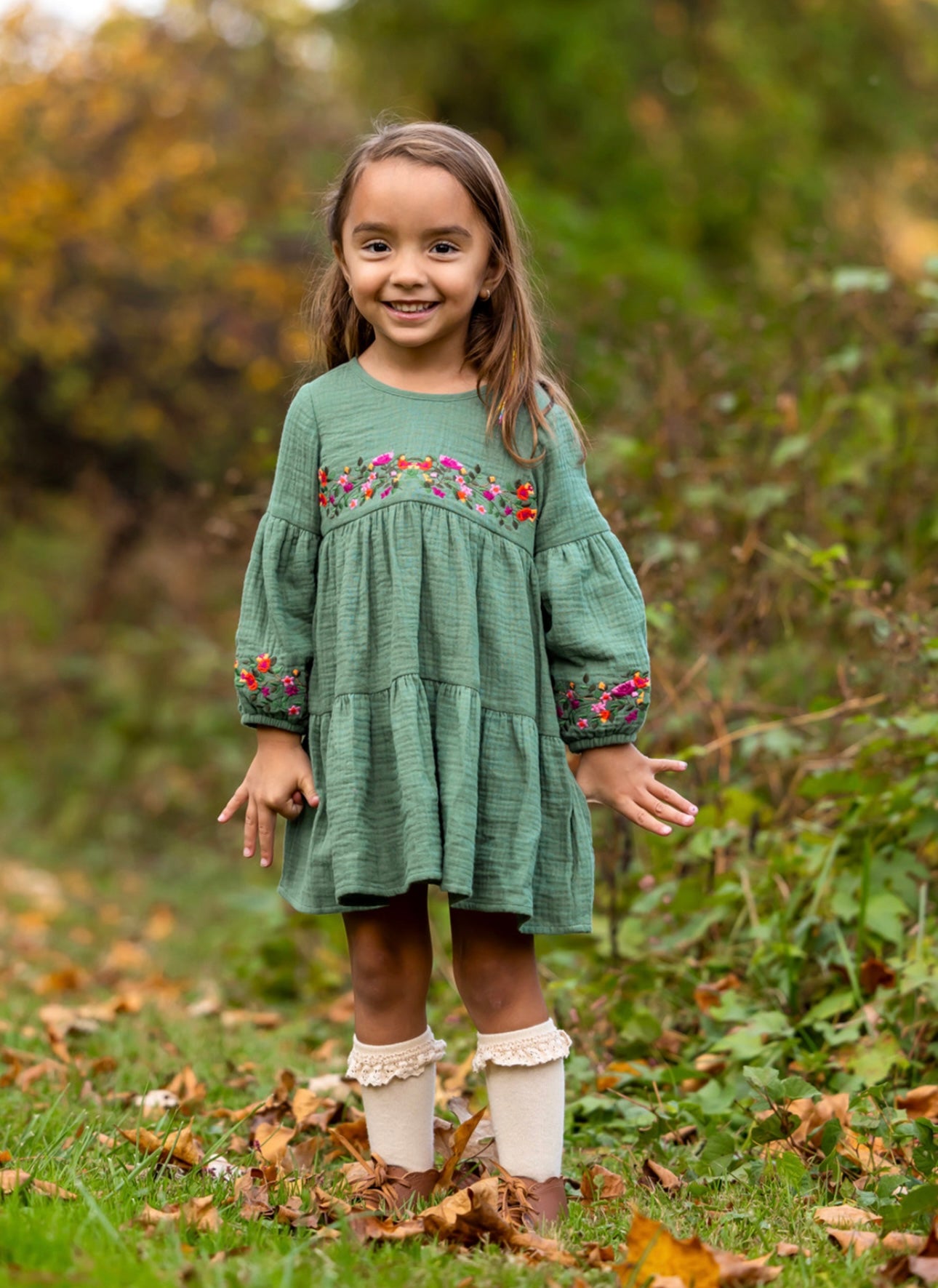 Get ready to make a statement with our Bella Dress in Green! This long sleeve dress is made with lightweight and soft muslin material, ensuring comfort for your little one. With pretty pink floral embroidery and a playful ruffle skirt, your child will look and feel stylish in this fun and unique dress.