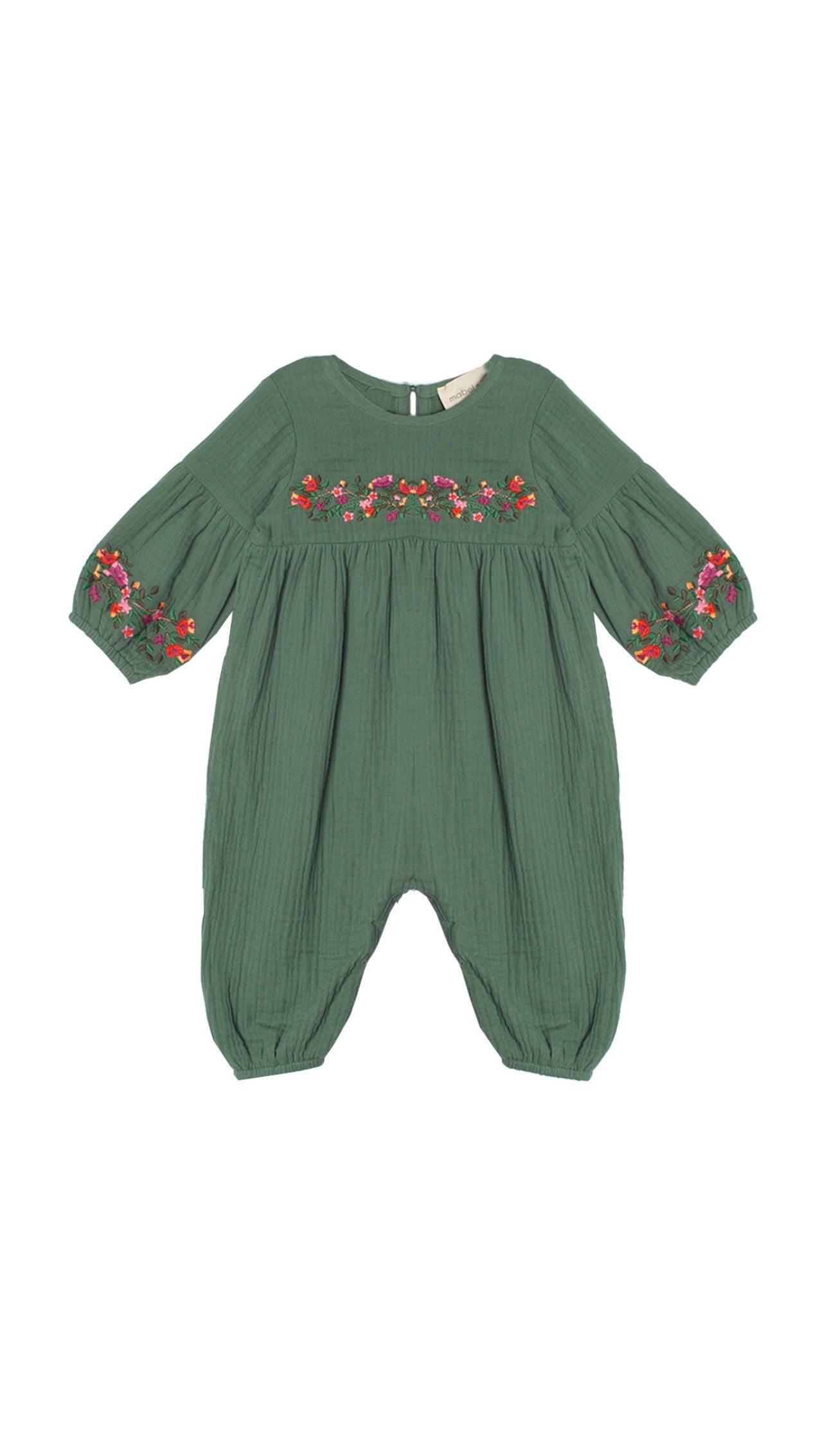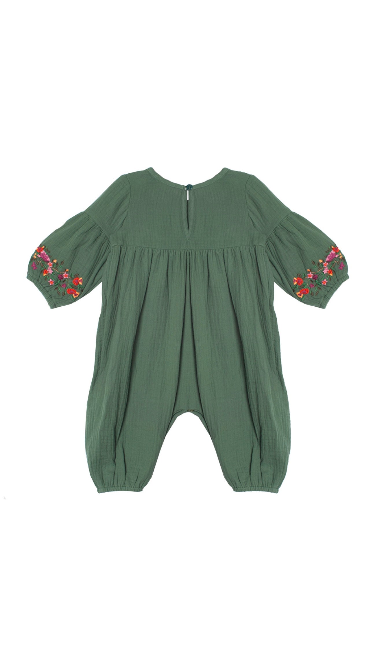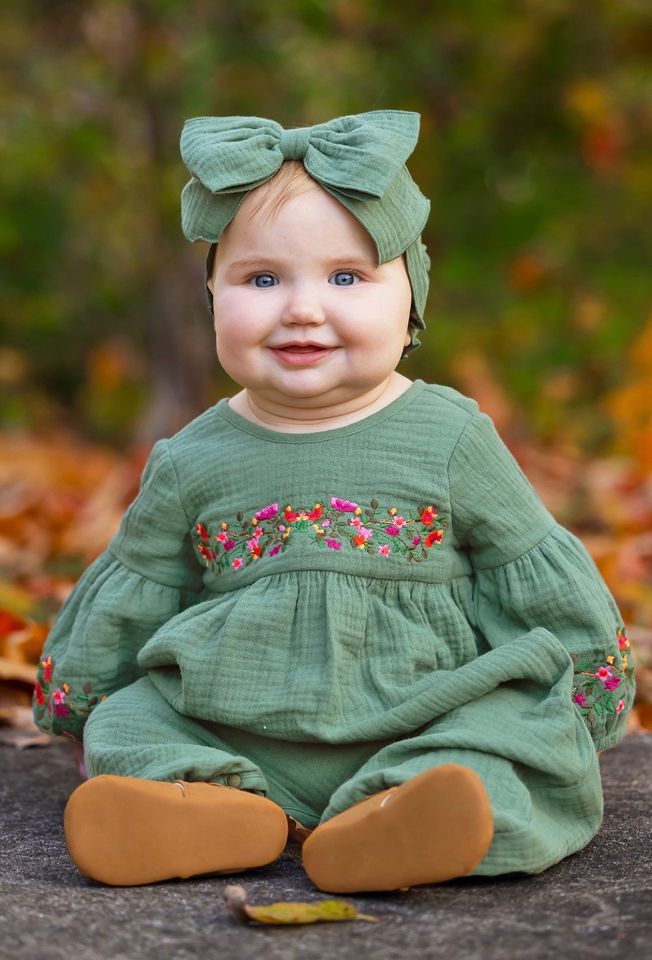 Get ready for some cuteness overload with our Bella Romper in green! Made from soft muslin material, this baby romper features delicate pink floral embroidery and a long sleeve design. With a convenient bottom snap closure, changing diapers has never been easier.