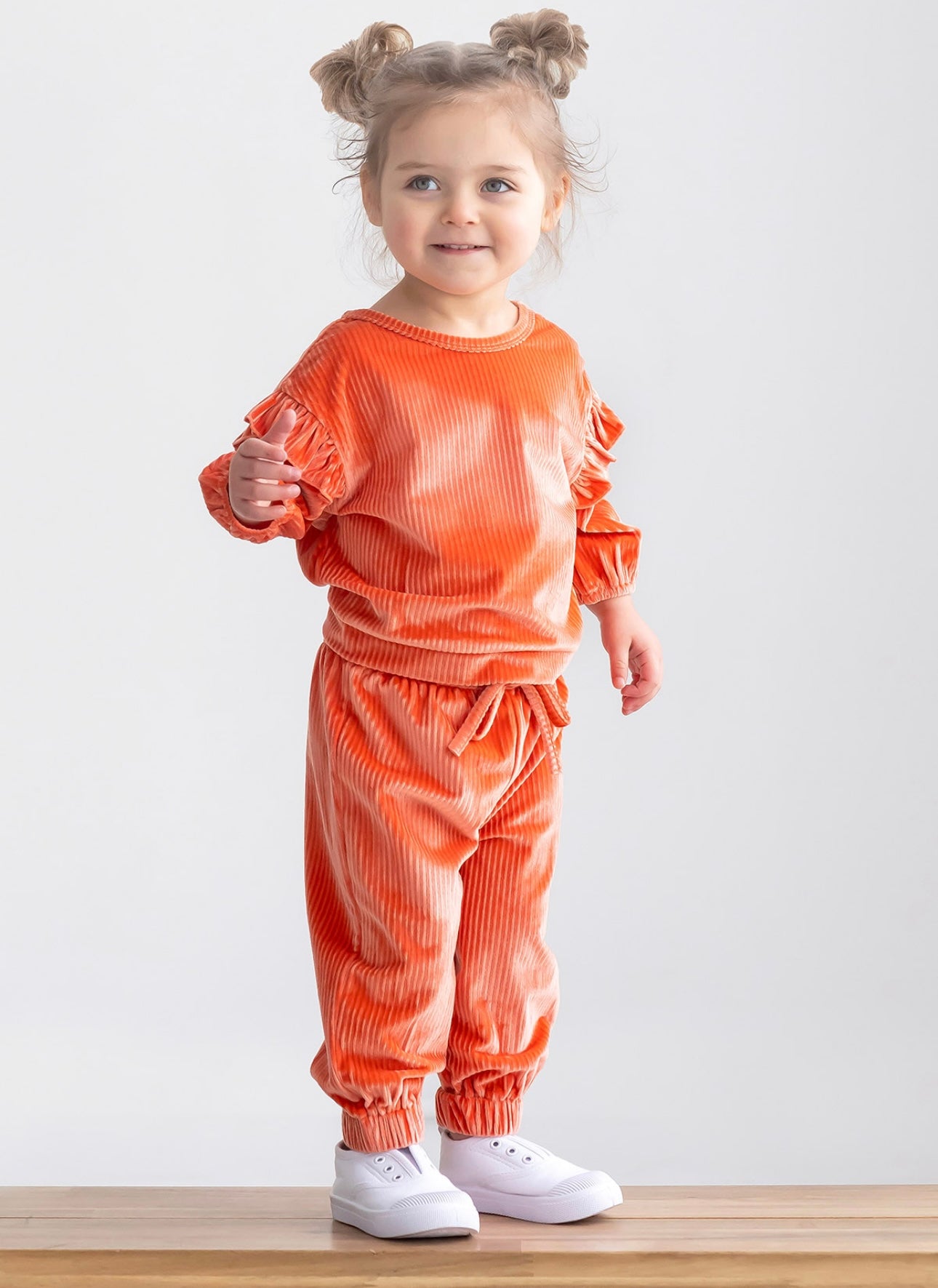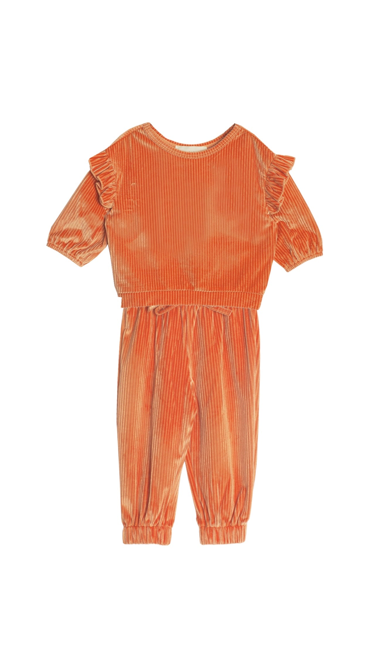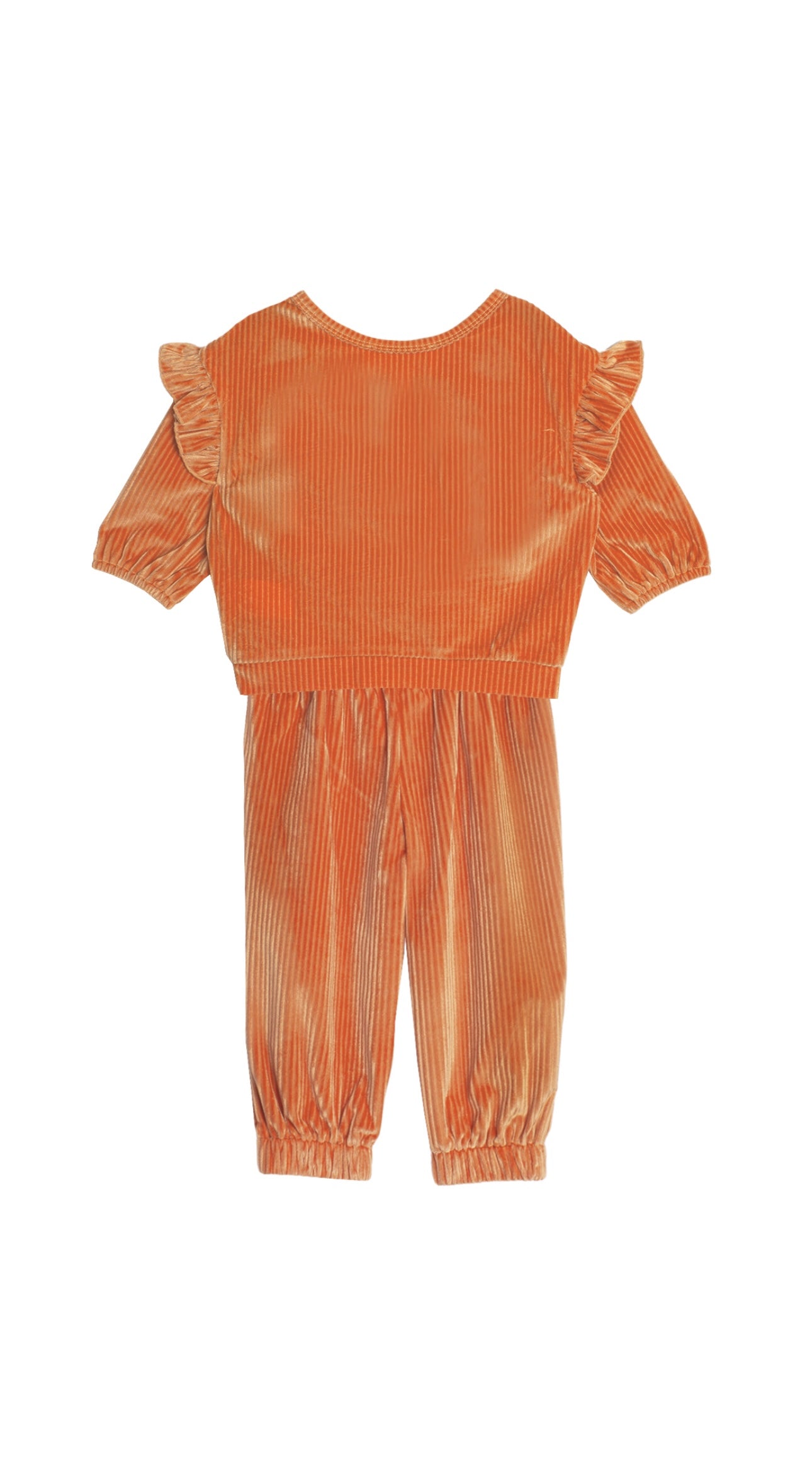 Upgrade your little girl's wardrobe with our Buttercup 2 Piece Set! Made with luxurious velvet ribbed material, this set features adorable ruffle sleeve details and is perfect for any occasion. Say hello to comfort and style with this girls pant set in vibrant orange. Time to add a pop of color to her outfits!