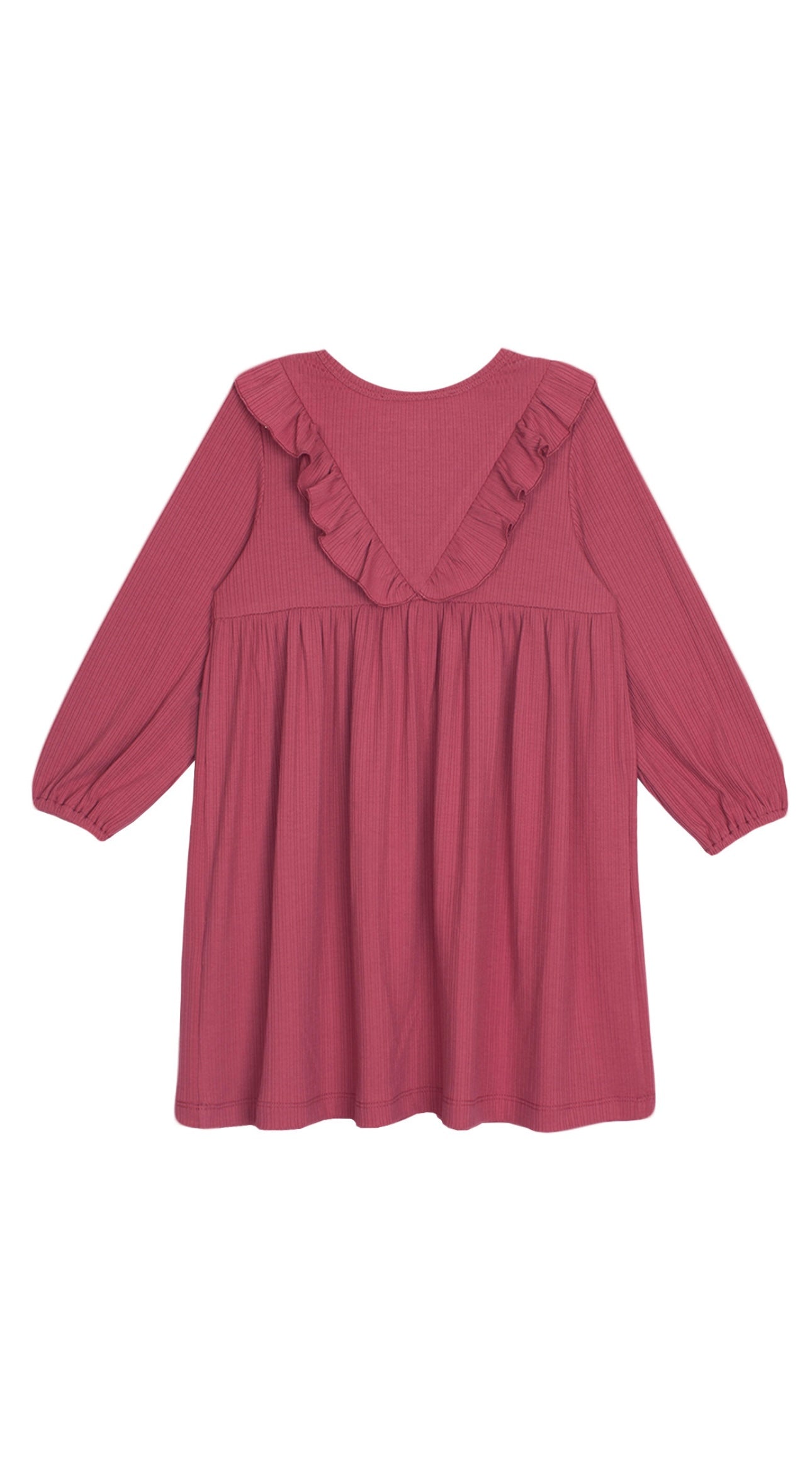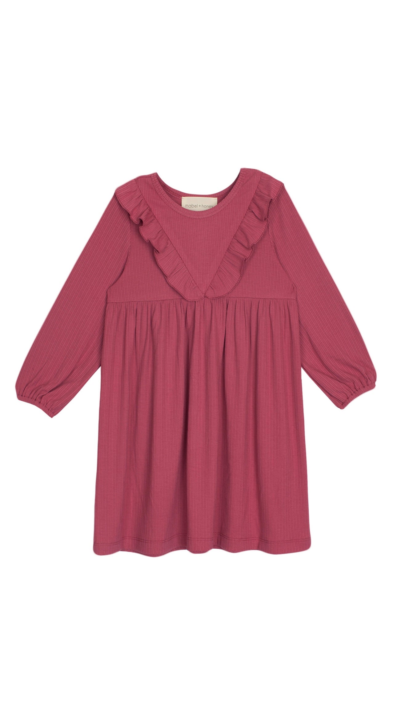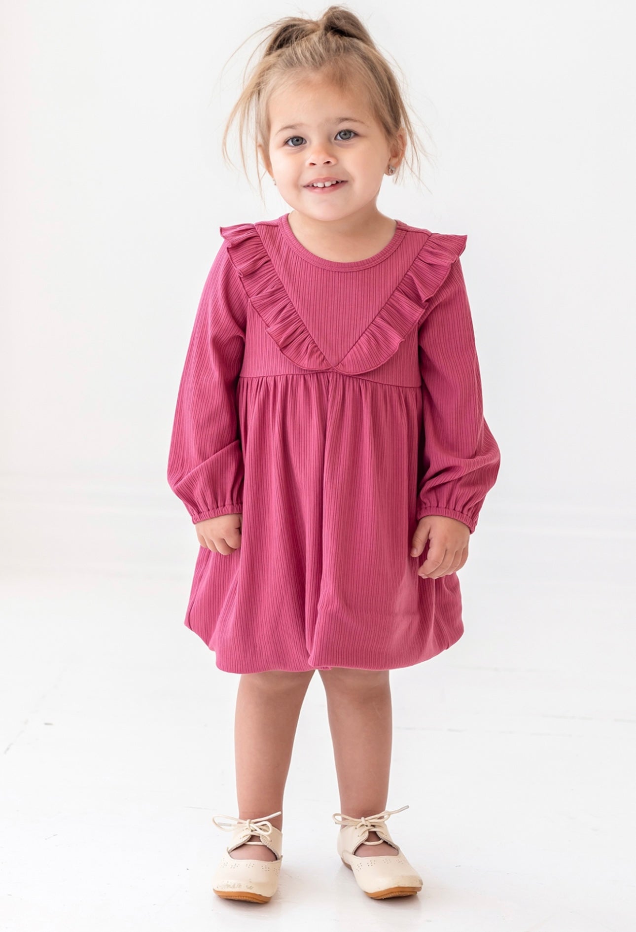 Introducing the Camilla Dress in red! This long sleeve dress is perfect for your little girl with its ribbed material and playful ruffle detail. She'll be stylish and comfortable all day long.