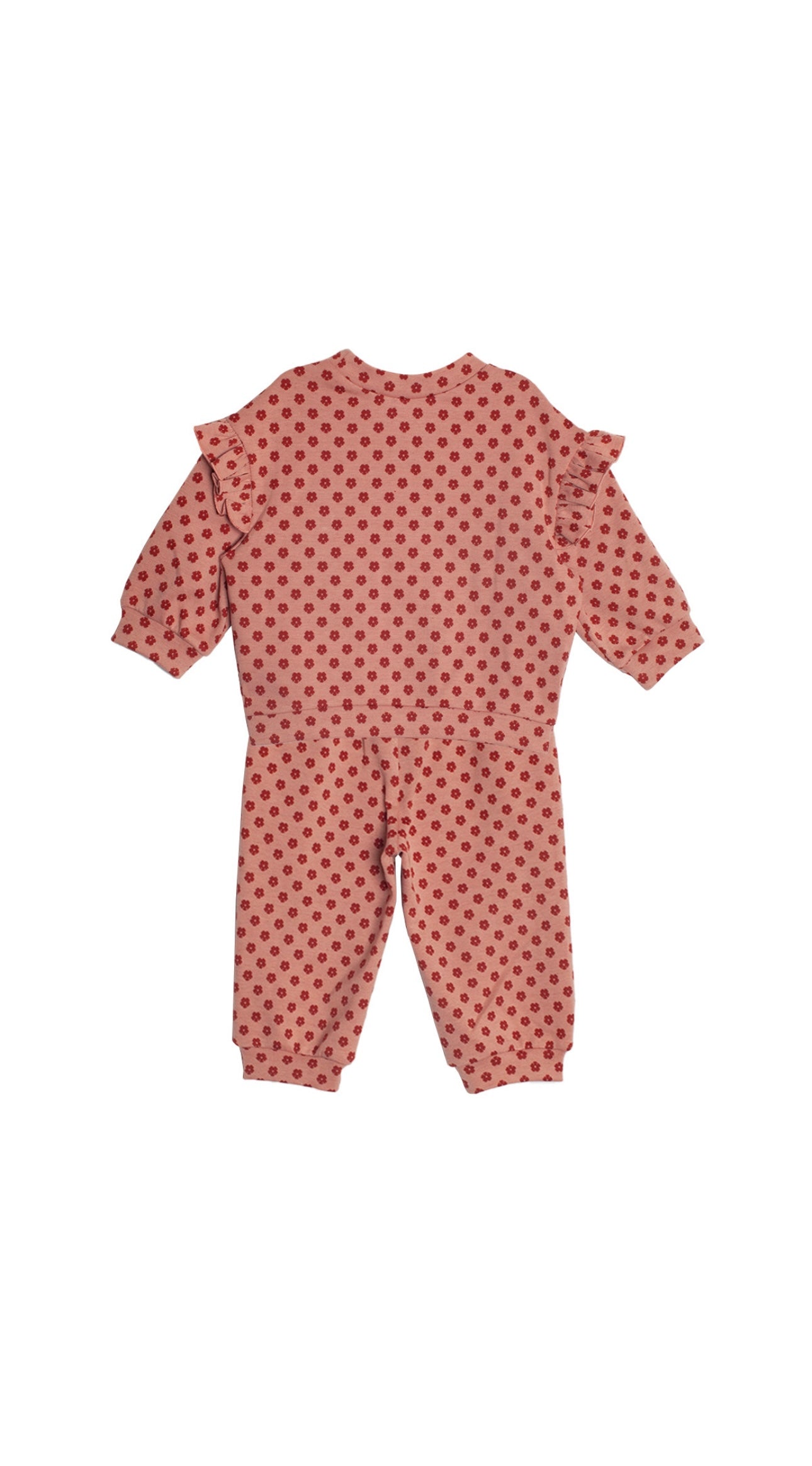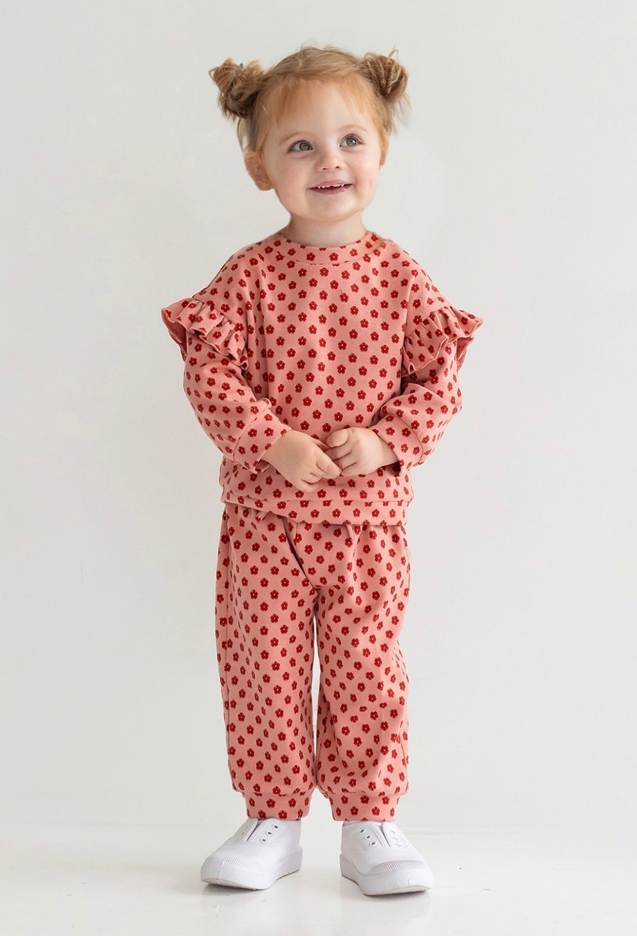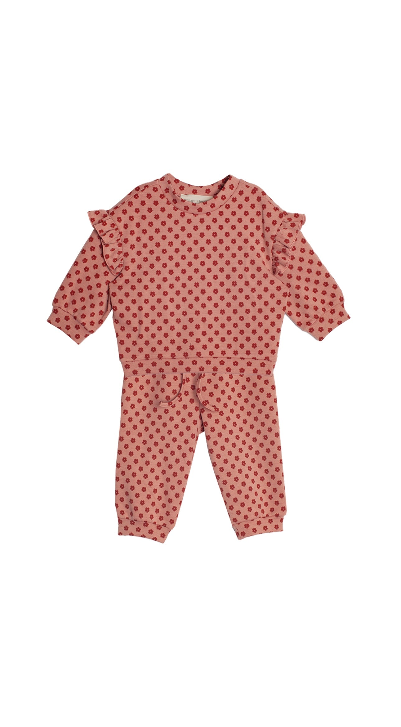 Add a pop of whimsy to your little one's wardrobe with this Floral 2-Piece Set in Pink. Featuring a playful pink and red floral print, this set includes a long-sleeve top and coordinating pants with charming ruffle sleeve details. Perfect for any occasion, this set is sure to bring a smile to your child's face!
