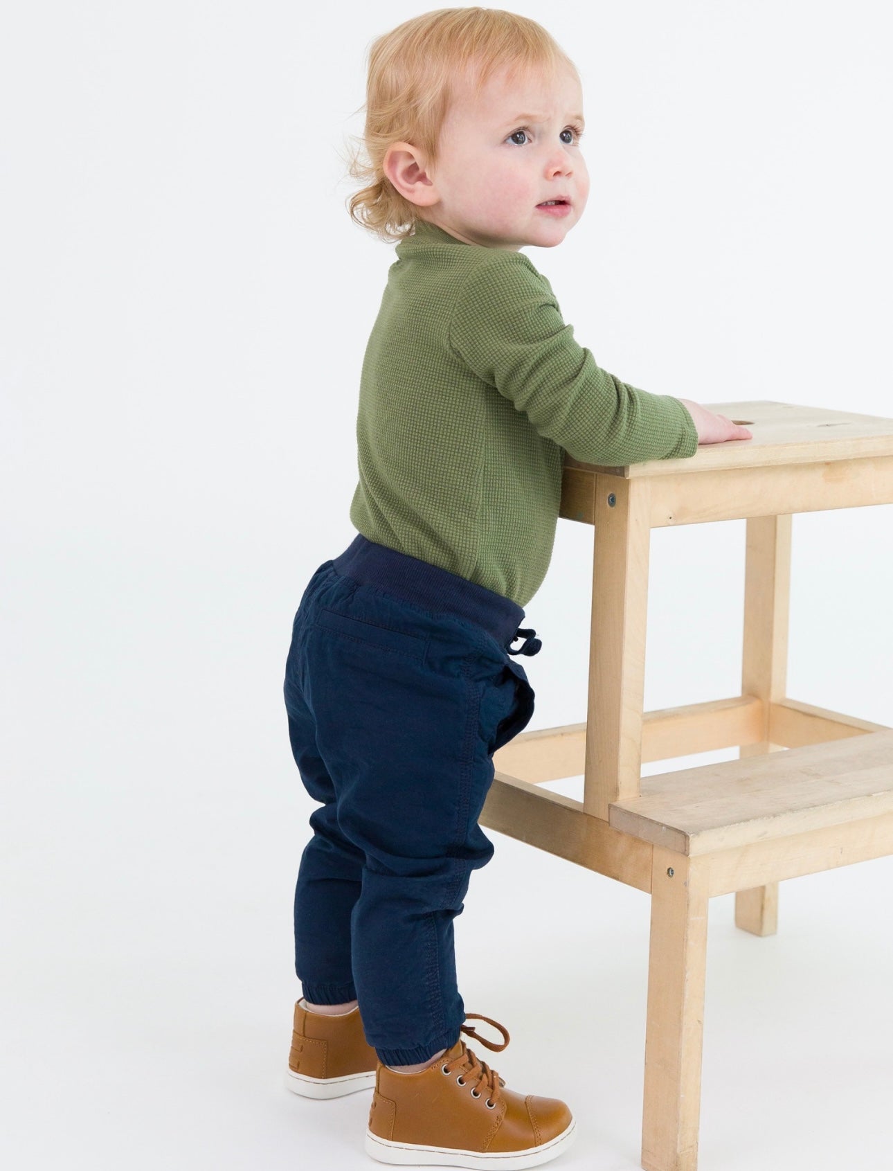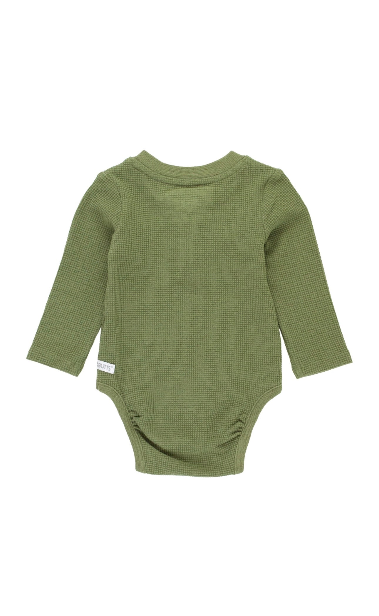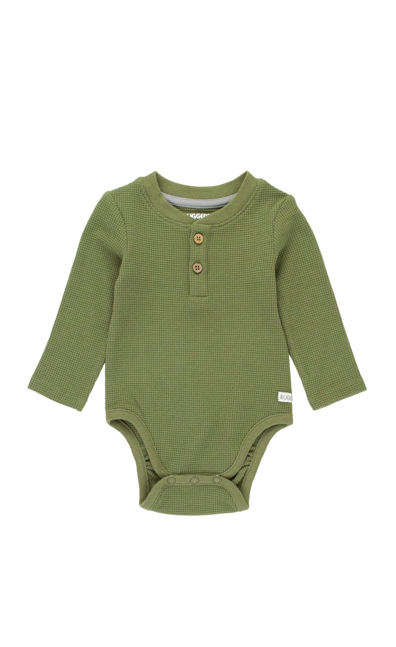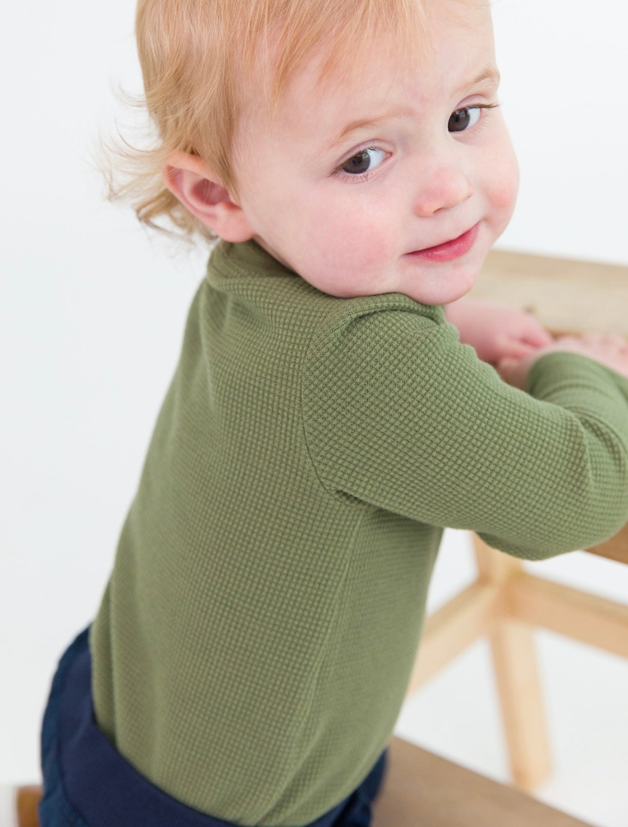 Get your little one ready in style with our boys waffle knit henley bodysuit in trendy dusty olive color. Soft and comfortable, this bodysuit is perfect for everyday wear. No hassle snaps ensure easy diaper changes. A must-have for any hip baby's wardrobe!