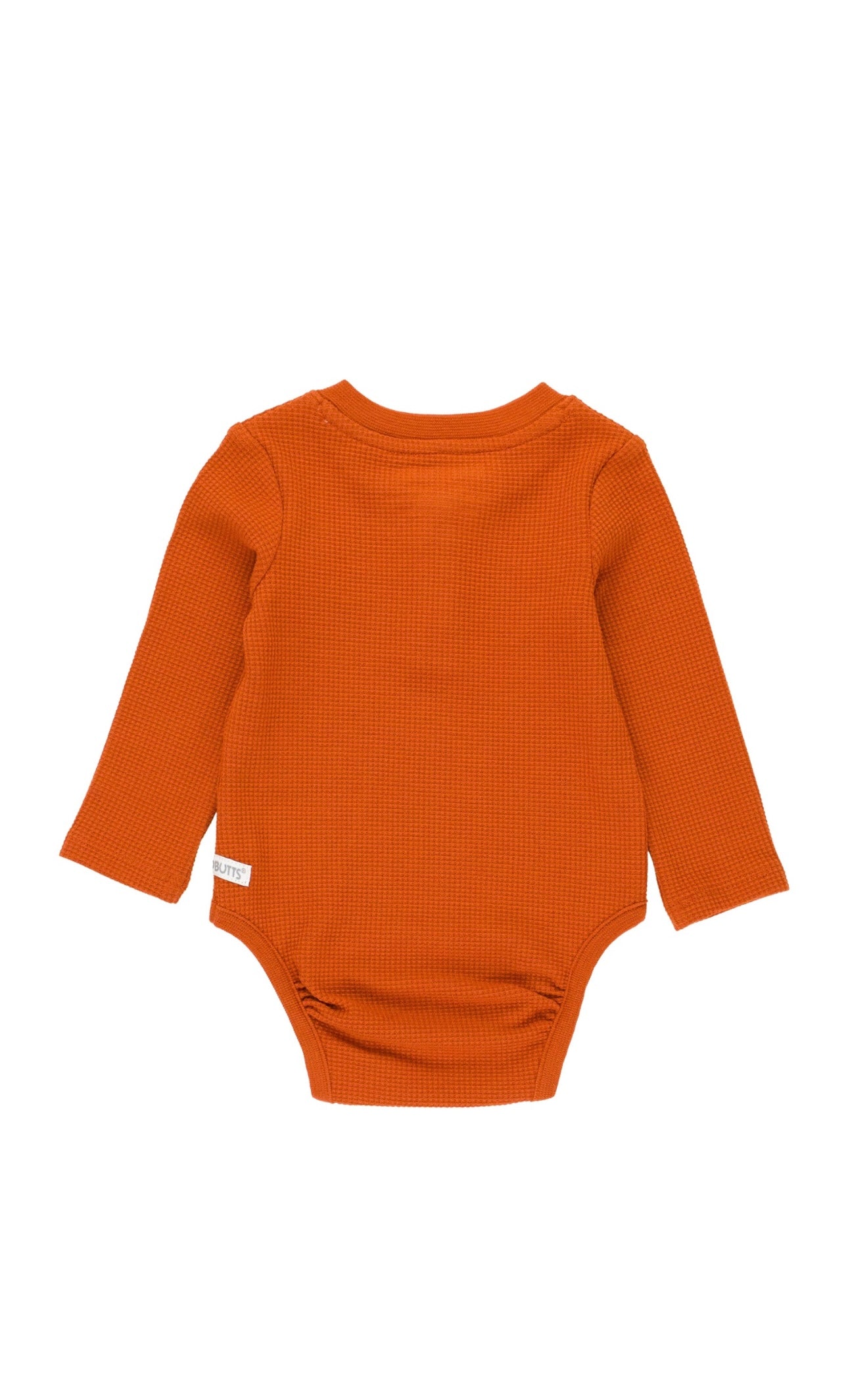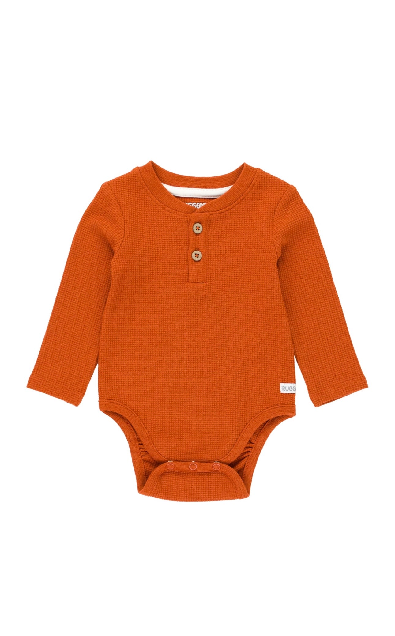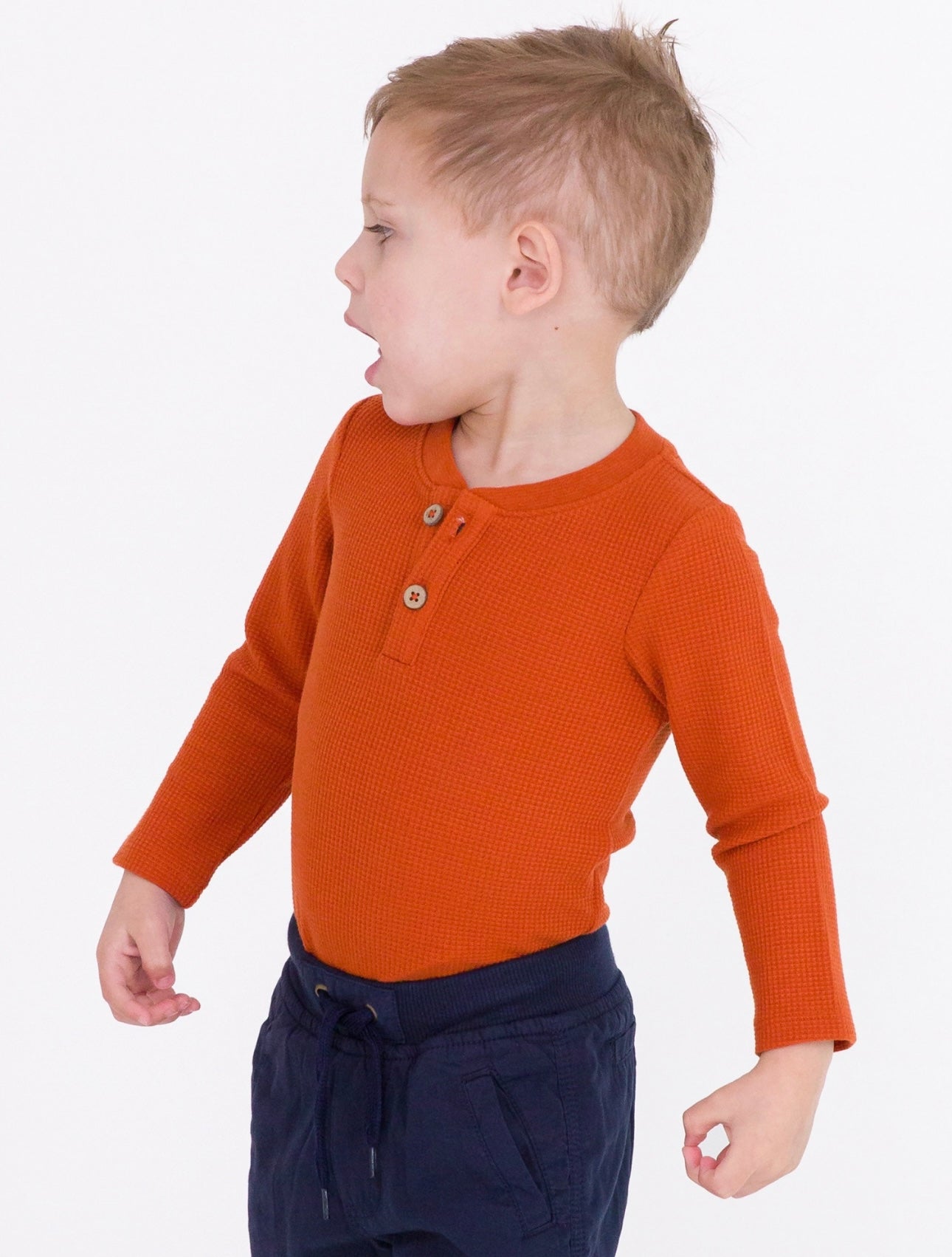 Get your little one ready in style with our boys waffle knit henley bodysuit in trendy rust color. Soft and comfortable, this bodysuit is perfect for everyday wear. No hassle snaps ensure easy diaper changes. A must-have for any hip baby's wardrobe!
