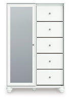 Fit for a princess. This dressing chest’s crisp matte white finish pairs with charming elements like a mirrored door, bun feet and crystal knobs—the perfect crowning touches for your girly girl. Hidden shelves keep toys within easy reach, making your little one feel like royalty.