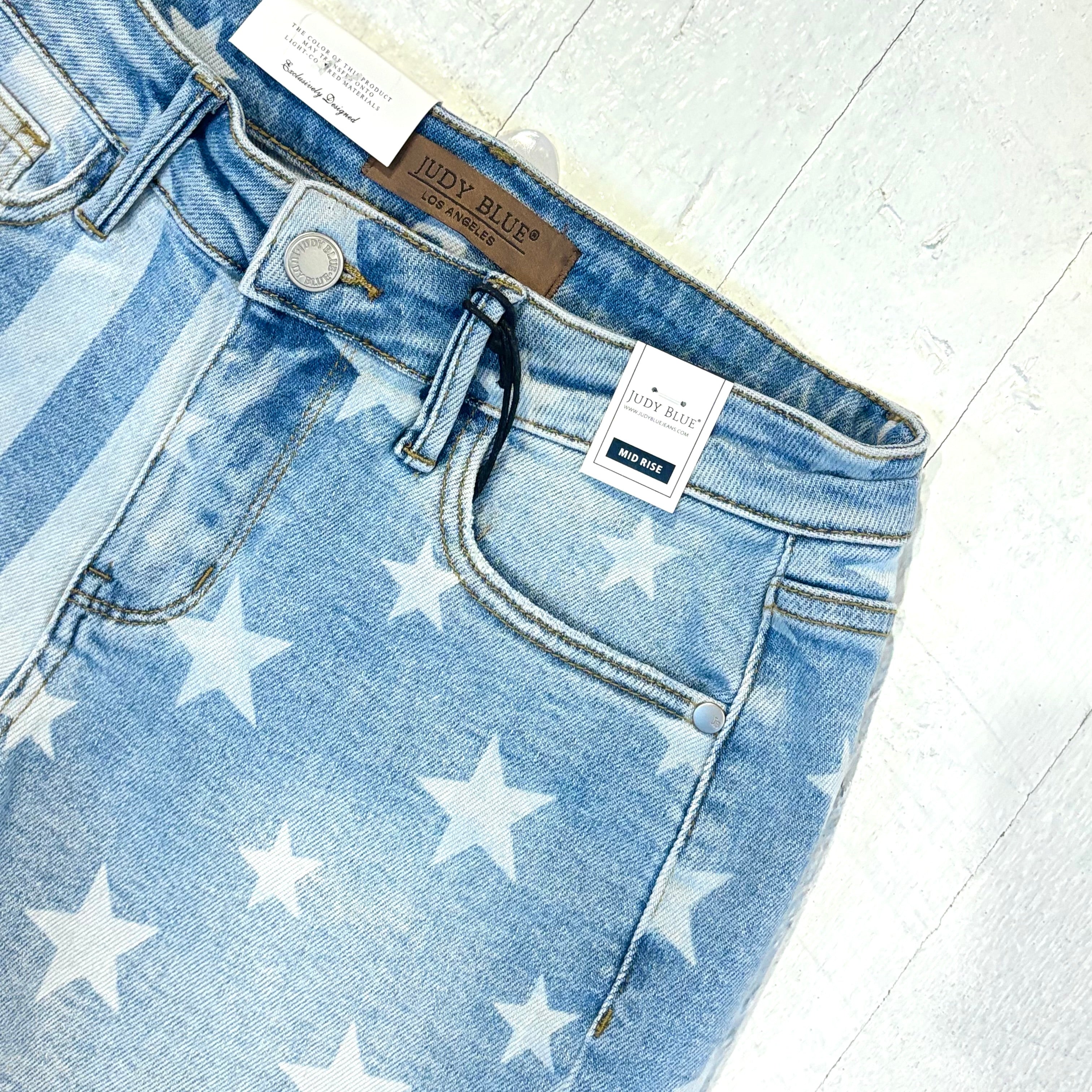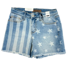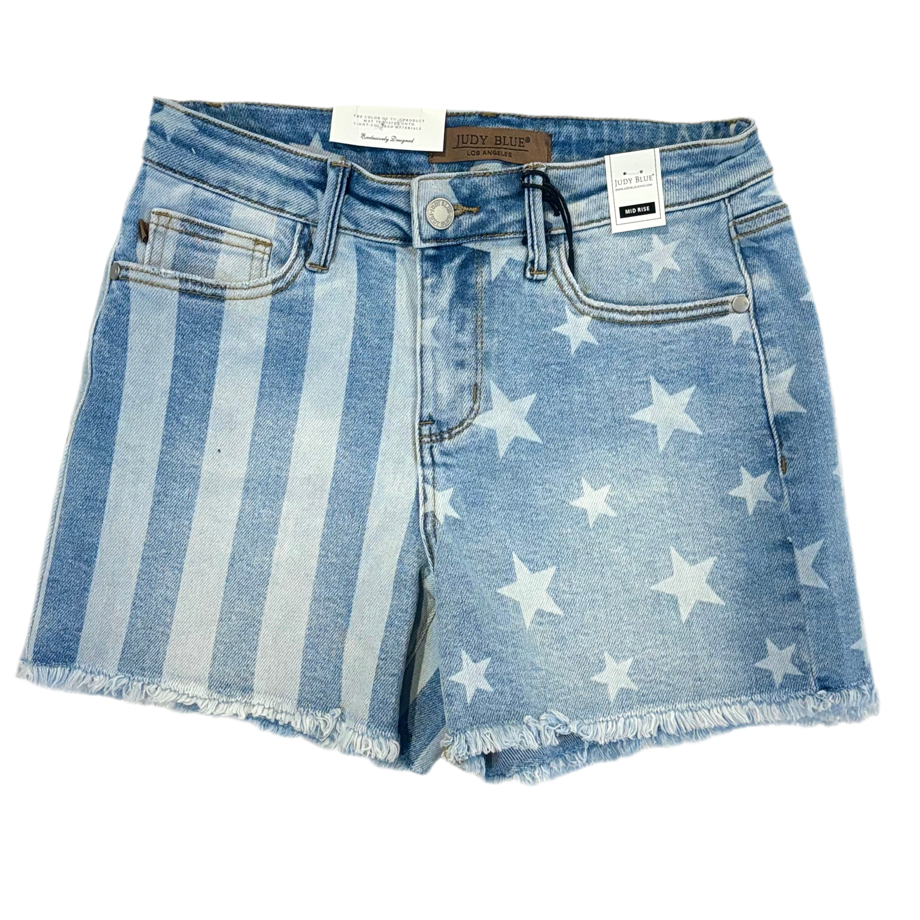 Judy Blue Mid Rise Star & Stripe Bleach Fray Hem Shorts