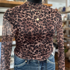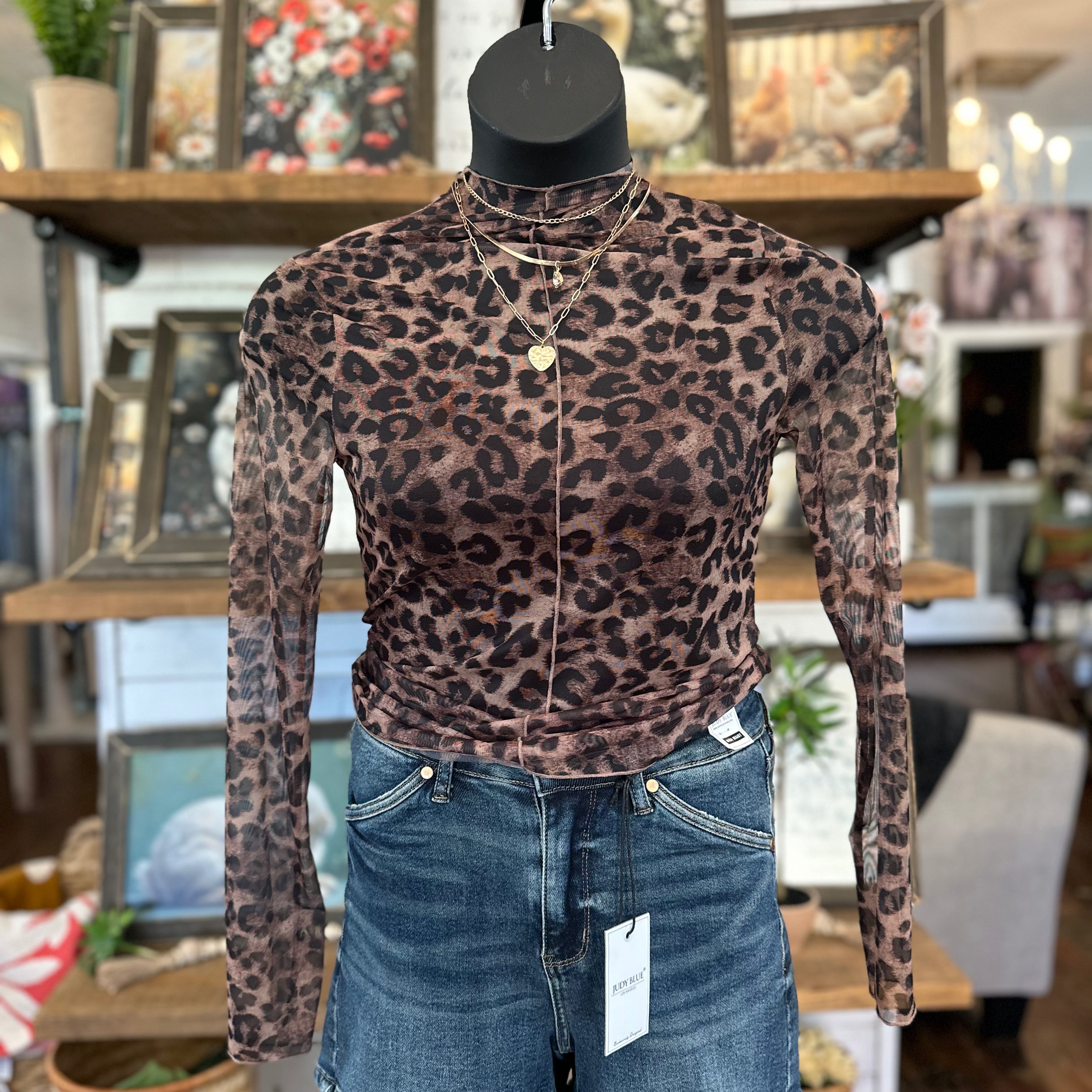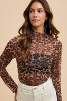 - This mocha colored mock neck top features an eye-catching animal print design in leopard, made from a comfortable and stretchy mesh fabric