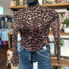 Animal Printed Lettuce Edge Mesh Mock Neck Top | Leopard Mocha