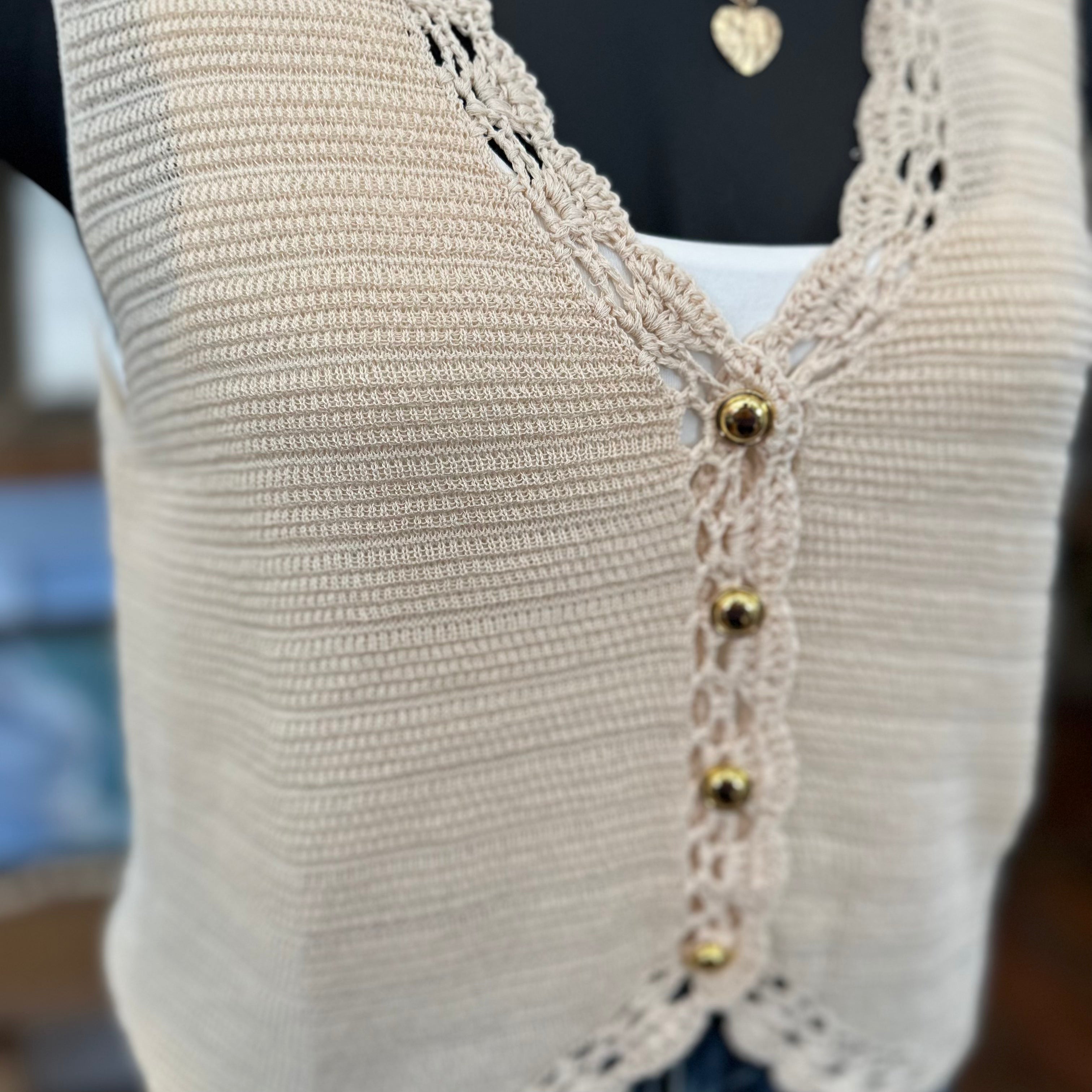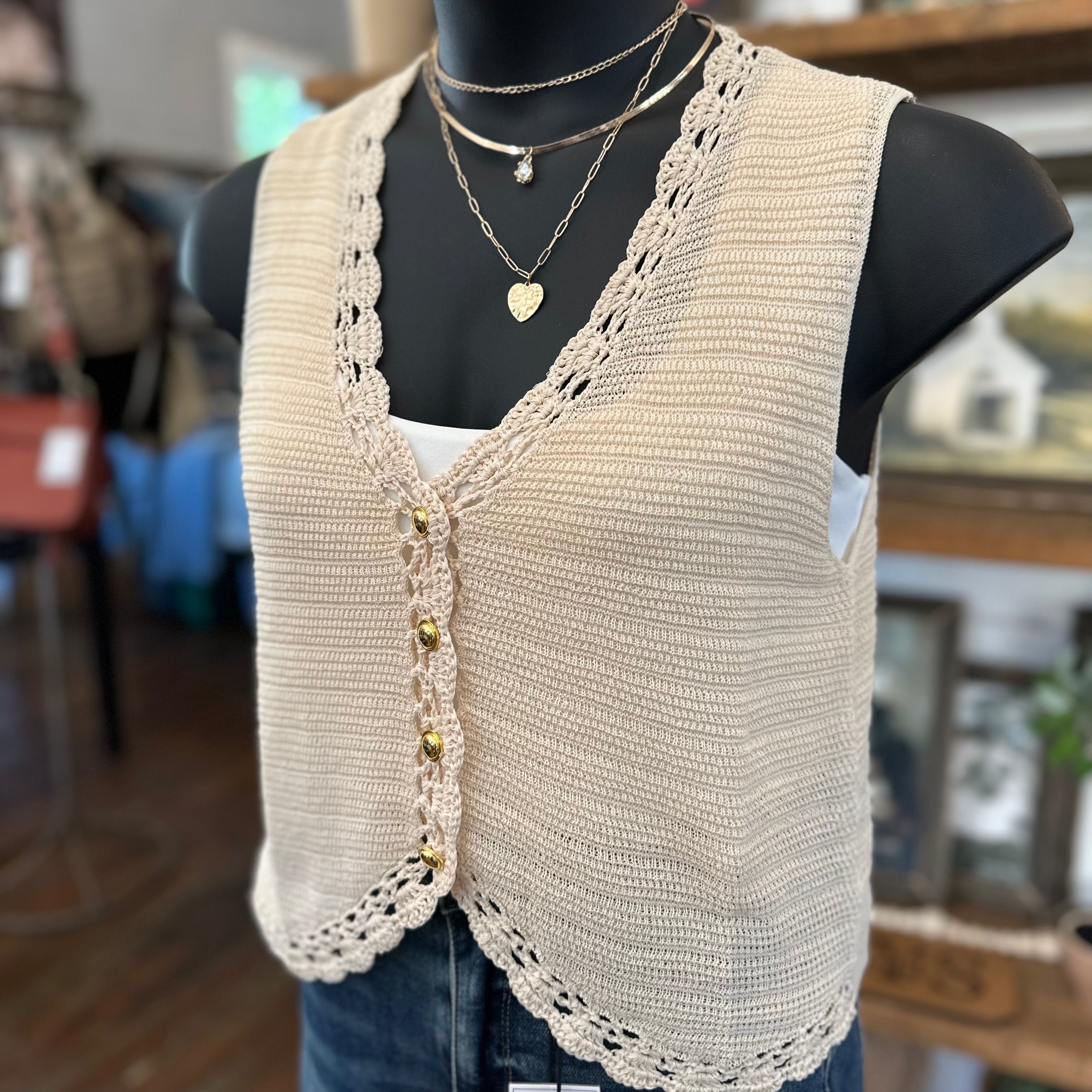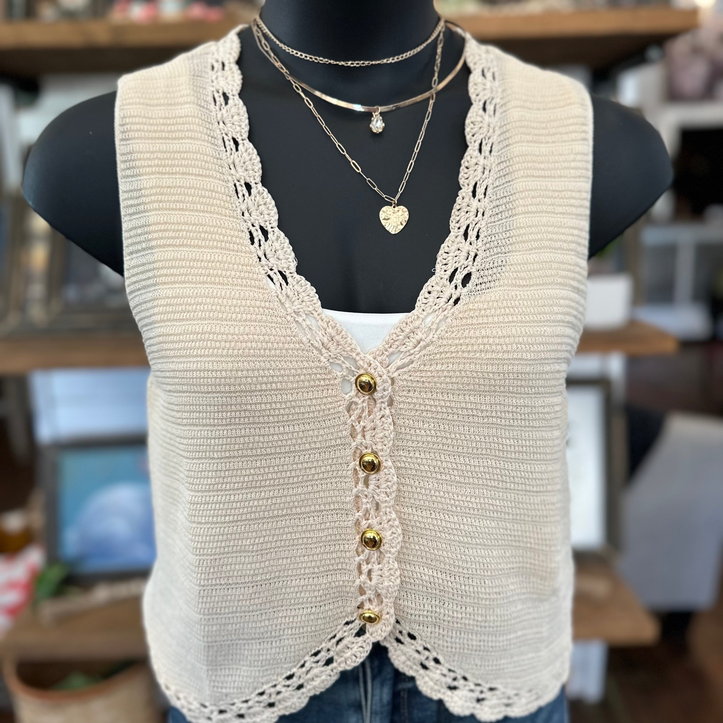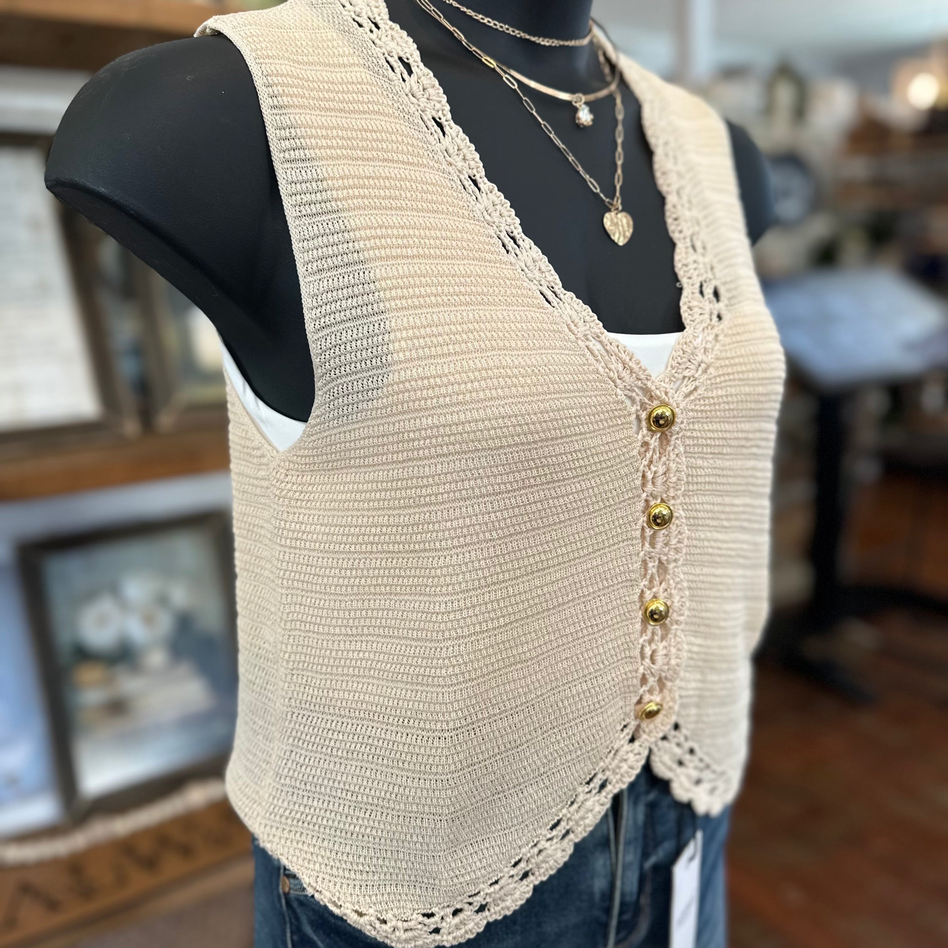 Crochet Trimmed Button Down Sweater Vest | Oatmeal