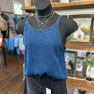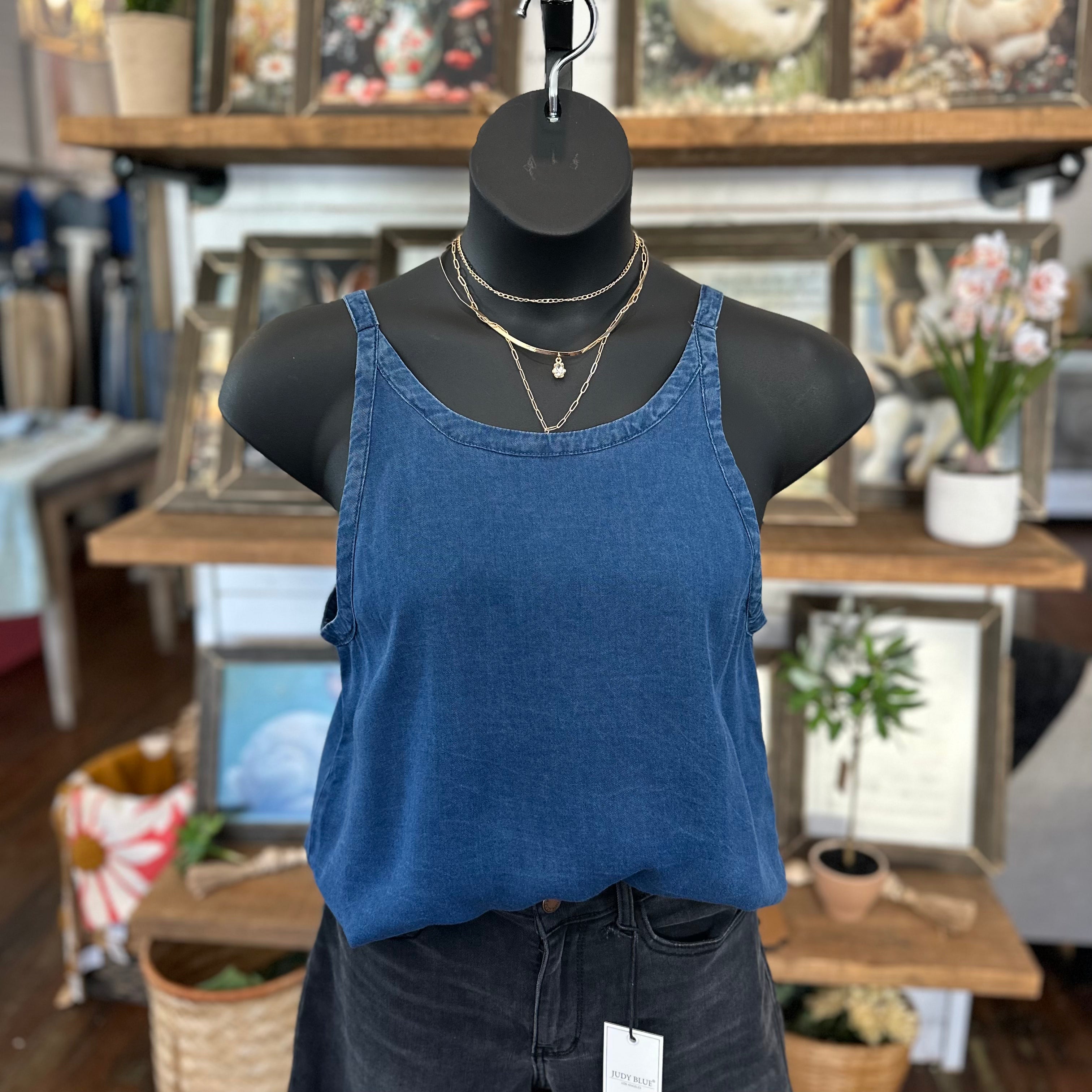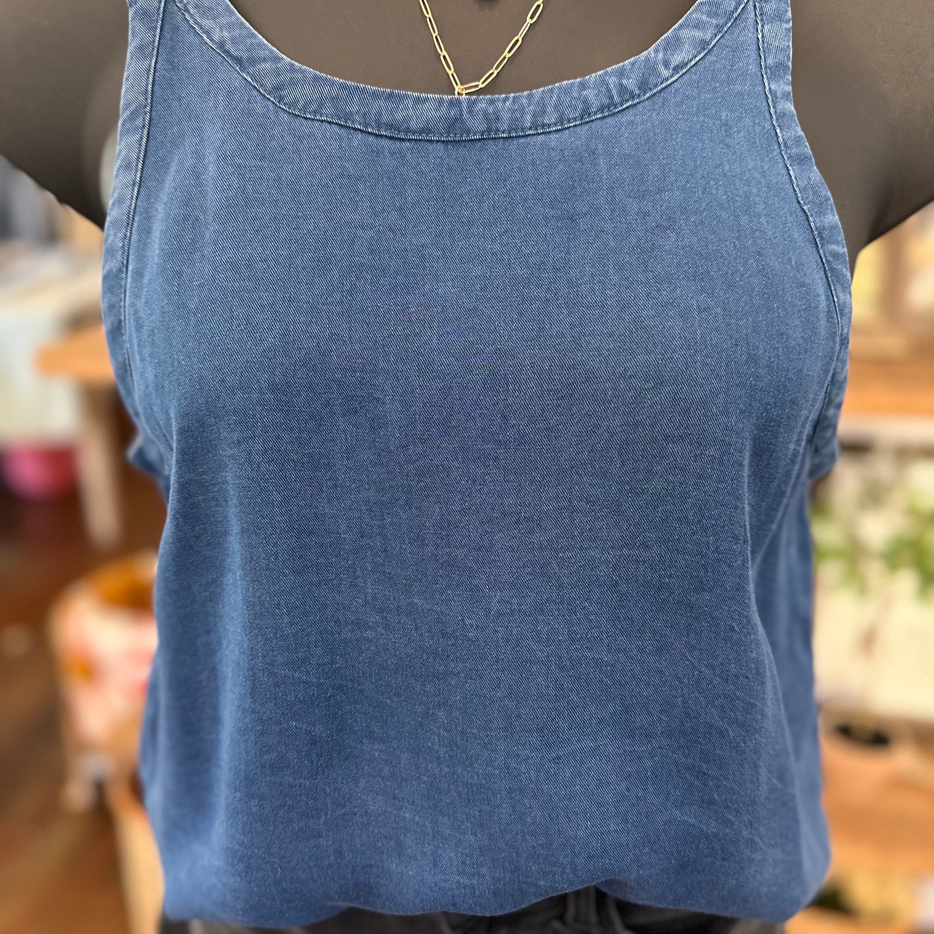 Round Neck Sleeveless Back Self Tie Top | Chambray
