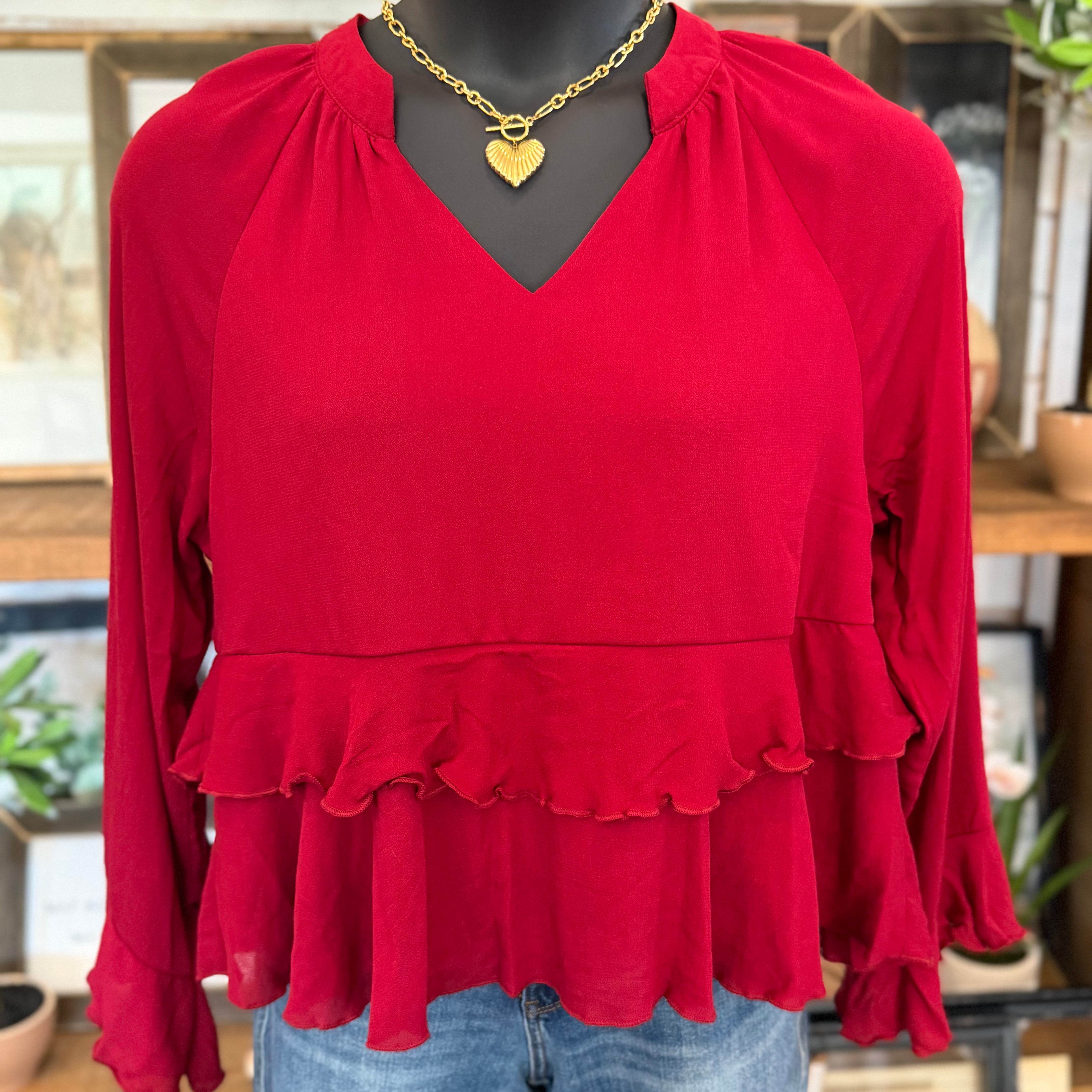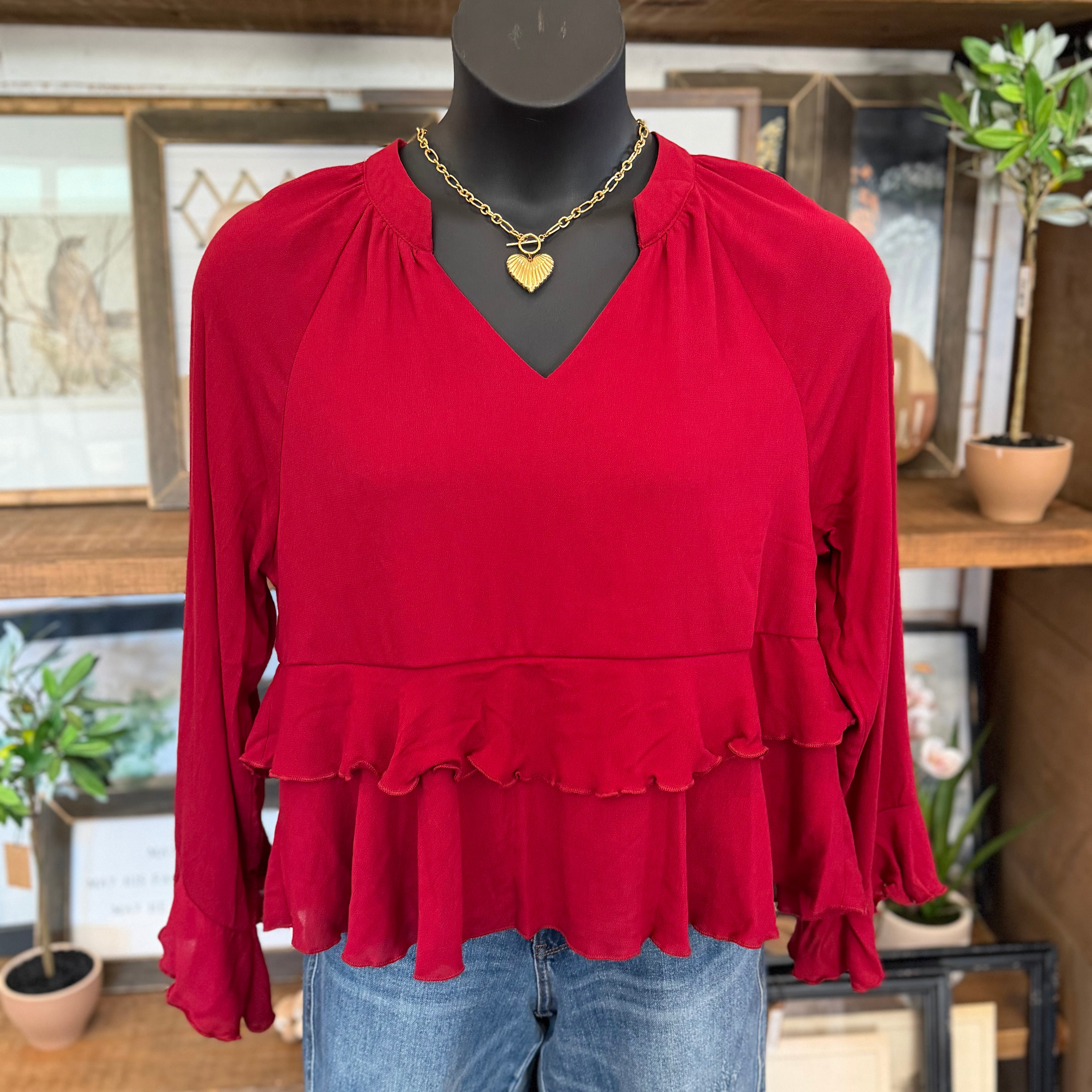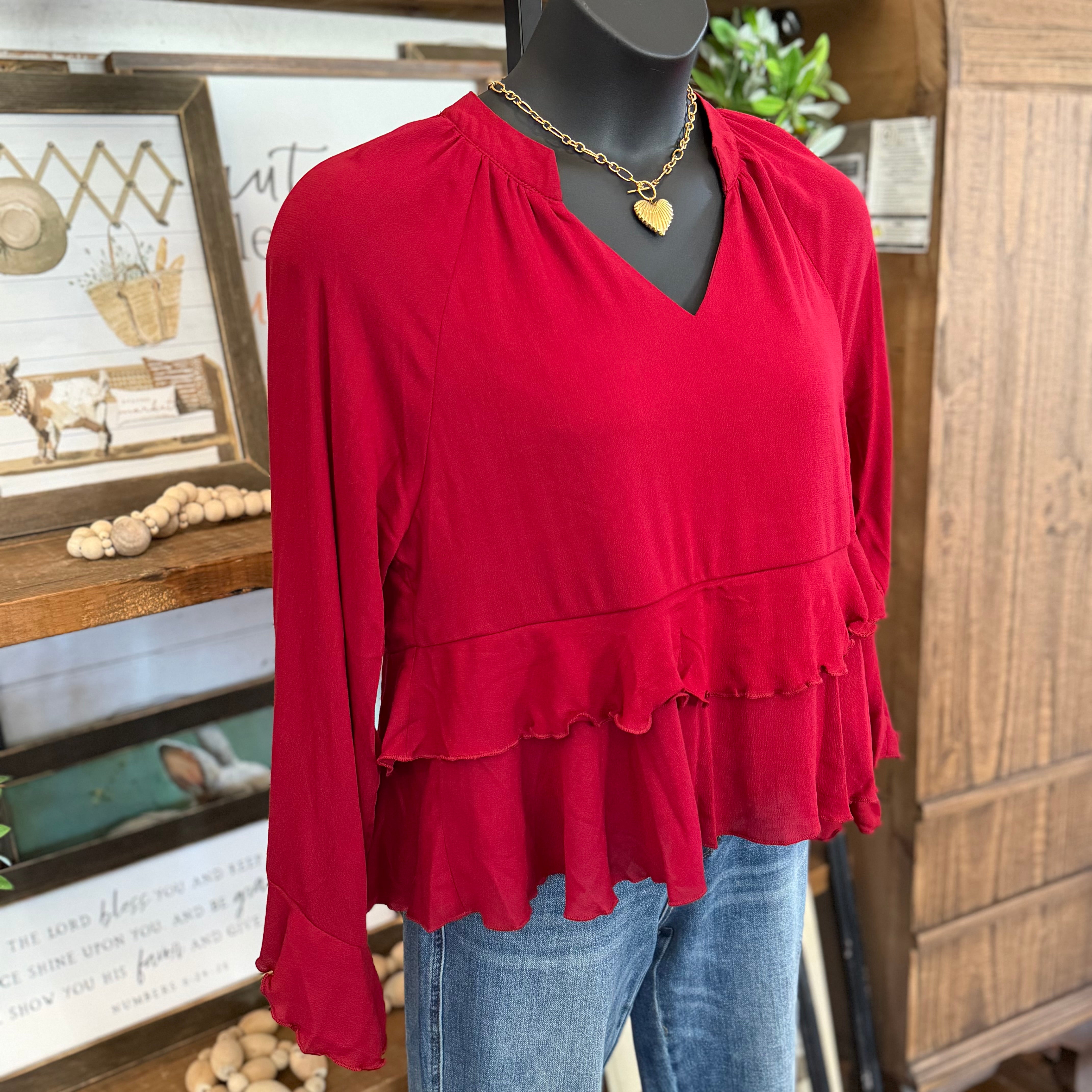 Notch Neck Long Sleeve Ruffle Hem Top | Ruby