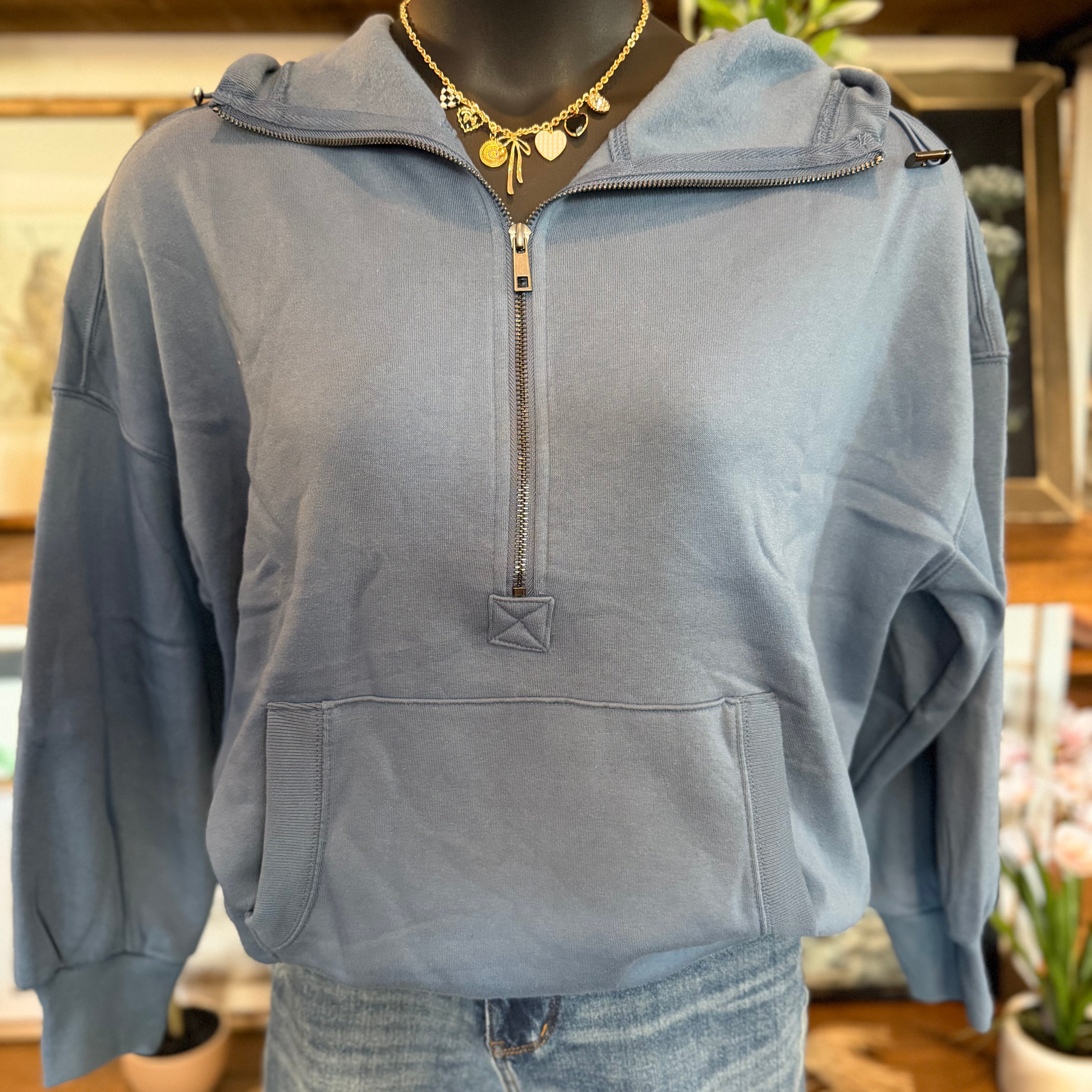 Fleece Elastic Hem Half Zip Kangaroo Pocket Hoodie | Dusty Blue