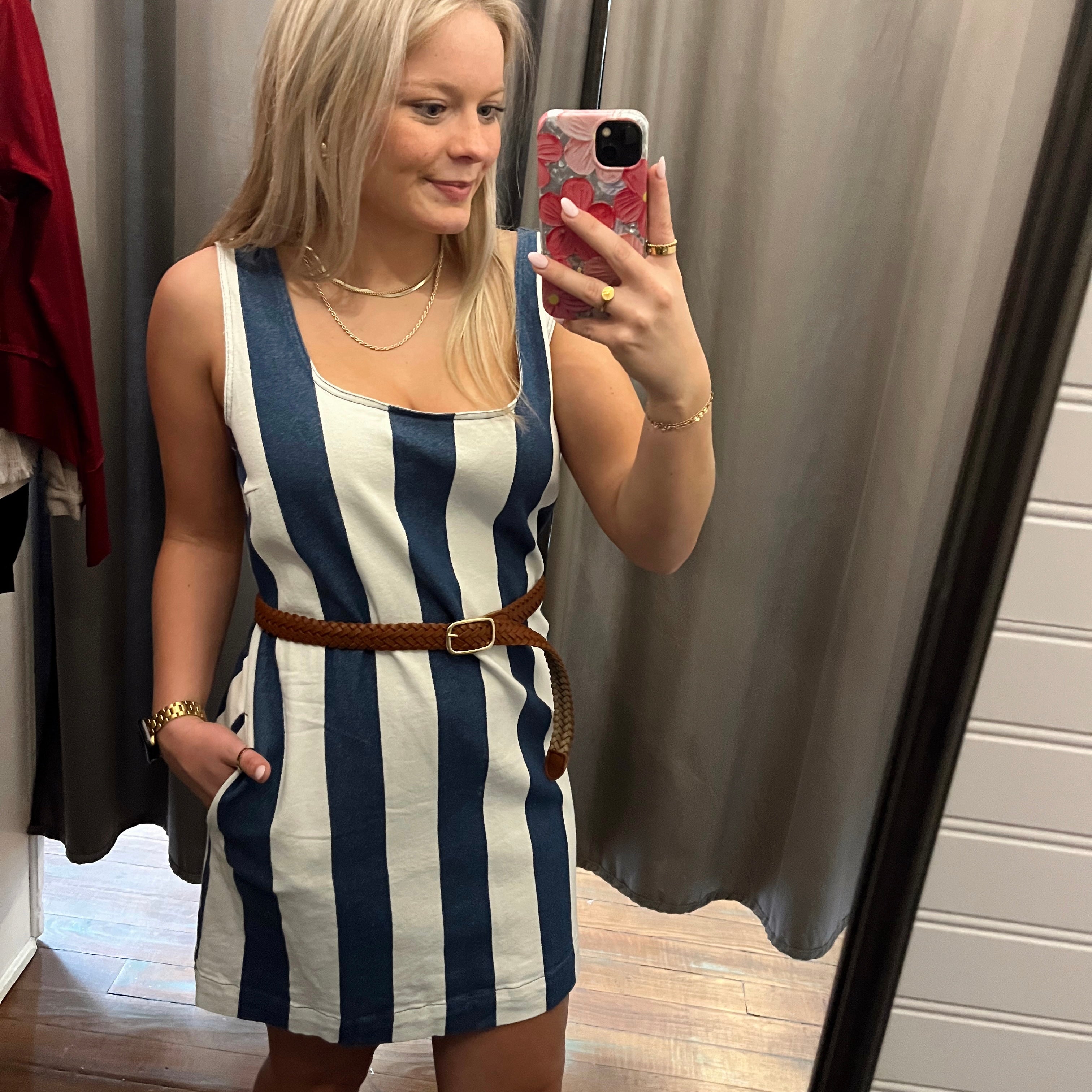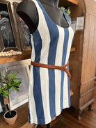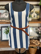 • Expertly designed for a fashionable and comfortable fit, this Vertical Stripe Tank Mini Dress in Indigo is a must-have addition to any wardrobe