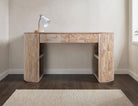 2 Drawer, Desk. Our exquisite White Balam collection is meticulously handcrafted using high-quality mango and teak wood. This simple yet striking collection is designed to infuse your space with an organic, modern aesthetic. This modern-styled desk boasts a unique, organic shape, featuring elegantly curved top and side panels, adding a touch of sophistication to your office.