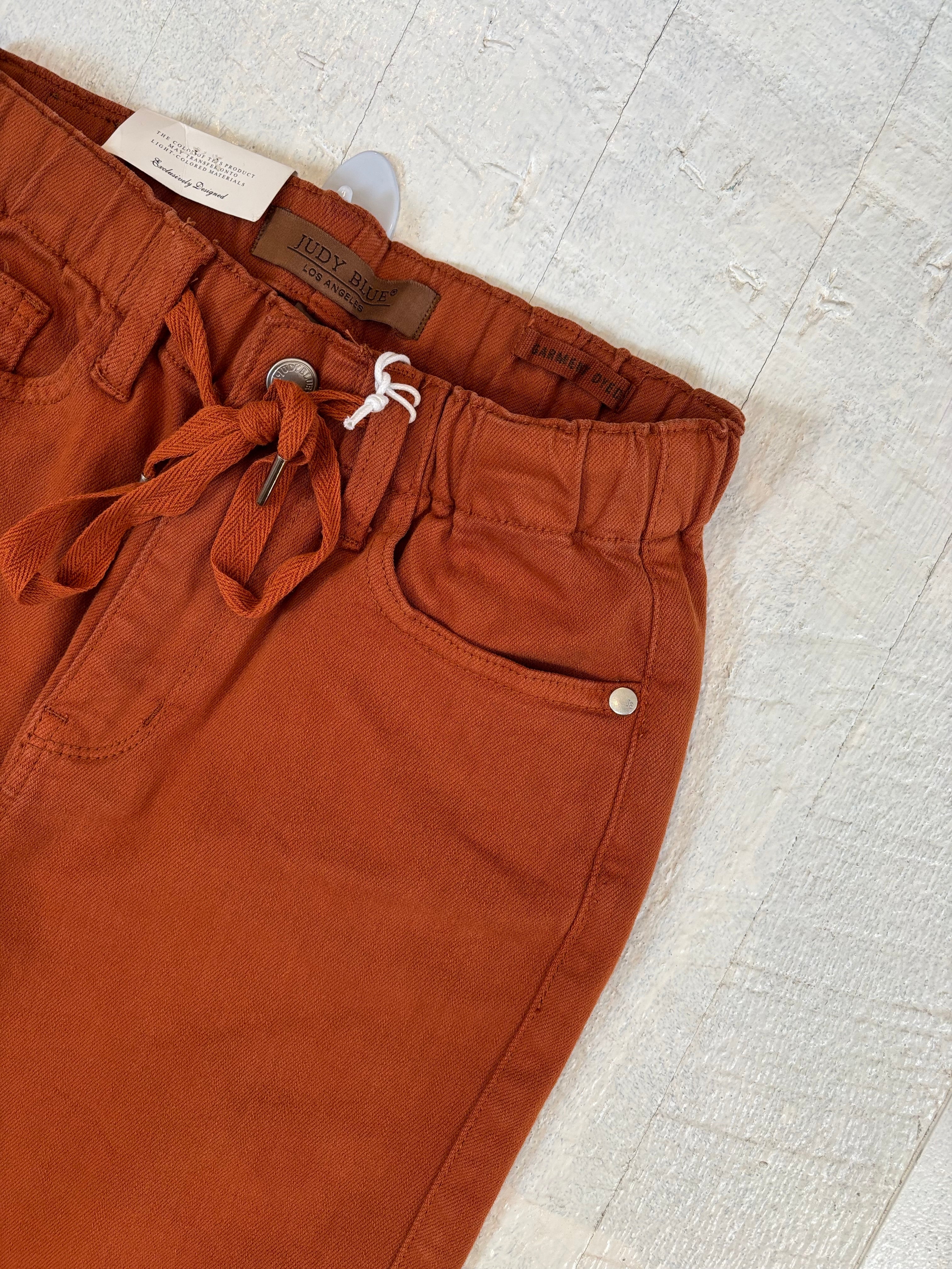 - The garment dyed orange color adds a pop of color to any outfit, and the drawstring waist allows for a comfortable and customizable fit