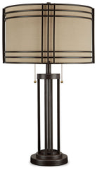 Add a touch of rustic industrial style to your decor with this eye-catching table lamp. Its drum shade and decorative metal frame bring an appealing touch to your home. A dark brown finish complements the shade's lighter neutral color, making this lamp ideal for enhancing casual urban spaces.