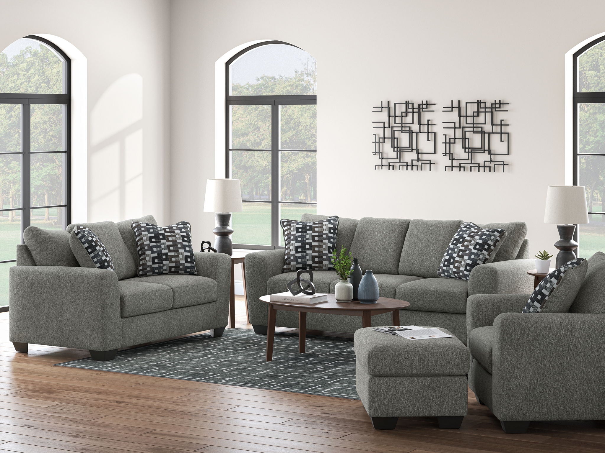 Transitional and right on trend. This seating set's upholstery is a delightful change from the ordinary, with hints of soft brown giving the gray hue added depth. It’s punctuated with chic accent pillows in an eye-catching, stylized stripe design. Whether you're hosting friends and family or relaxing solo, this set invites homey, comfortable character into your space.