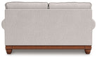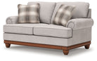 Fresh yet classic. That’s the beauty of this loveseat. Dressy and also soft to the touch, its organic neutral-toned upholstery is sure to bring a transitional farmhouse aesthetic to your living space. Accent pillows in windowpane plaid infuse a cozy and inviting farmhouse sensibility, while a full wraparound base and decorative turned legs complete the loveseat's timeless look. It's the perfect place to unwind with your bestie after a long day.