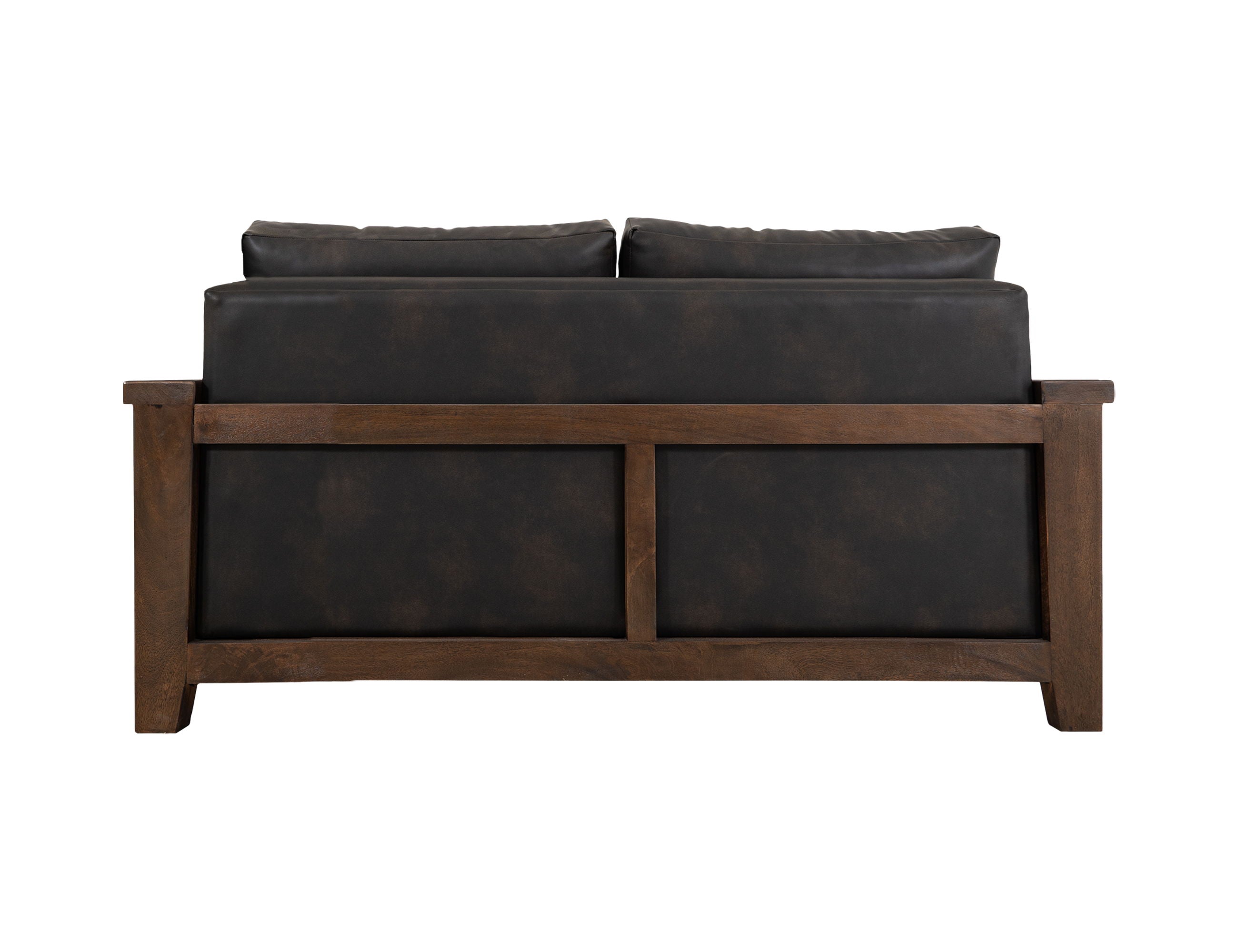 Wooden Frame, Upholstered Loveseat. Step into comfort and make this loveseat the focal point of your living room. The Walnut loveseat features a sturdy wooden frame with a rich brown finish and wide, flat armrests. Both the seats and backrest are upholstered in a dark, leather-like material. The backrest showcases a tufted design adorned with buttons, adding an elegant touch. Diagonal wooden supports on the sides enhance its modern rustic charm, blending the warmth of wood with the sleekness of dark upholstery.