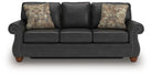 Everyone can have the best rest in the house with this queen sofa sleeper. Its nailhead trim puts the finishing touches on the traditional roll arms you love. The sofa's comfy, durable cushions—wrapped in a rustic yet sophisticated faux leather—keep you feeling relaxed, while its turned legs show that style and quality flow from top to bottom. A pull-out mattress made with quality memory foam comfortably accommodates overnight guests.