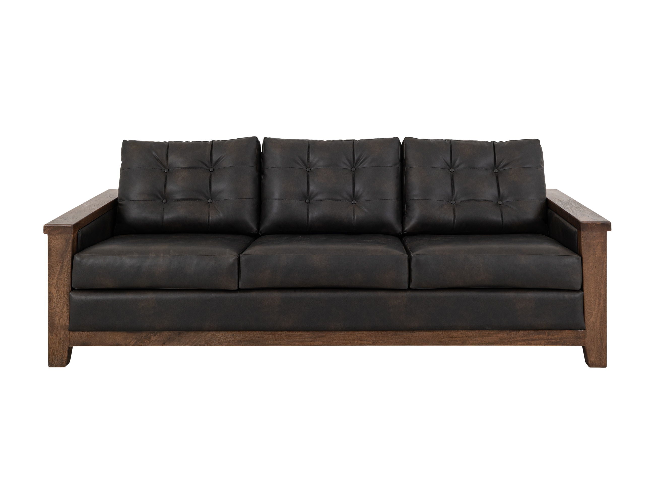 Wooden Frame, Upholstered Sofa. Step into comfort and make this loveseat the focal point of your living room. The Walnut loveseat features a sturdy wooden frame with a rich brown finish and wide, flat armrests. Both the seats and backrest are upholstered in a dark, leather-like material. The backrest showcases a tufted design adorned with buttons, adding an elegant touch. Diagonal wooden supports on the sides enhance its modern rustic charm, blending the warmth of wood with the sleekness of dark upholstery.