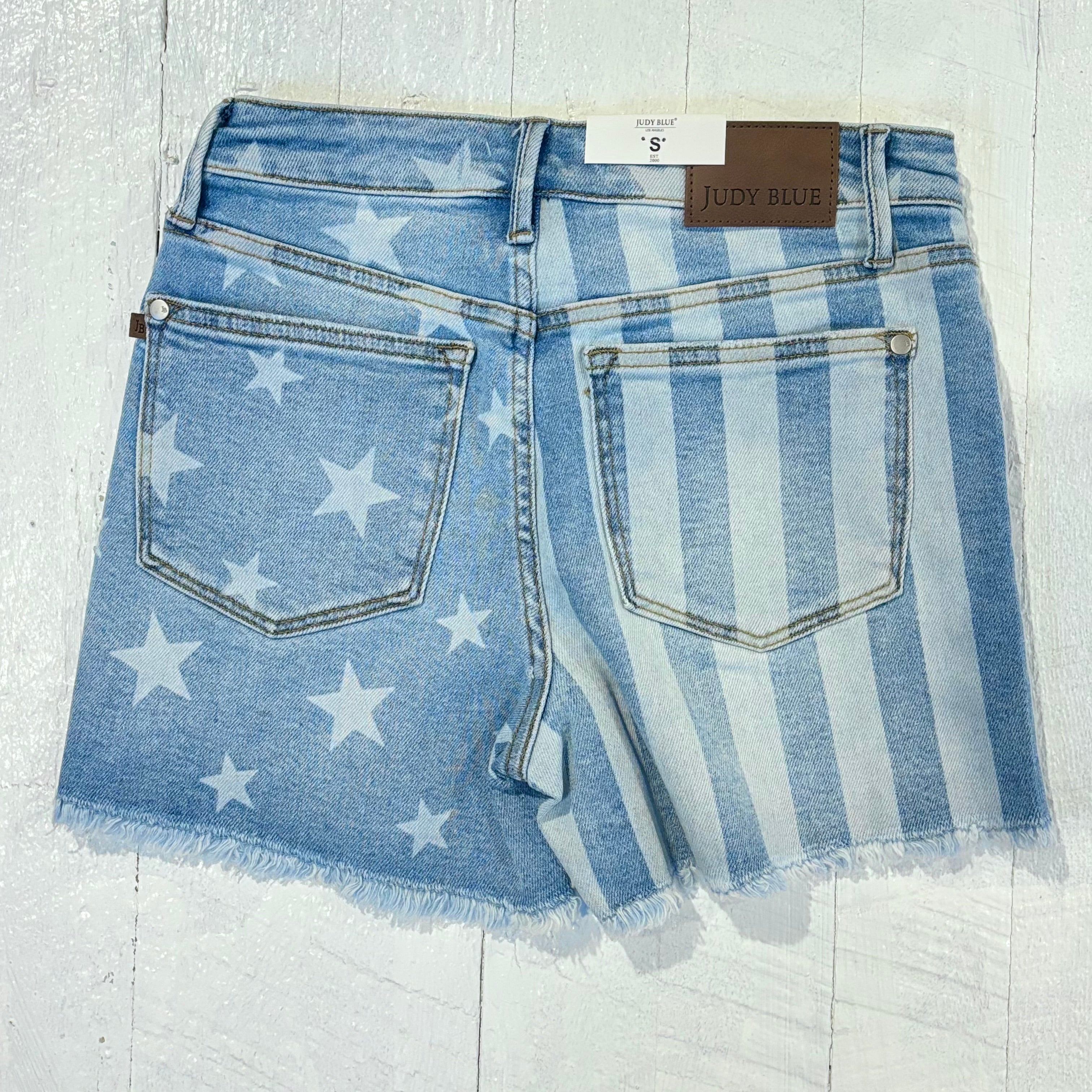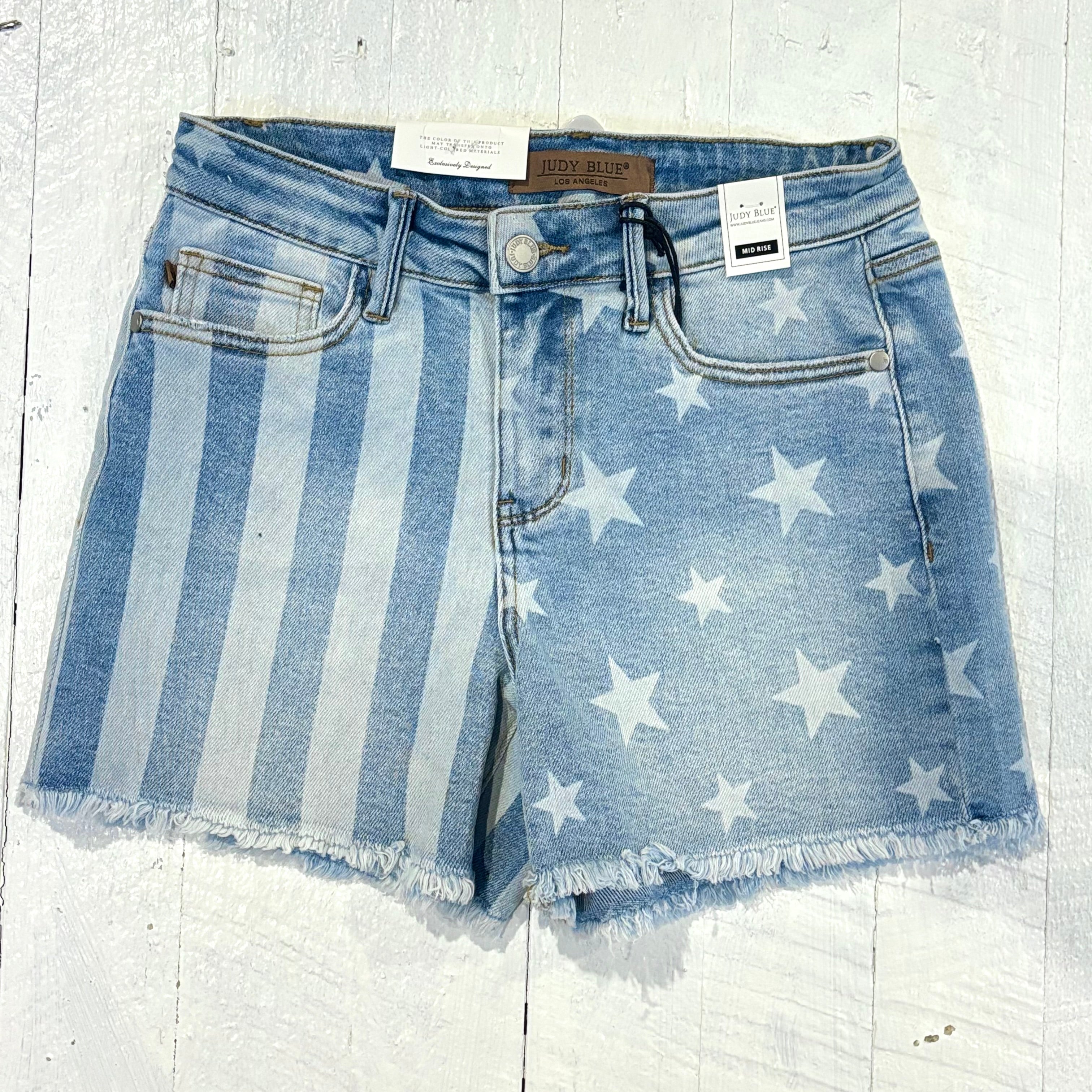 Judy Blue Mid Rise Star & Stripe Bleach Fray Hem Shorts