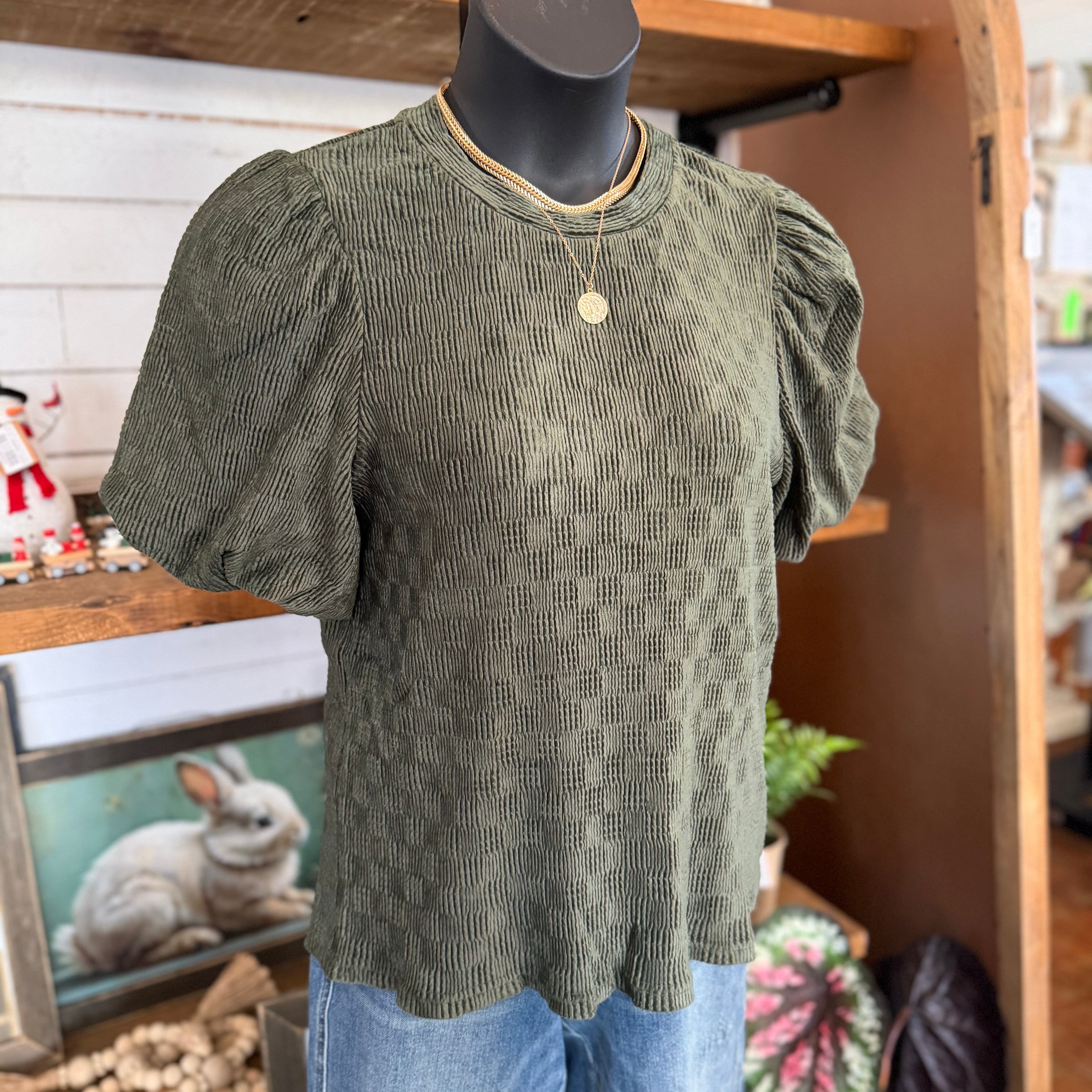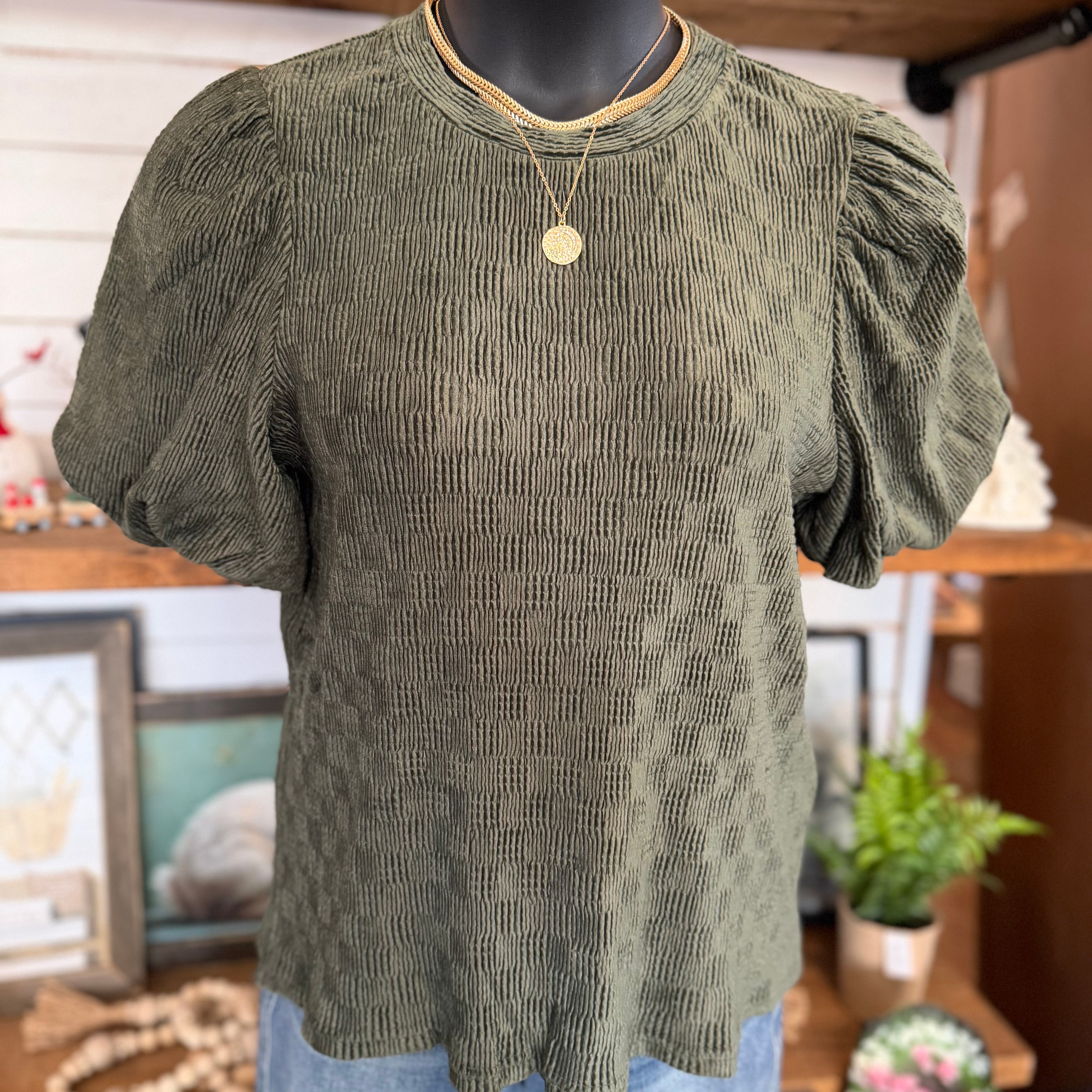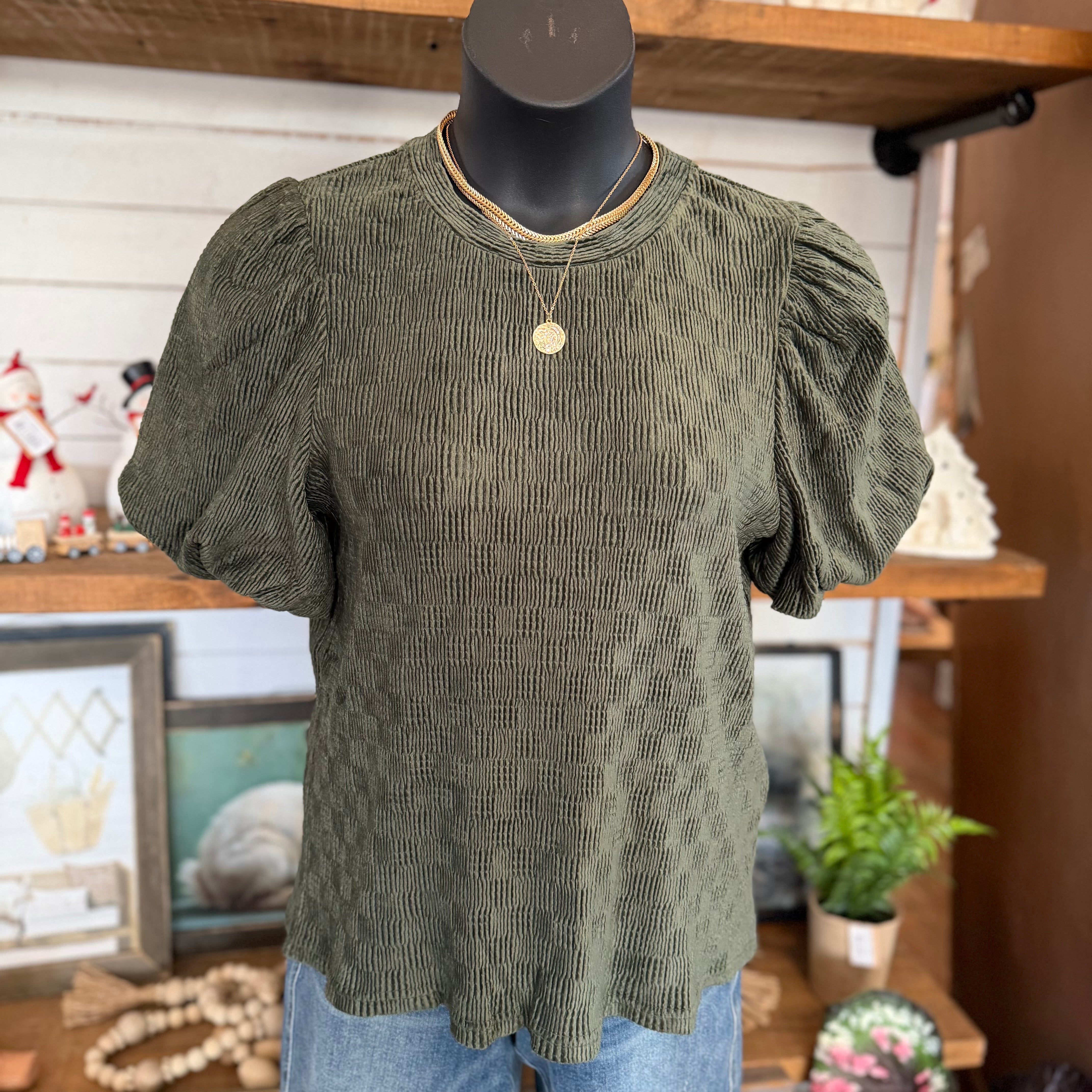 Texture Velvet Bubble Sleeve Top | Olive