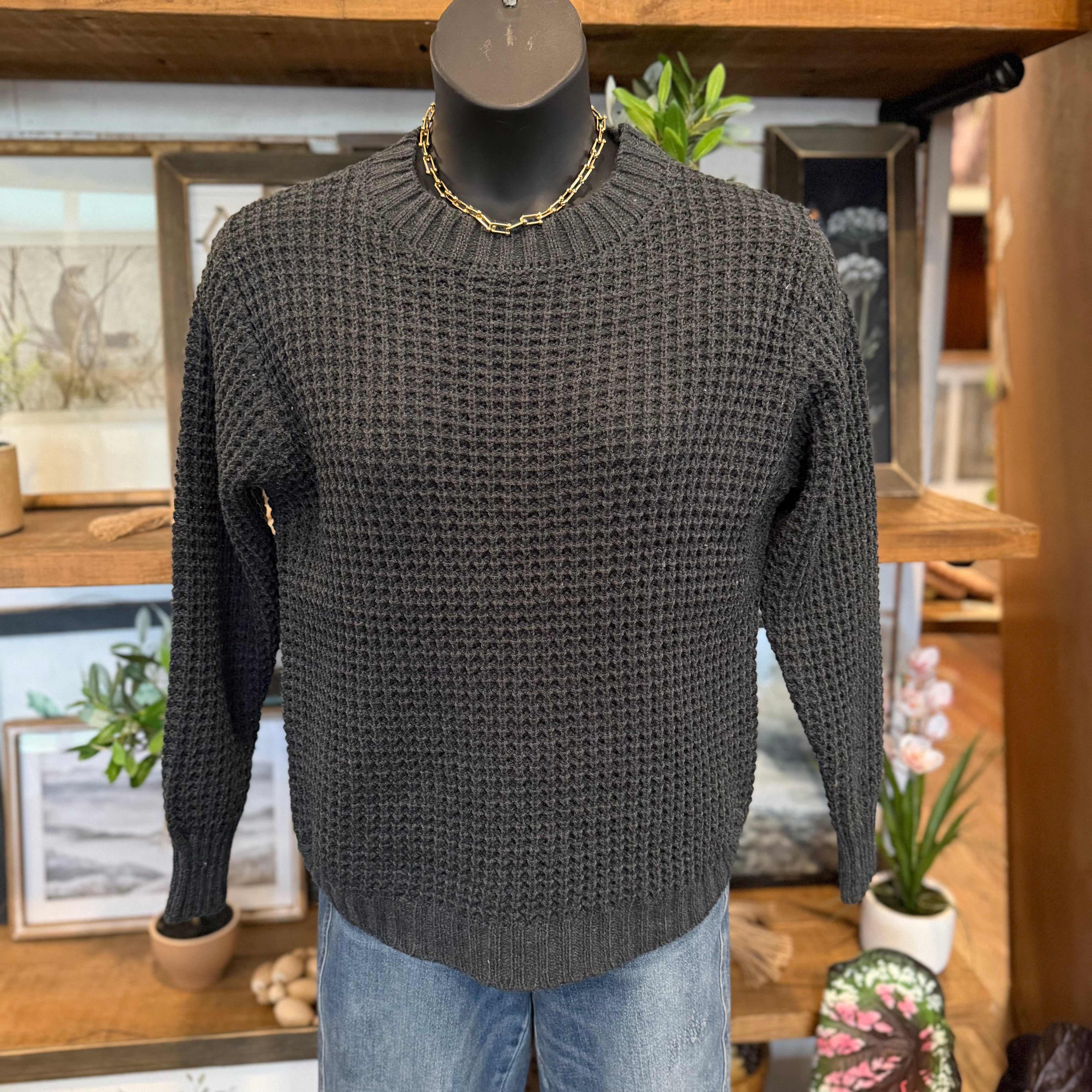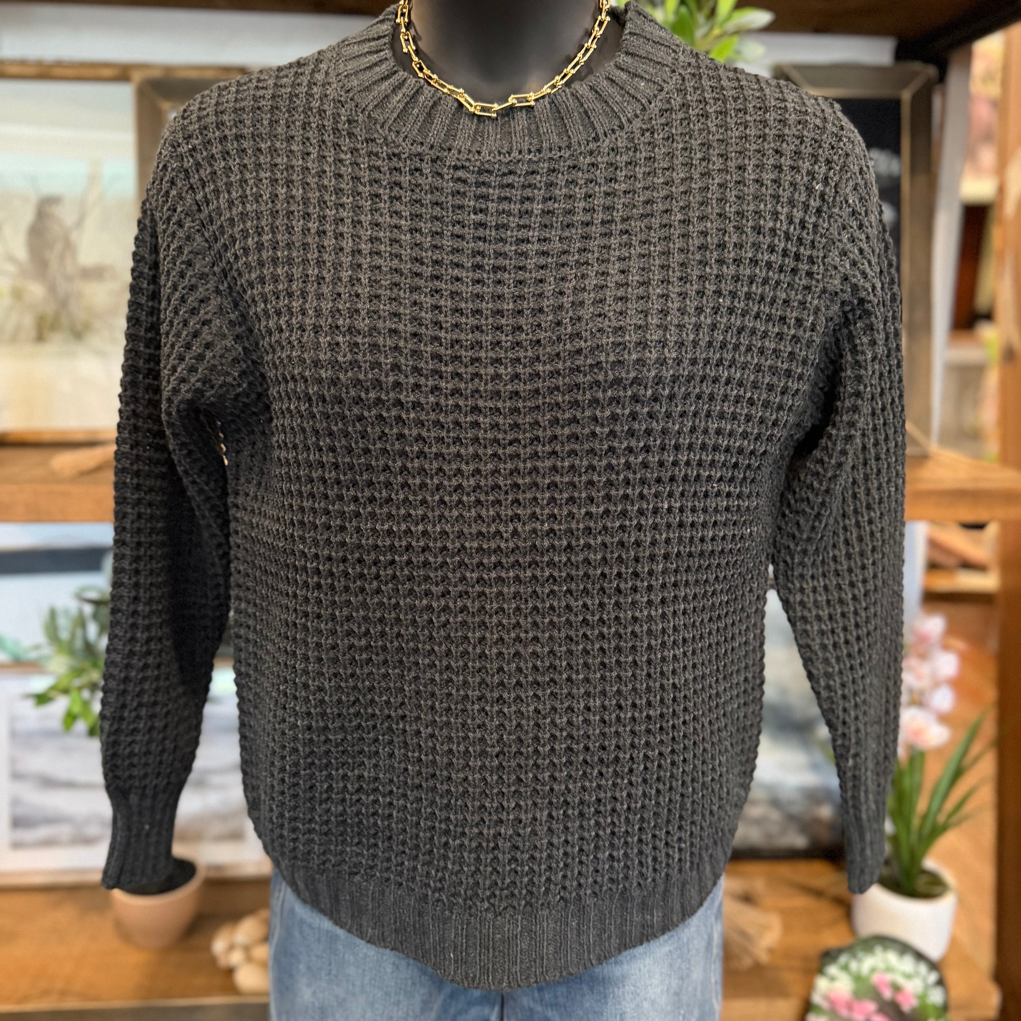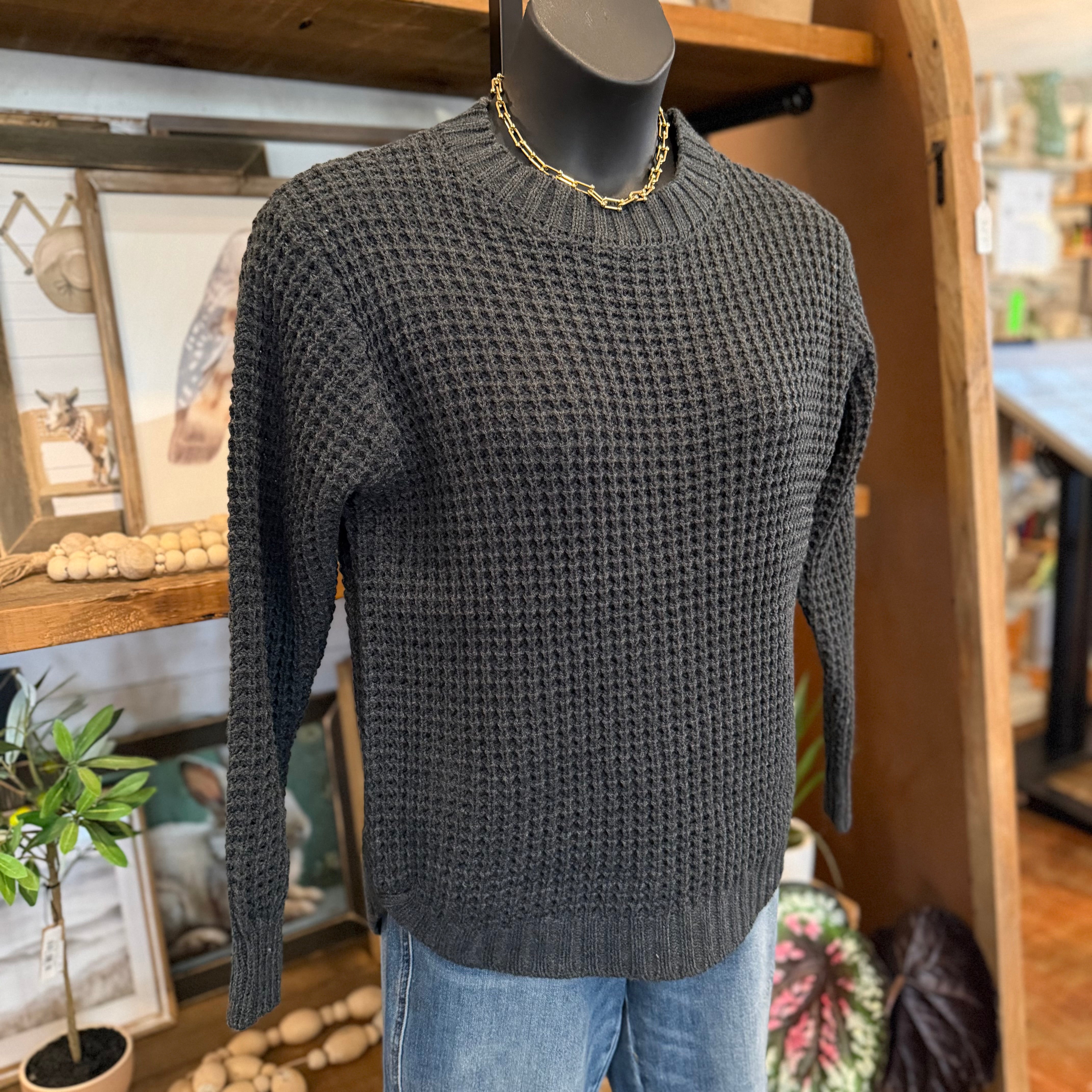 Hi-low Long Sleeve Round Neck Waffle Sweater | Charcoal