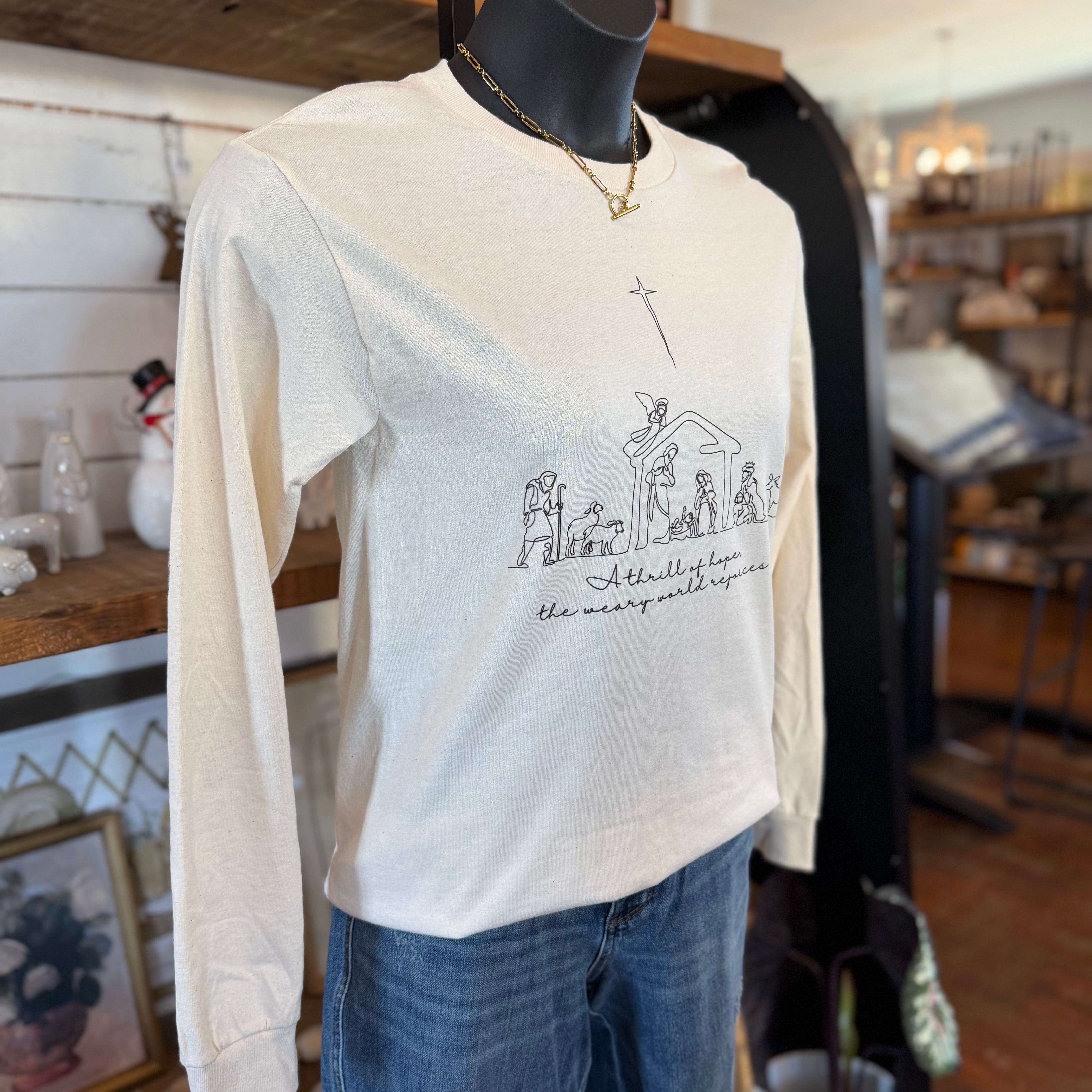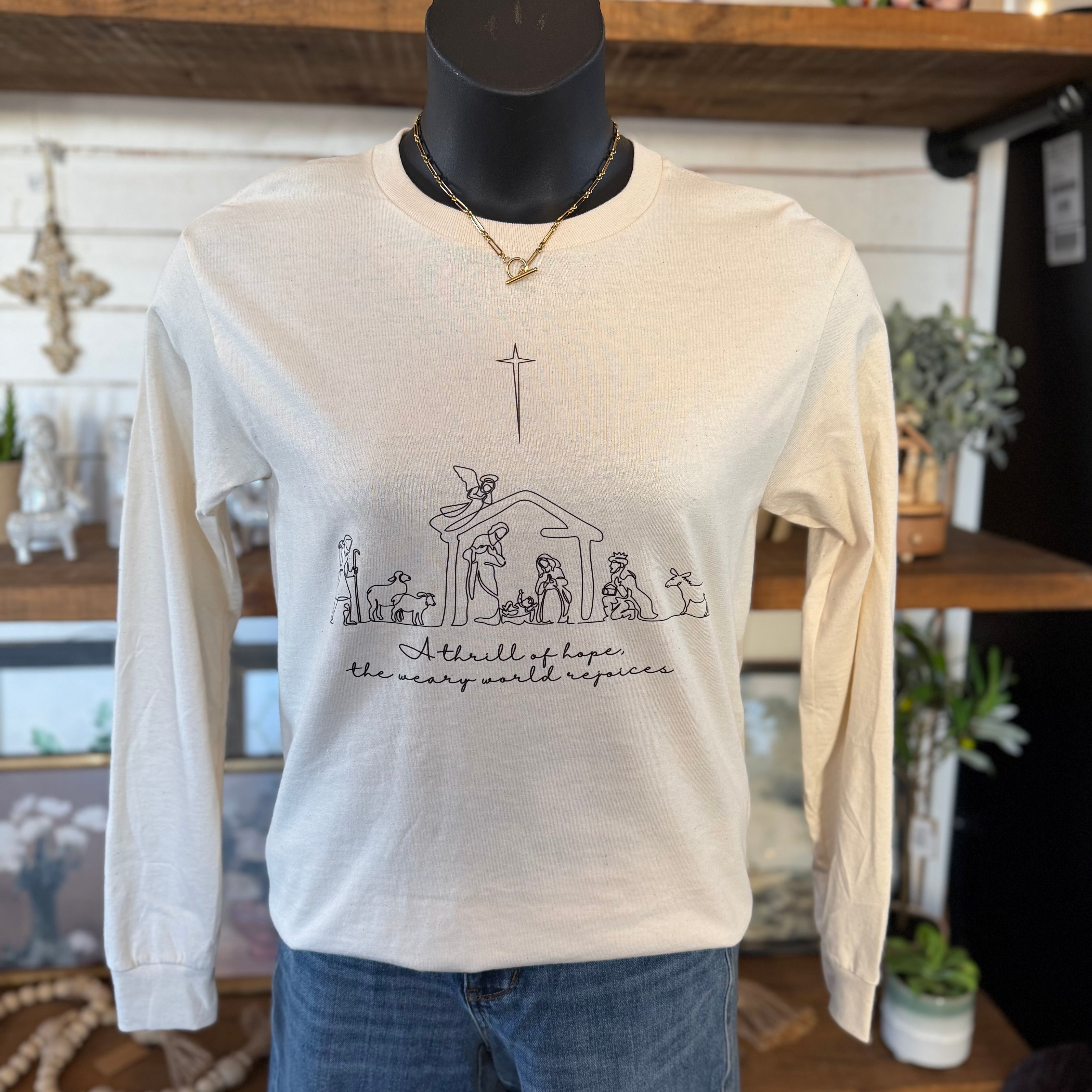 Get ready to feel the thrill of hope with our A Thrill of Hope Long Sleeve Top! This natural colored top features long sleeves, perfect for cooler weather.