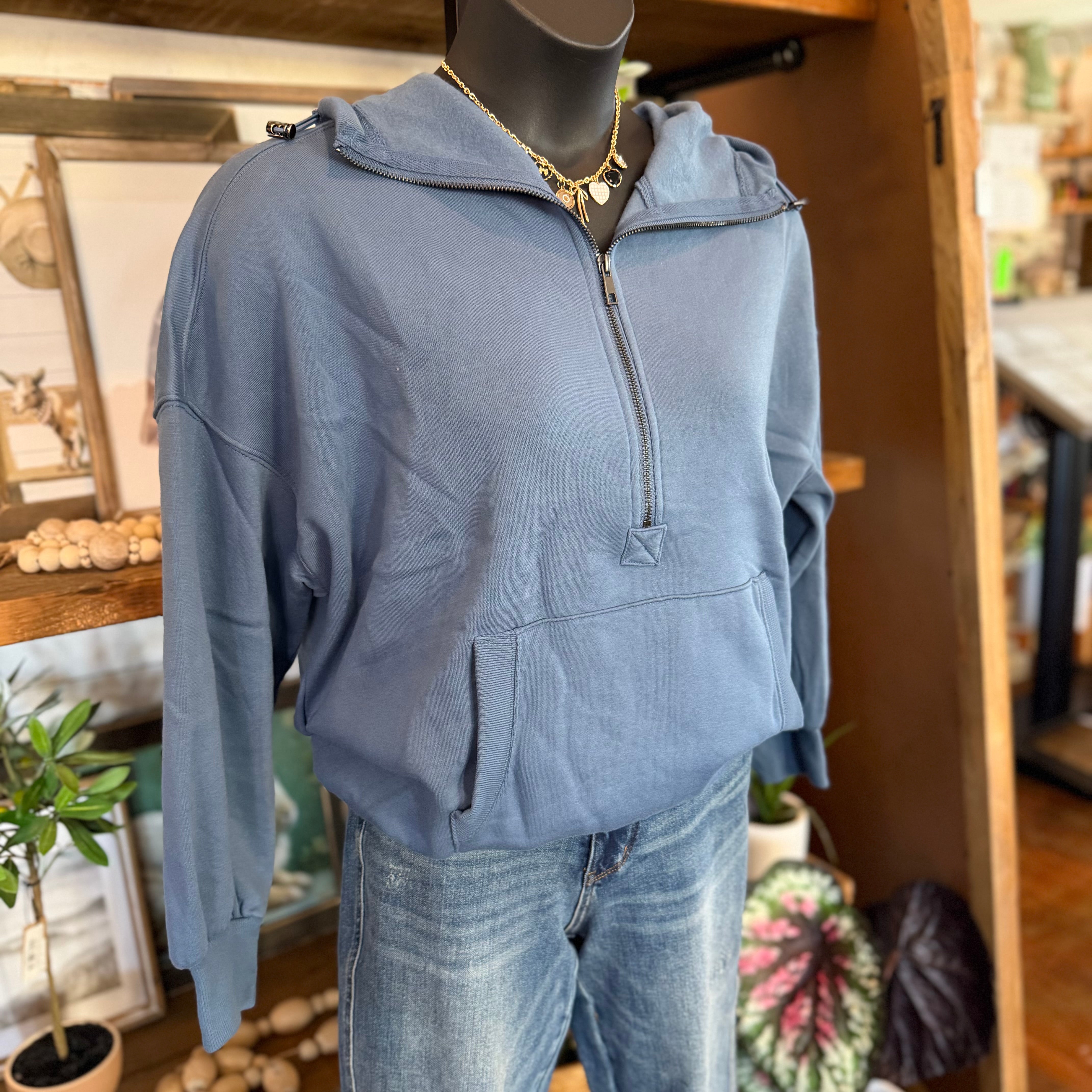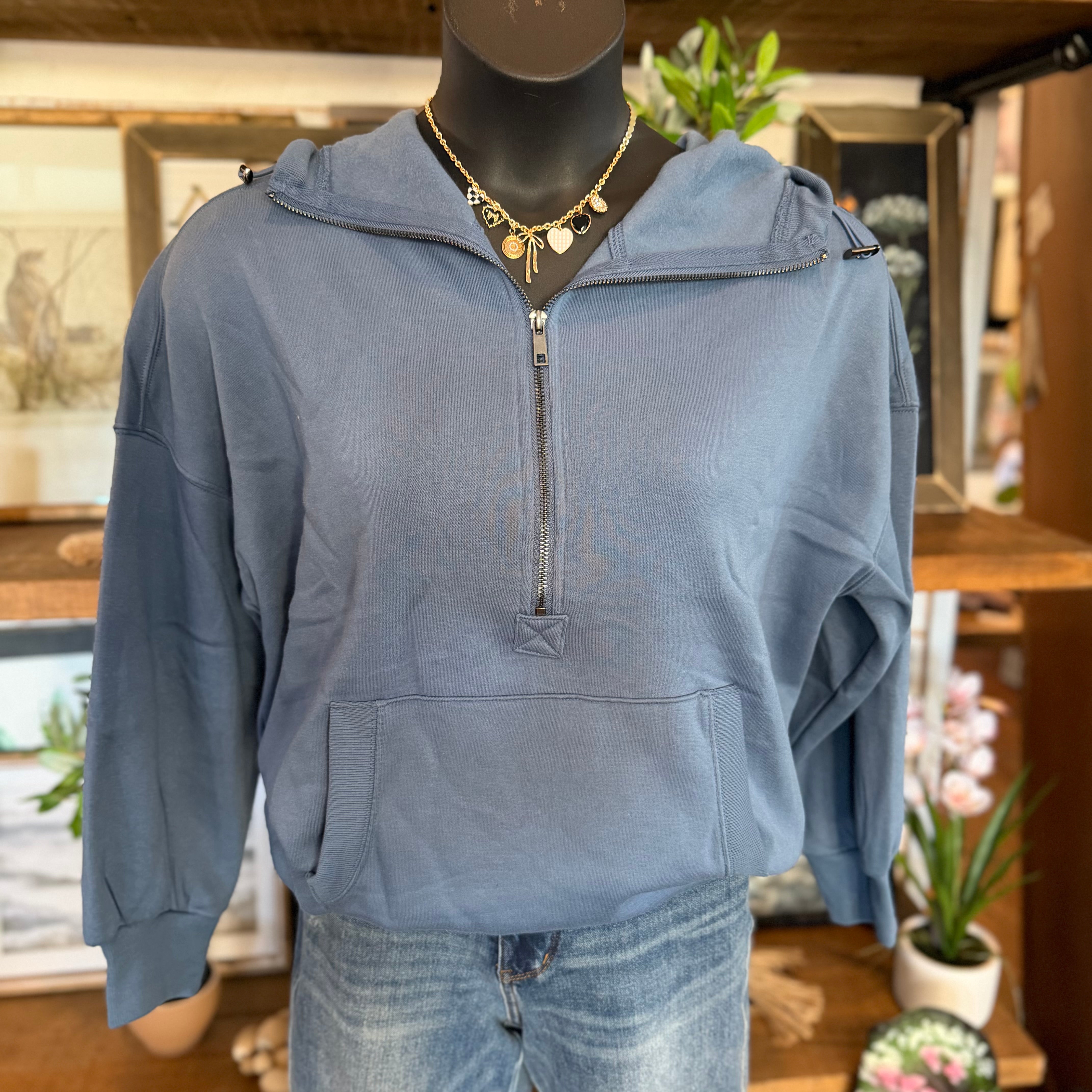 - Introducing our Fleece Elastic Hem Half Zip Kangaroo Pocket Hoodie in Dusty Blue