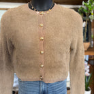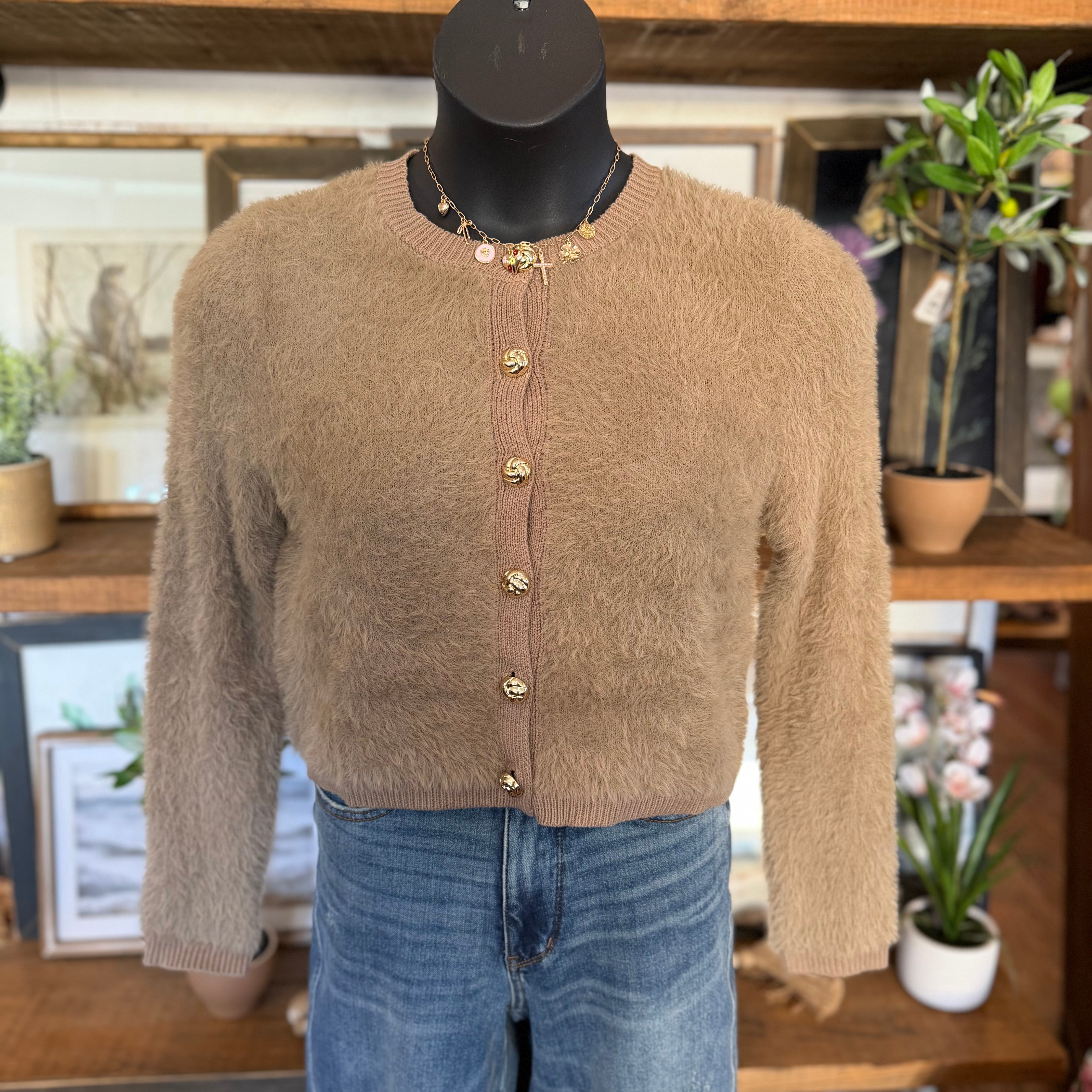 Gold Button Down Fuzzy Knit Cardigan | Light Mocha