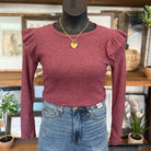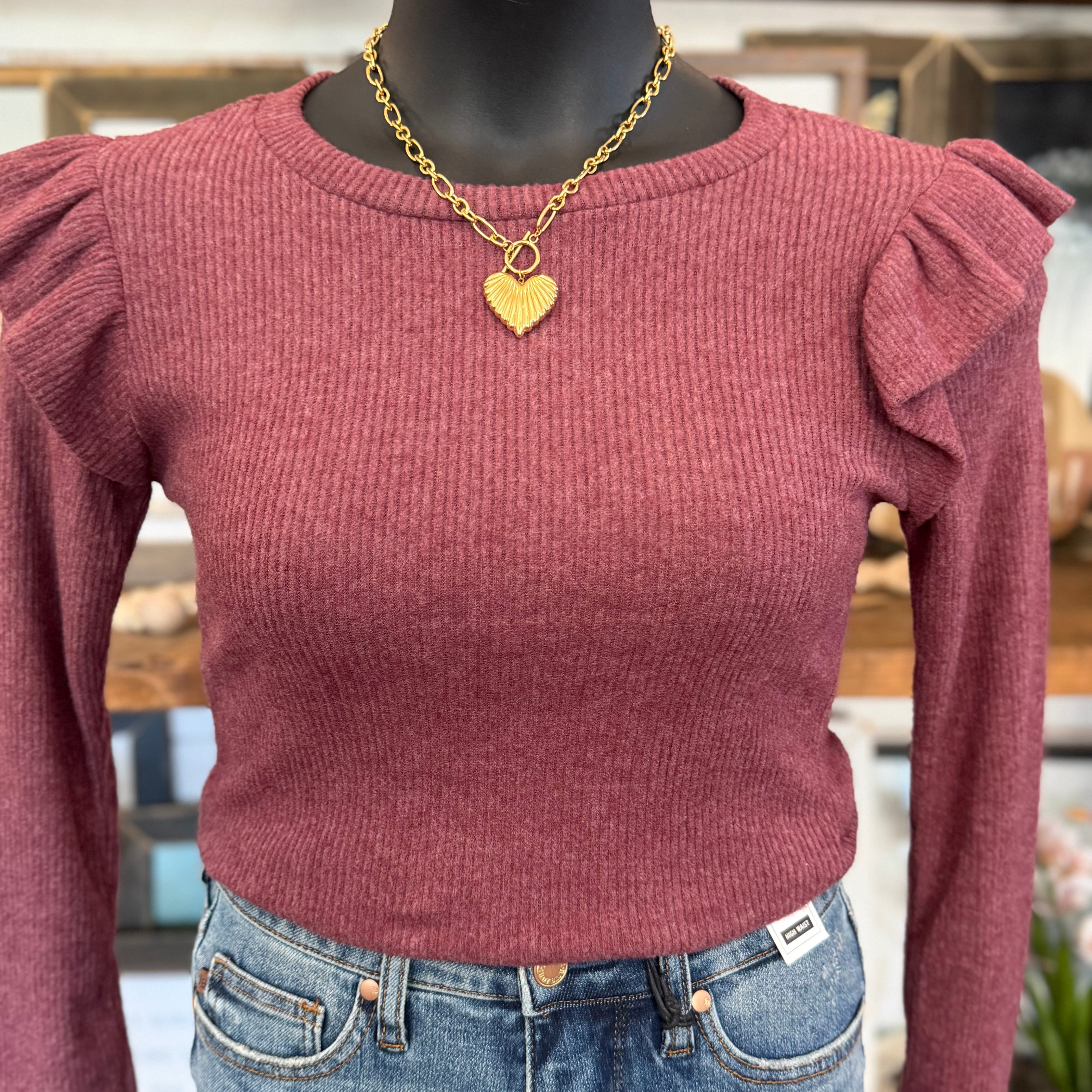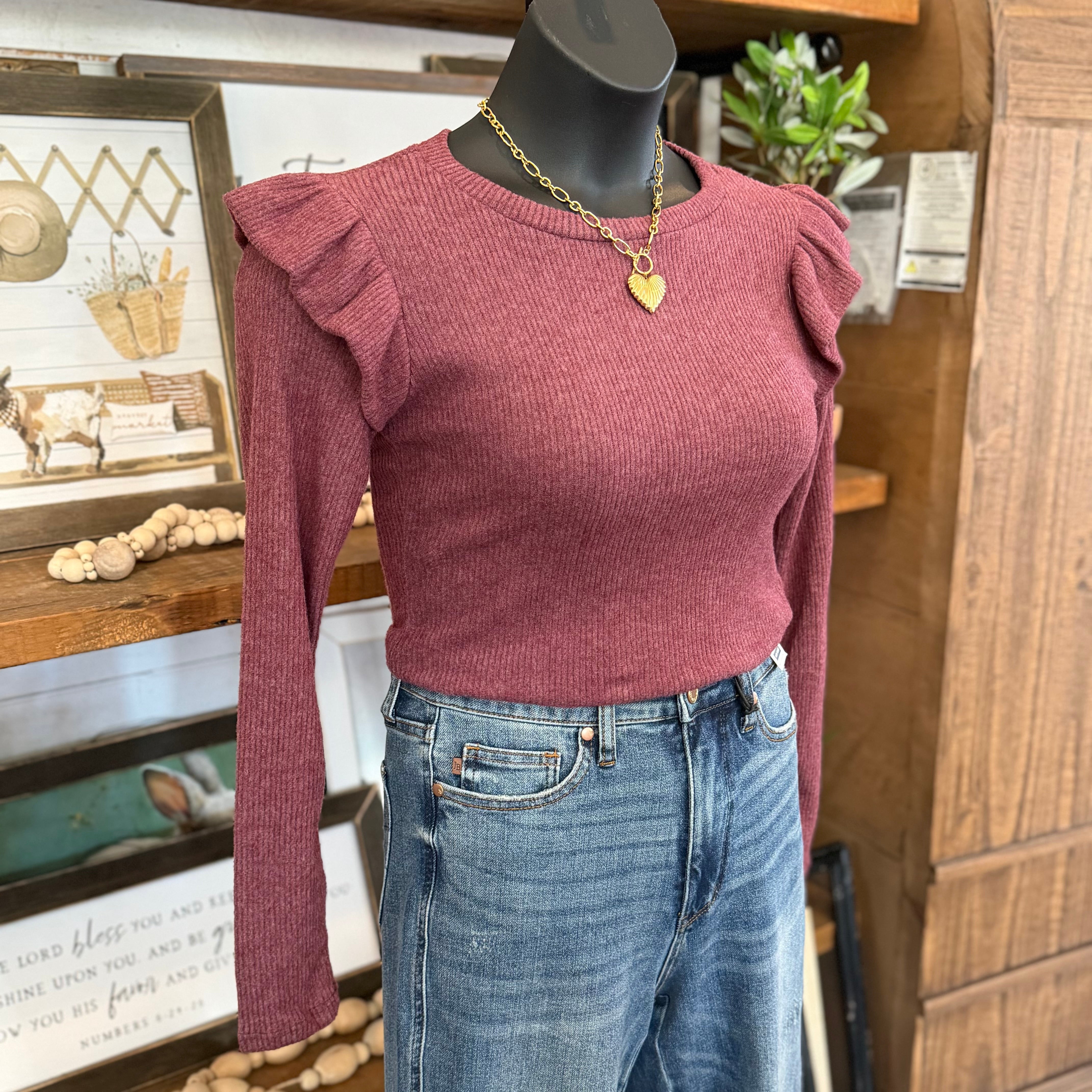 Long Sleeve Ruffle Shoulder Bodysuit | Wine