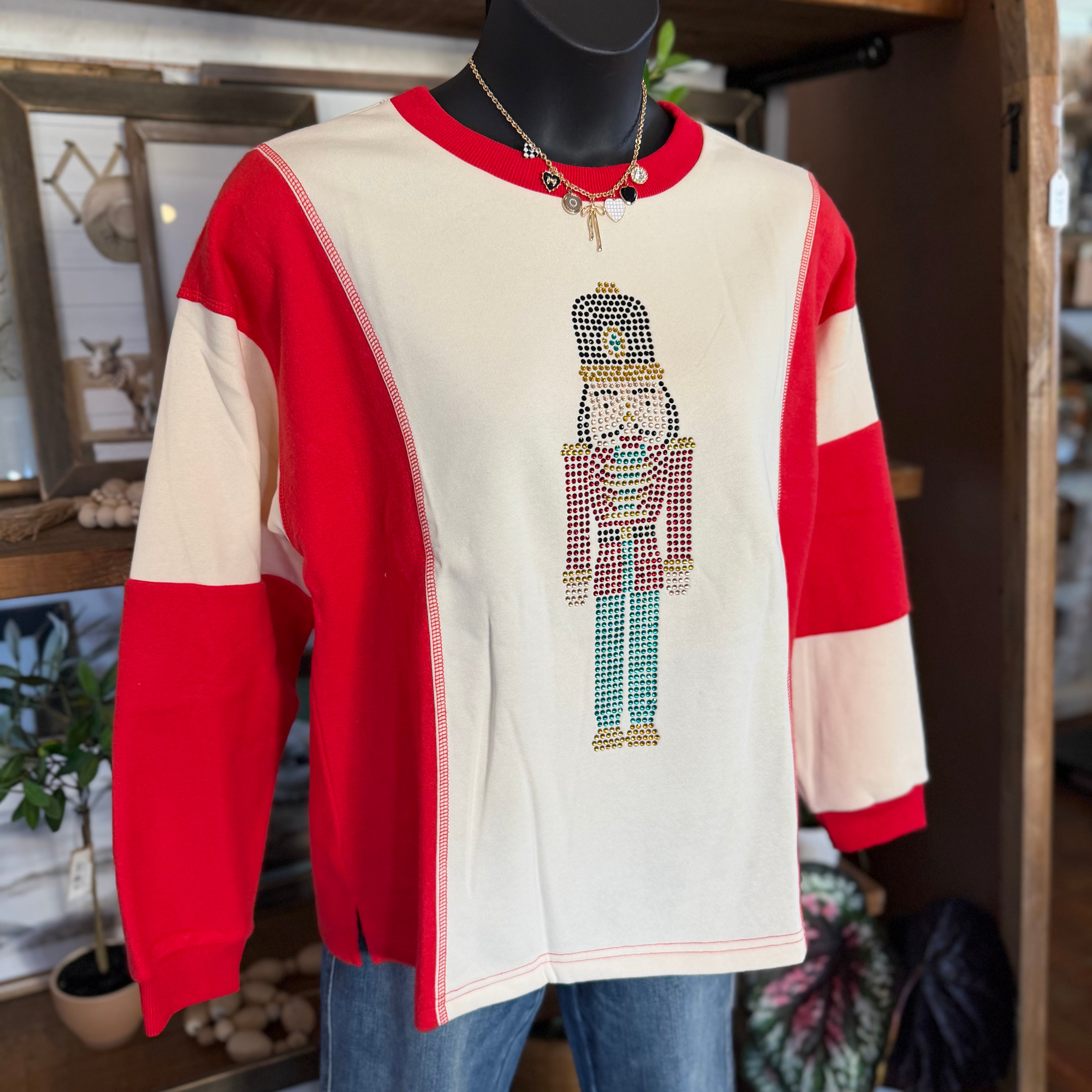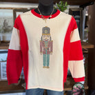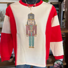 • This cream and red color block sweatshirt features intricate nutcracker embellishments, adding a playful and festive touch to your outfit