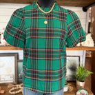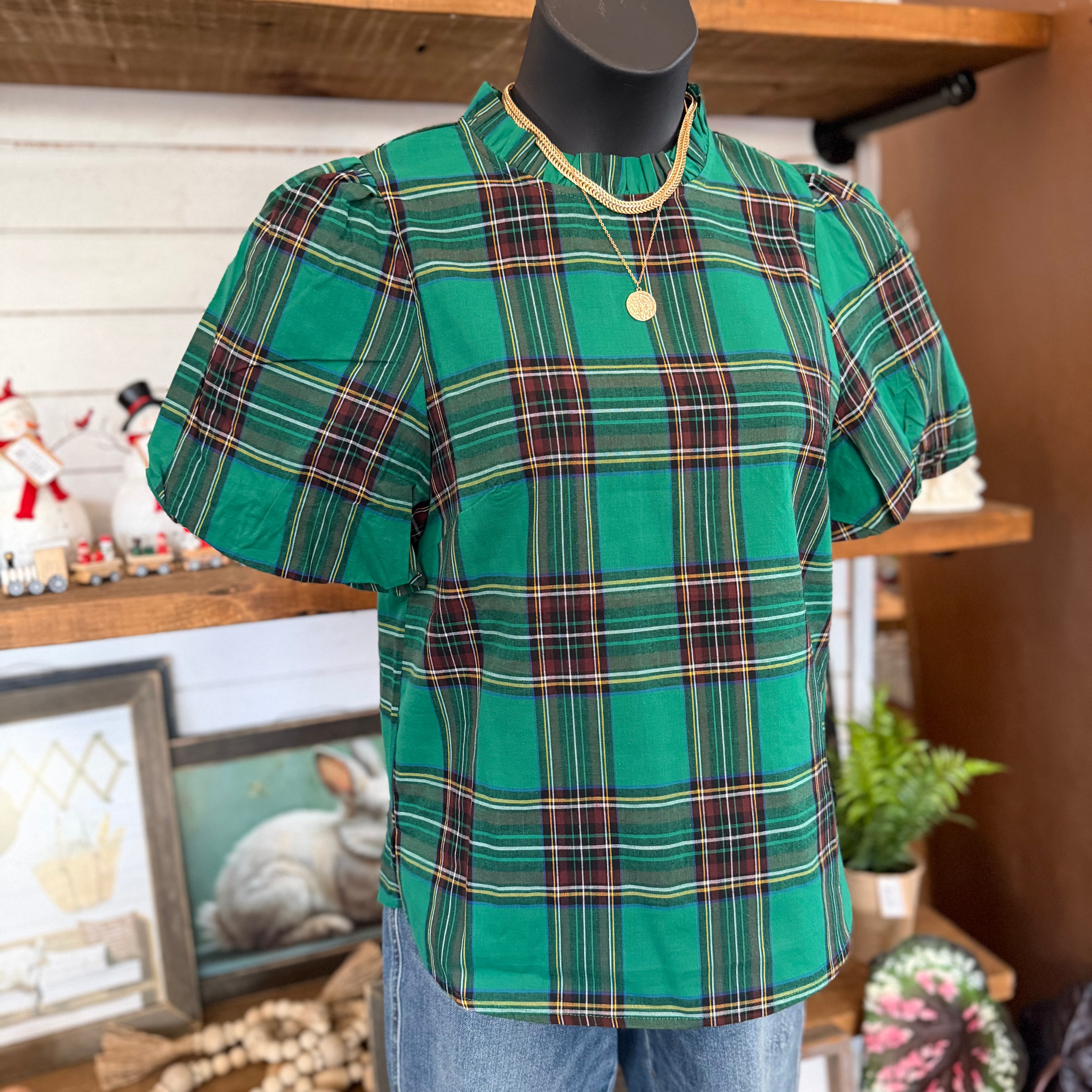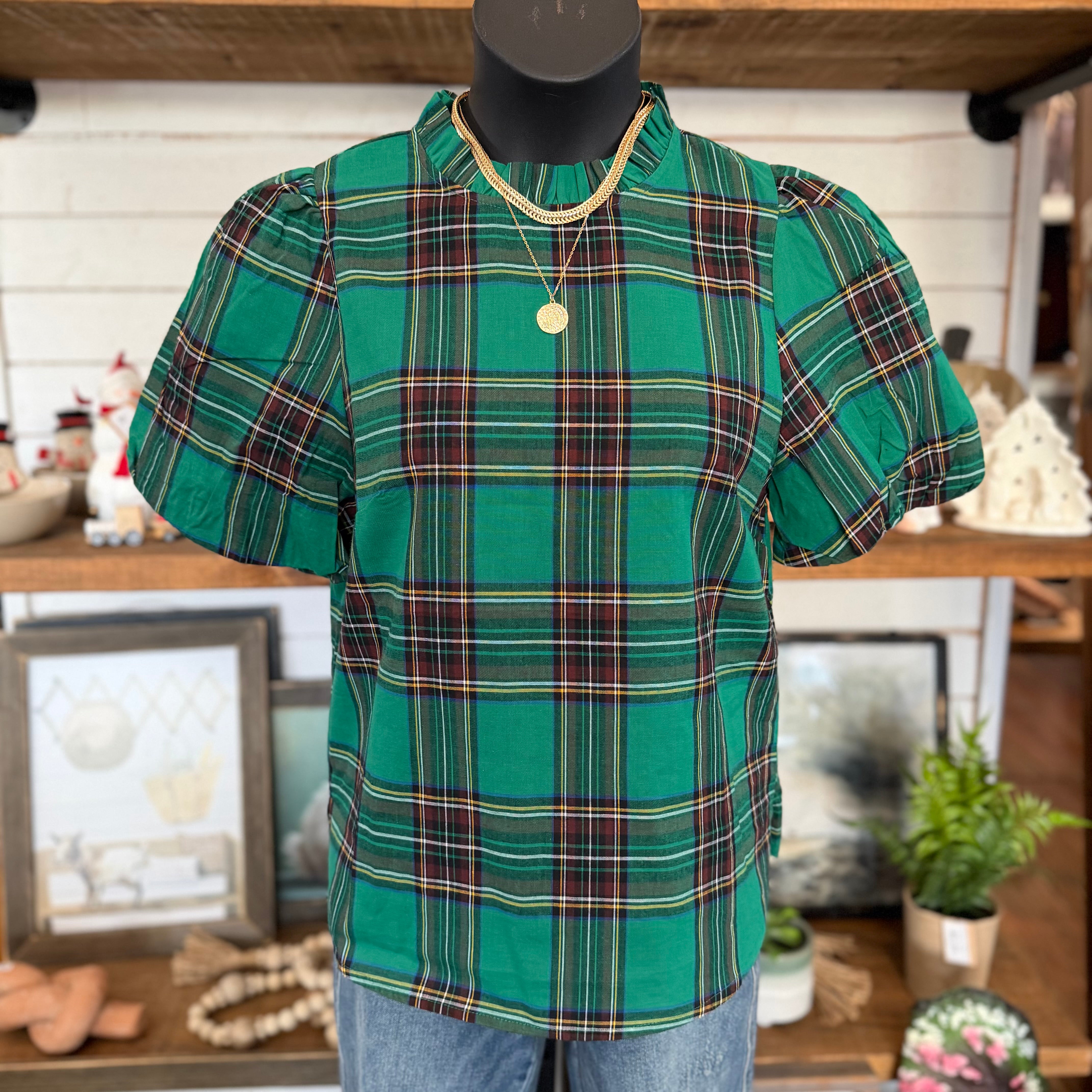 - Elevate your style with our Plaid Ruffle Mock Neck Bubble Sleeve Blouse in Green Combo