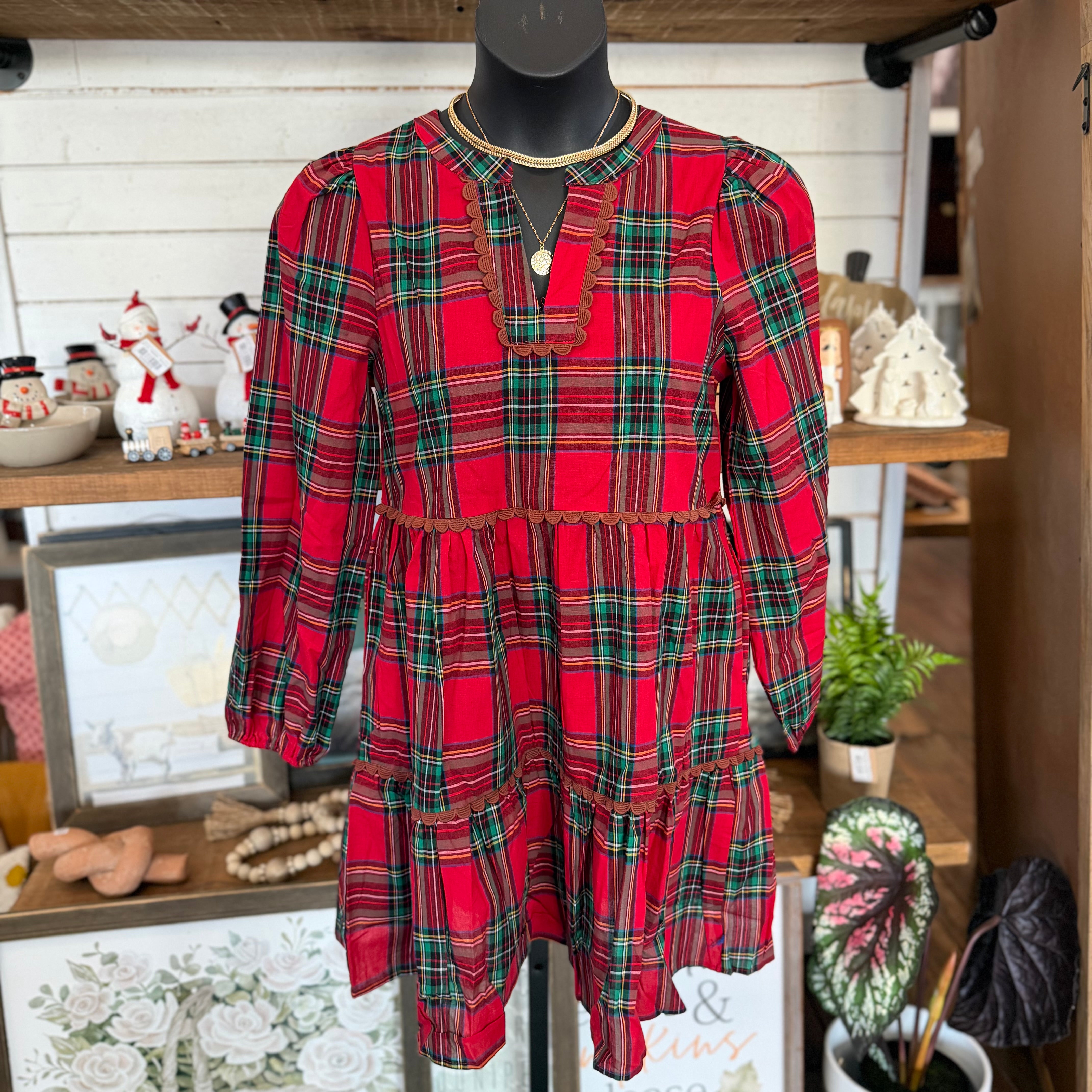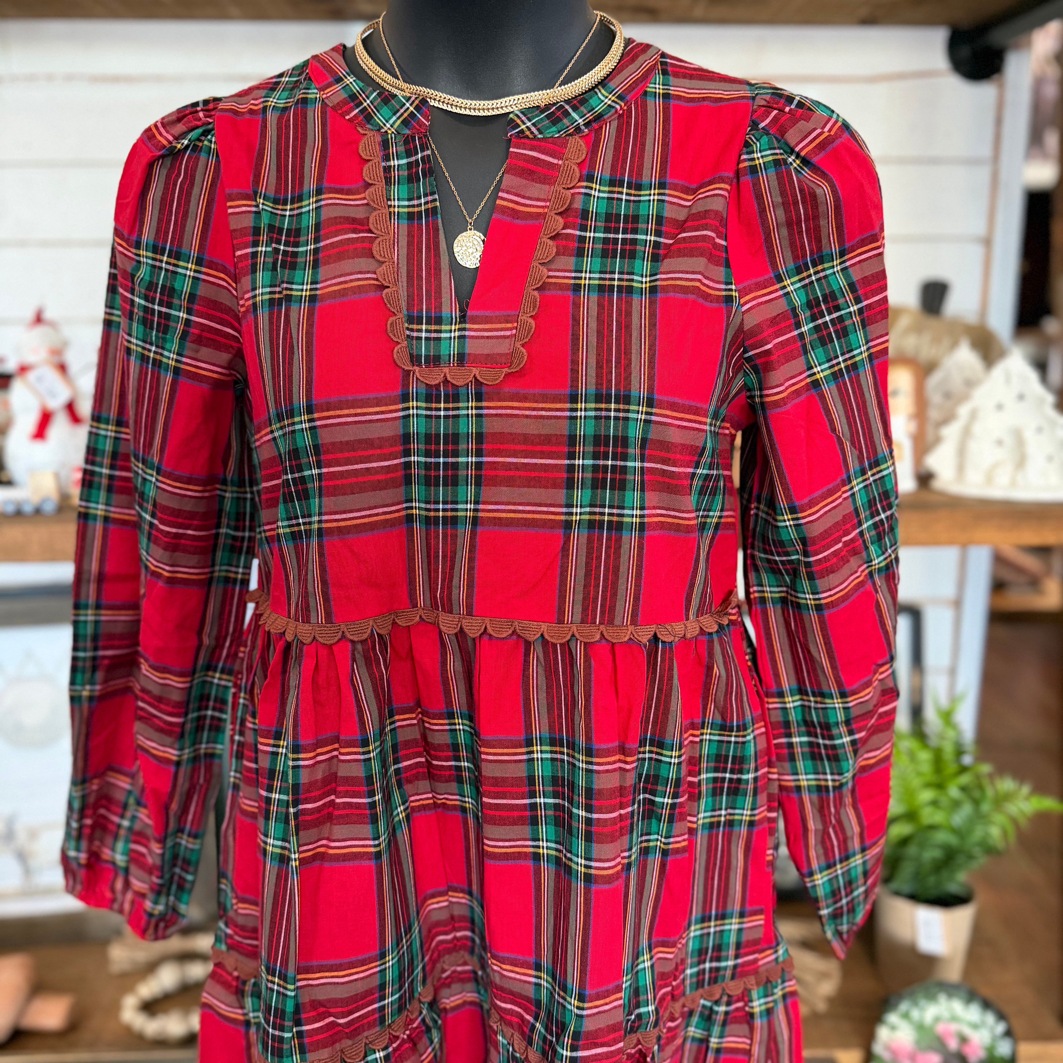 Plaid Scallop Trim Detail Babydoll Mini Dress | Red