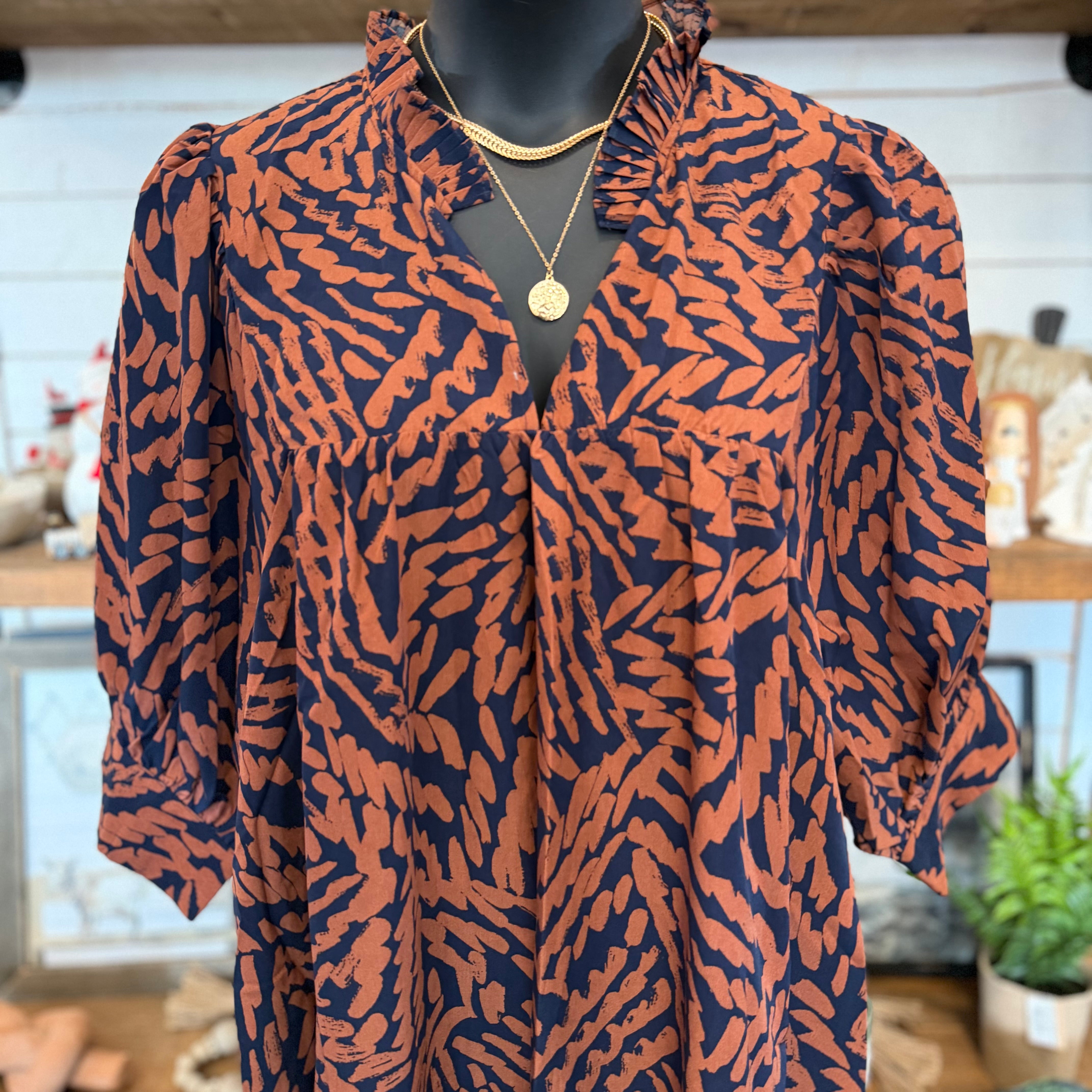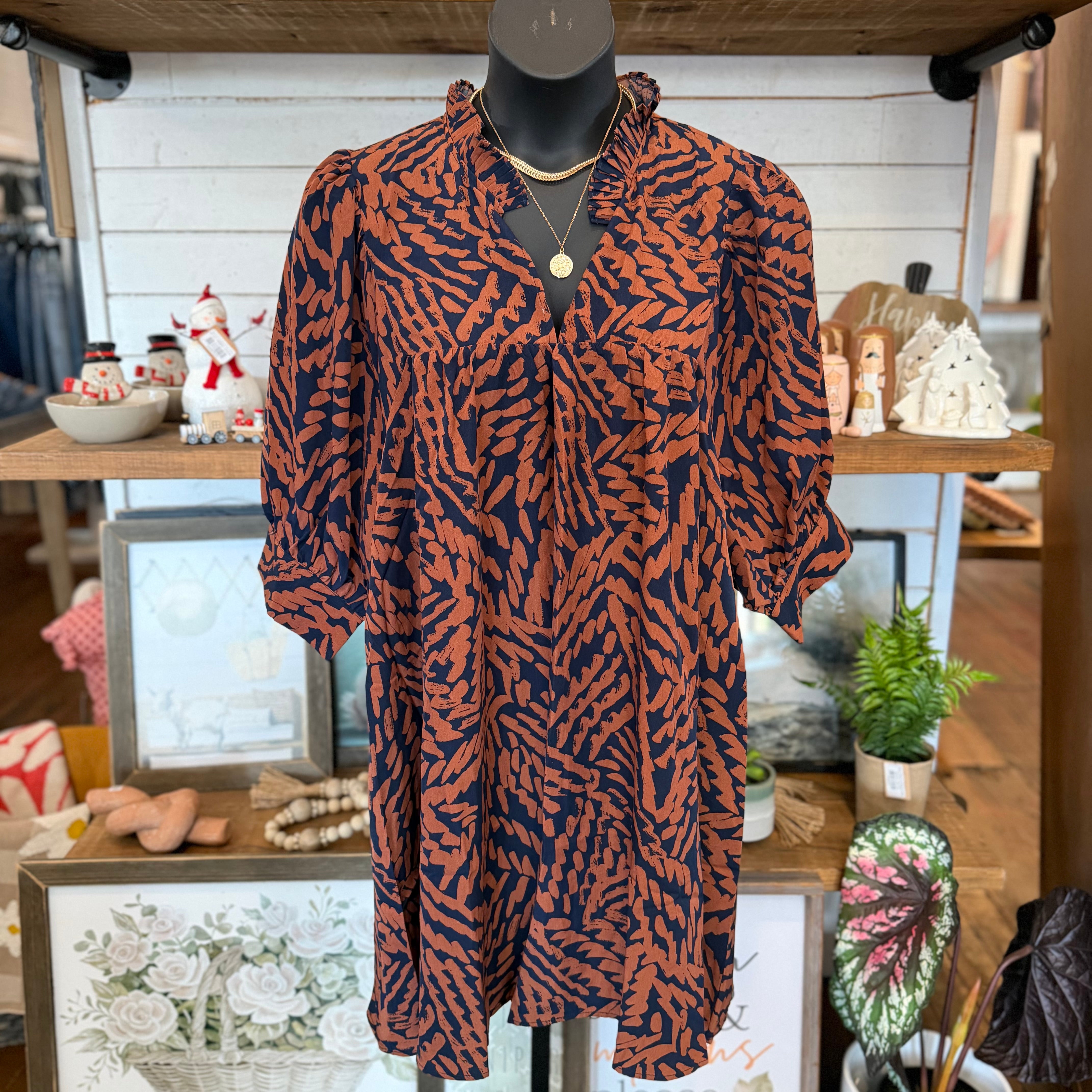 - This Plus Abstract Print Ruffle Neck Mini Dress features a unique abstract print and a flattering ruffle neck design