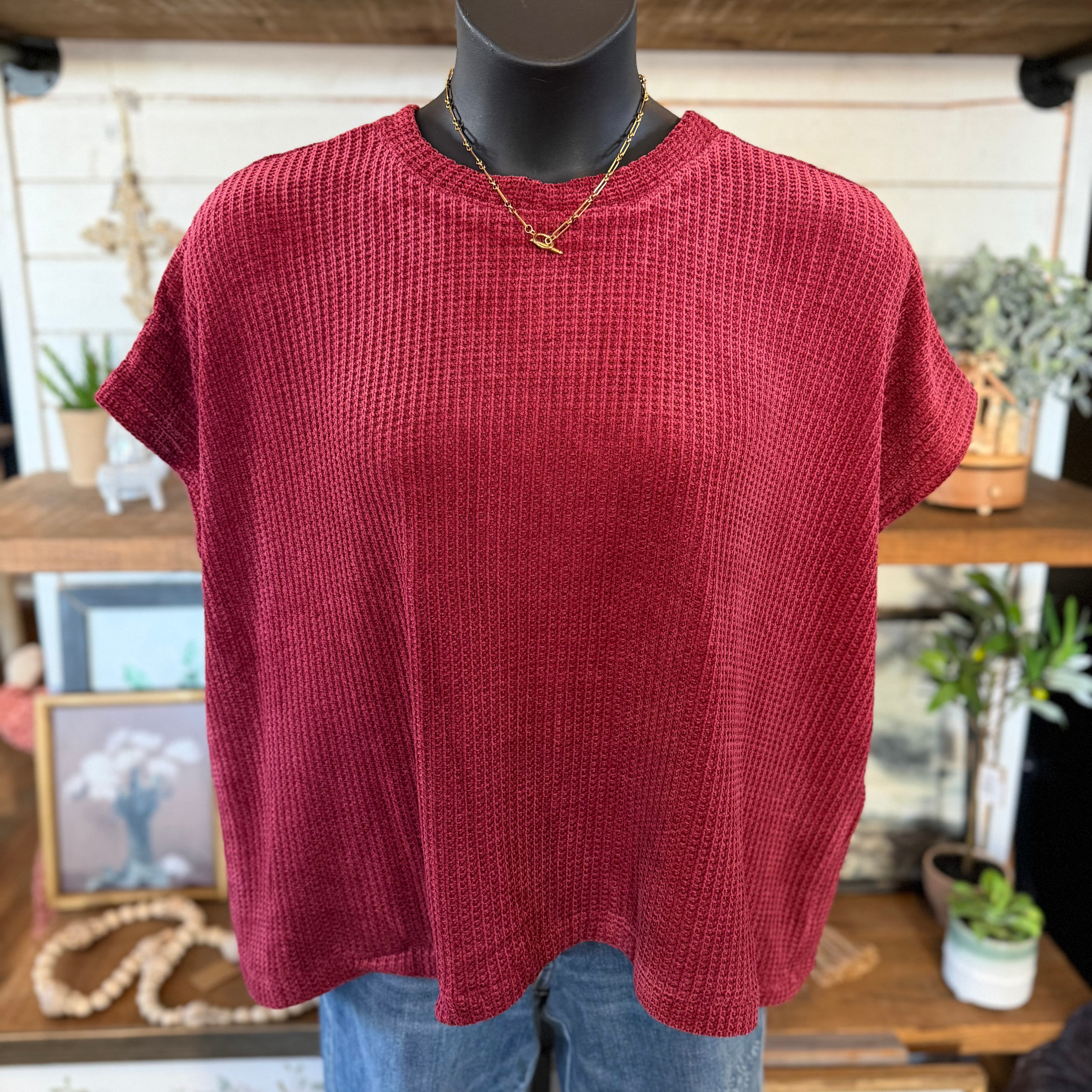 - Get cozy with our Plus Chenille Waffle Cap Sleeve Sweater in Dark Burgundy