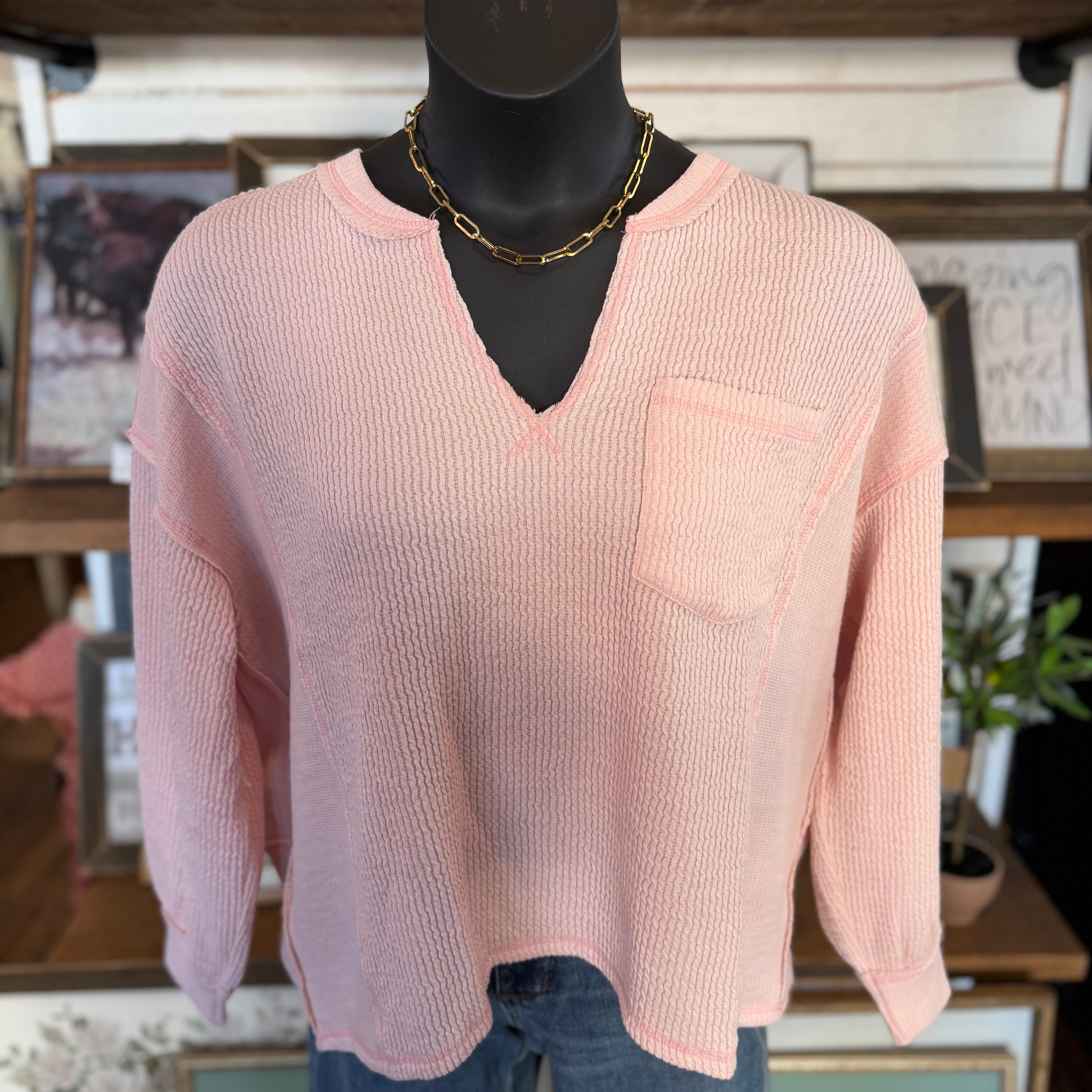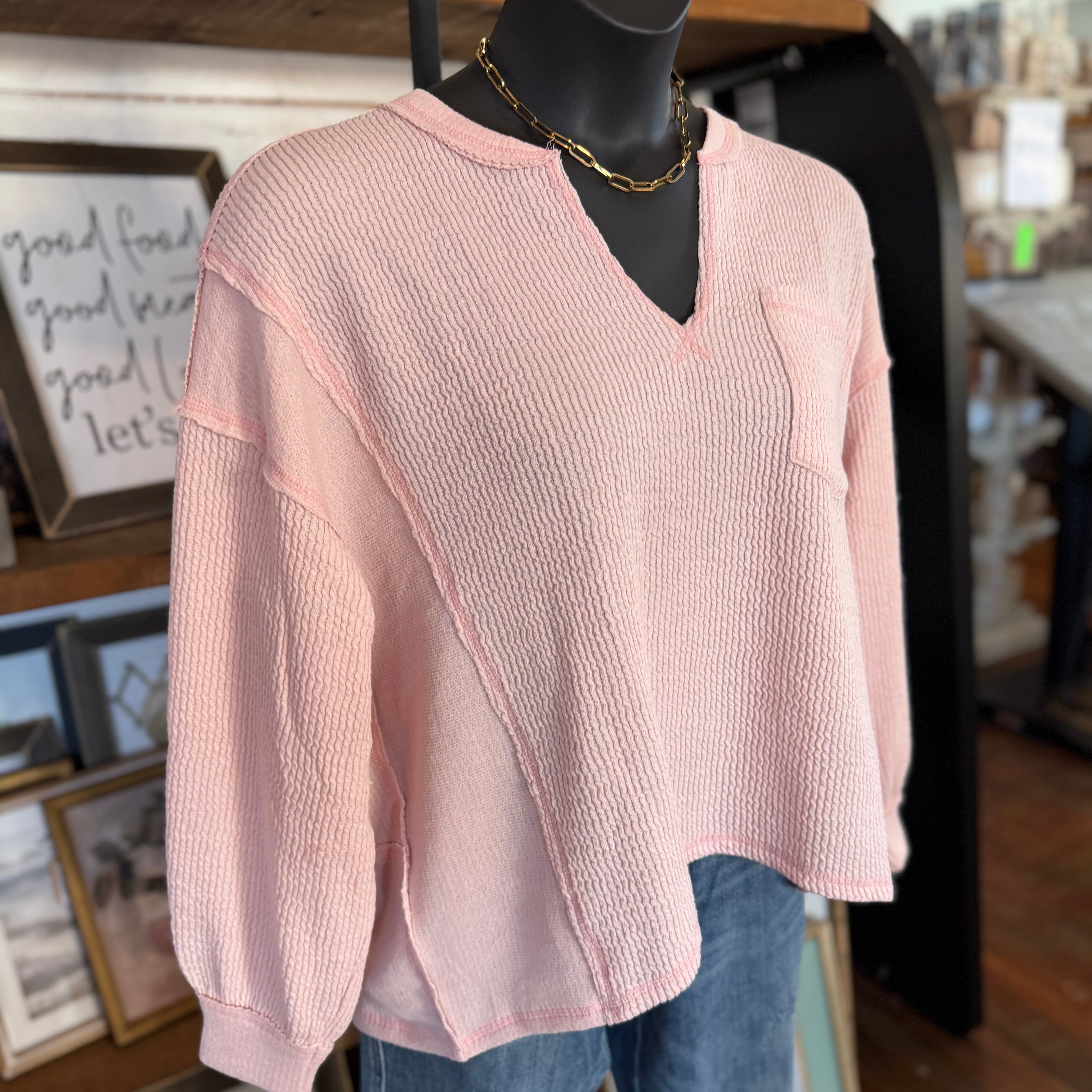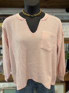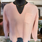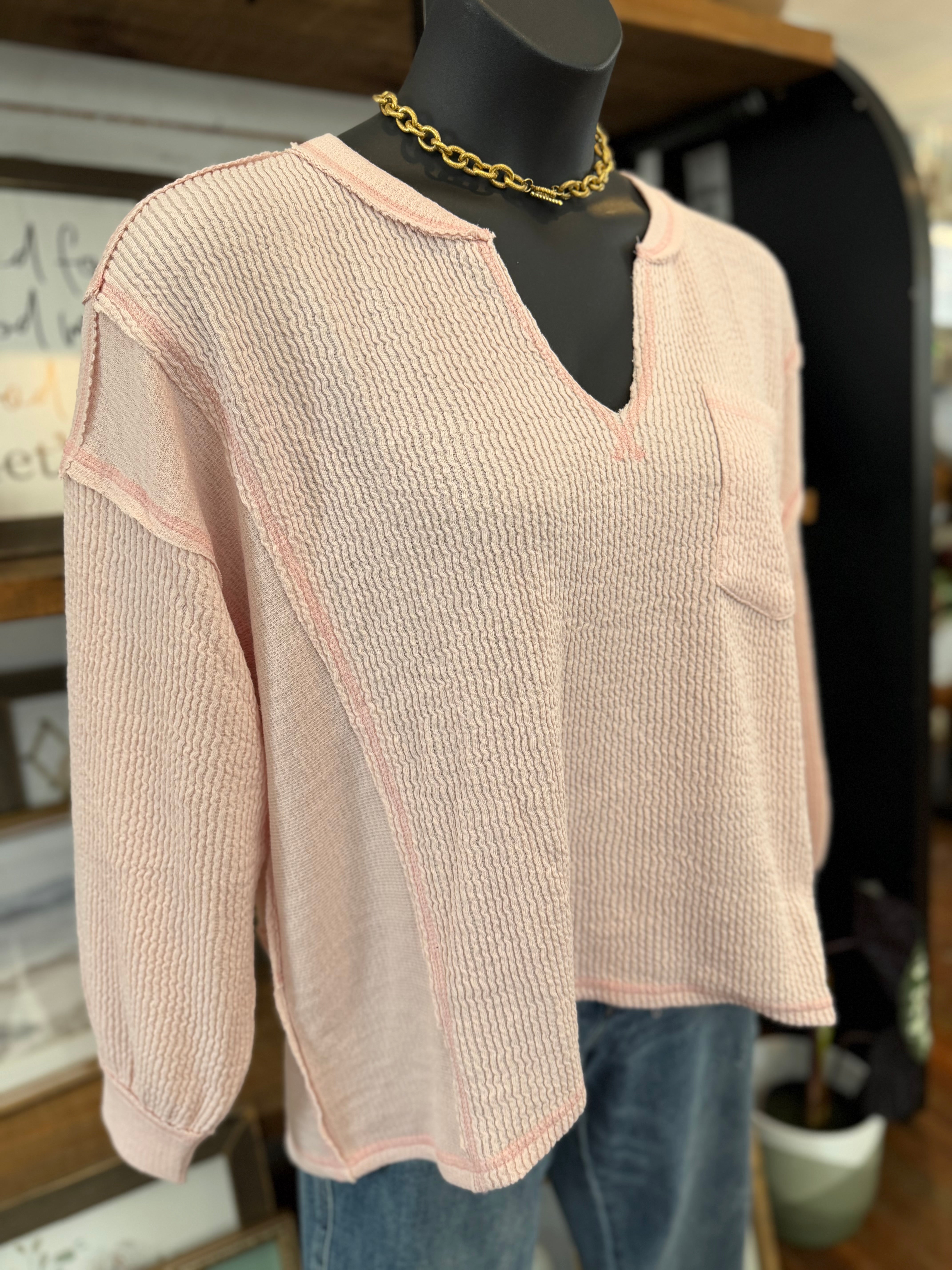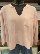 Split Neck Raw Edge Long Sleeve Ribbed Knit Top | Light Pink