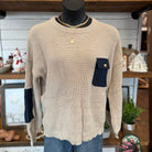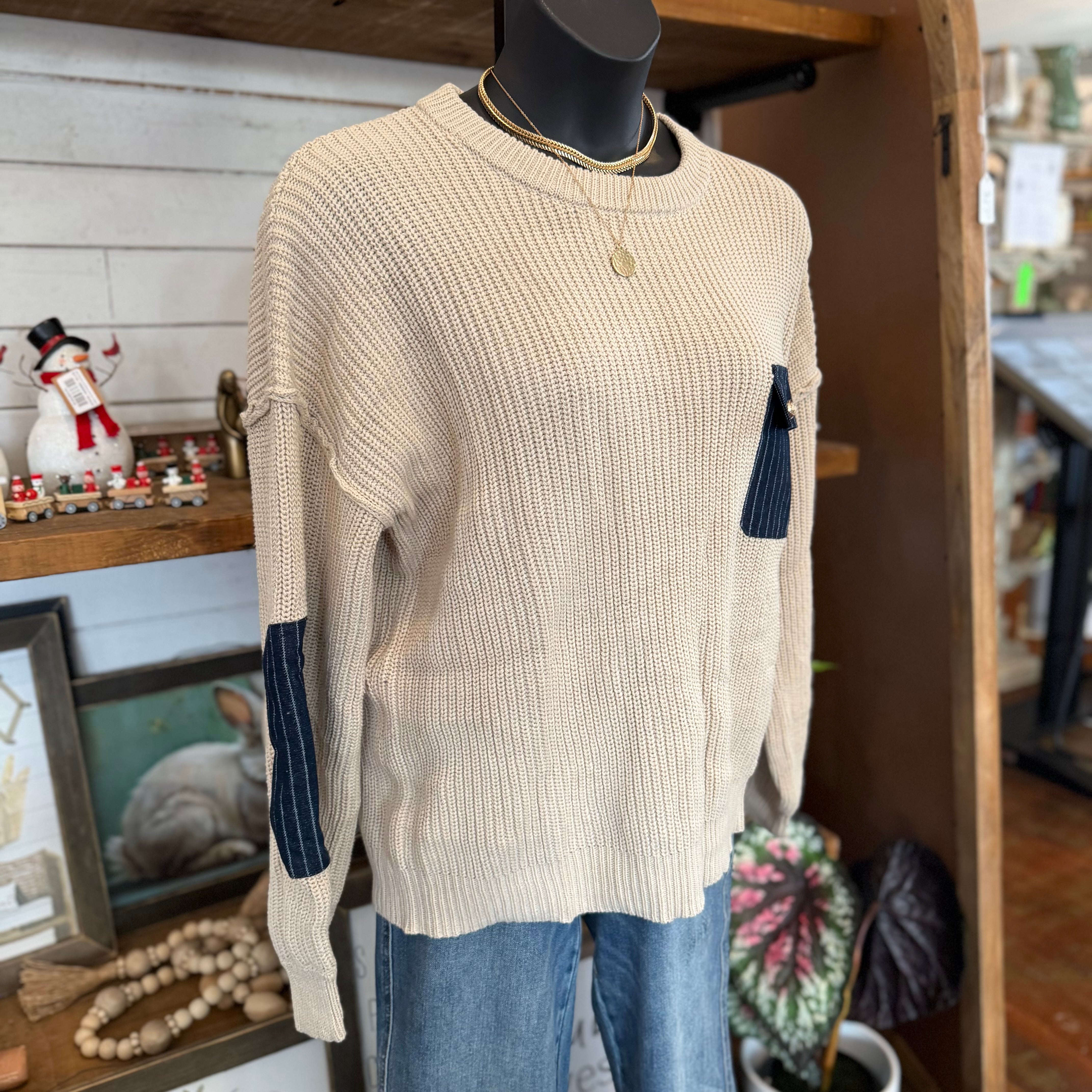 Striped Denim Patch Loose Fit Sweater|Oat/Denim